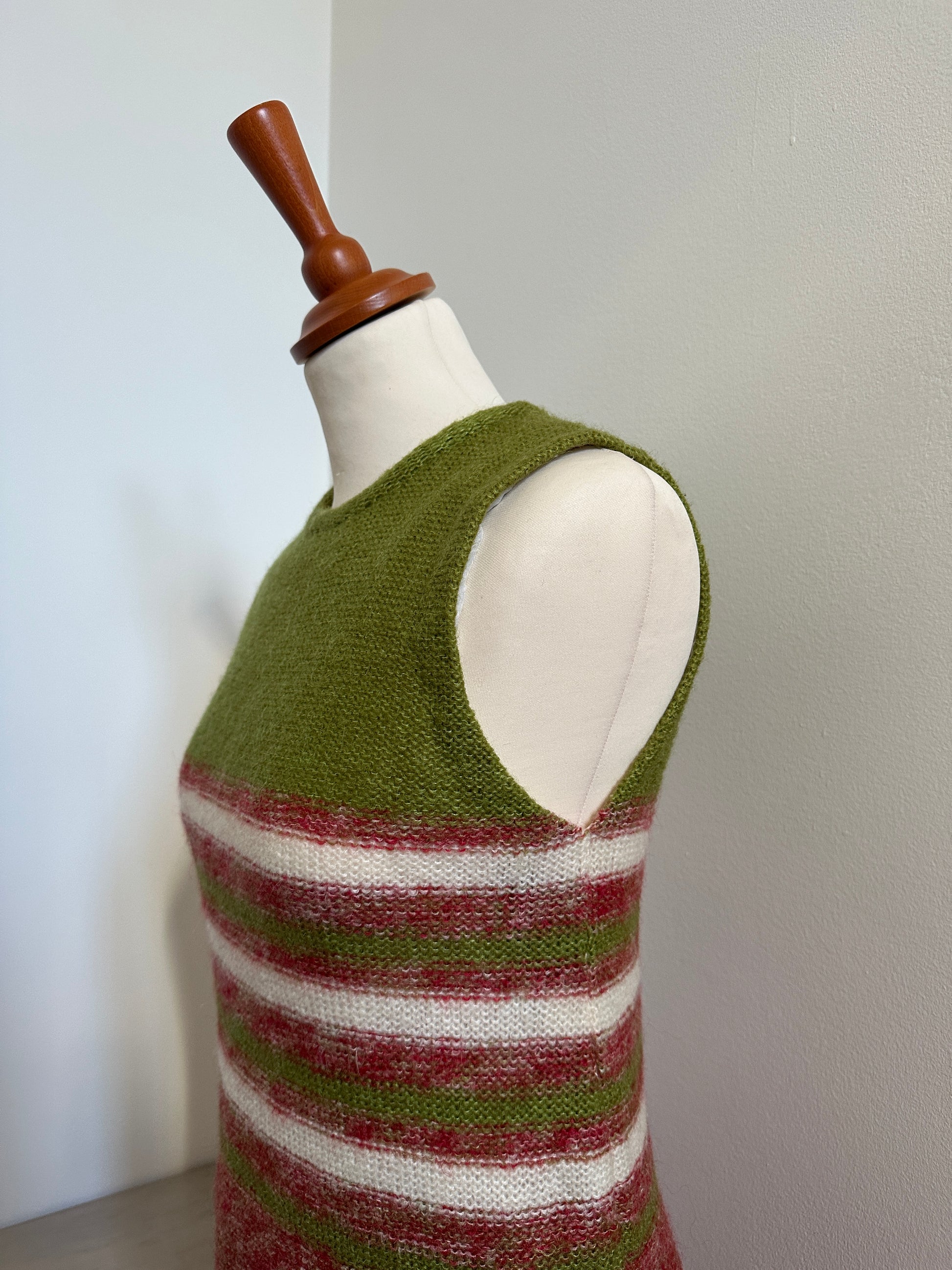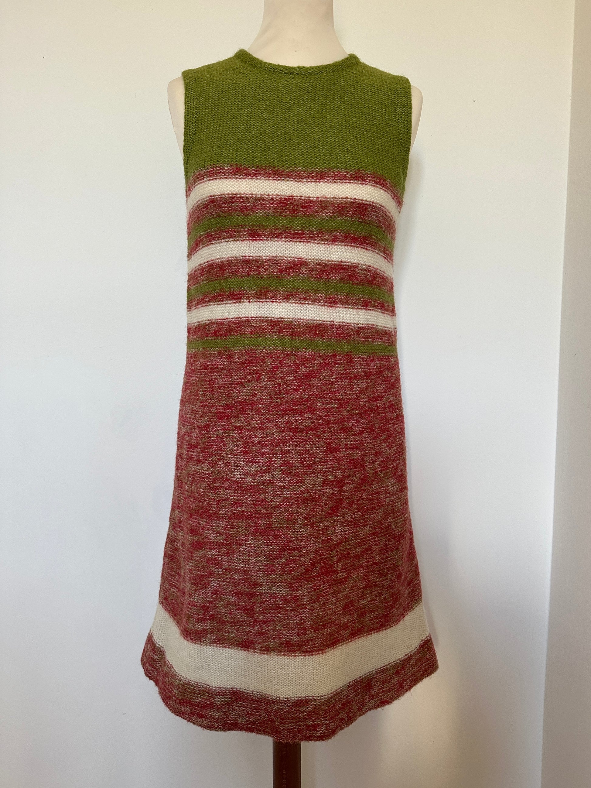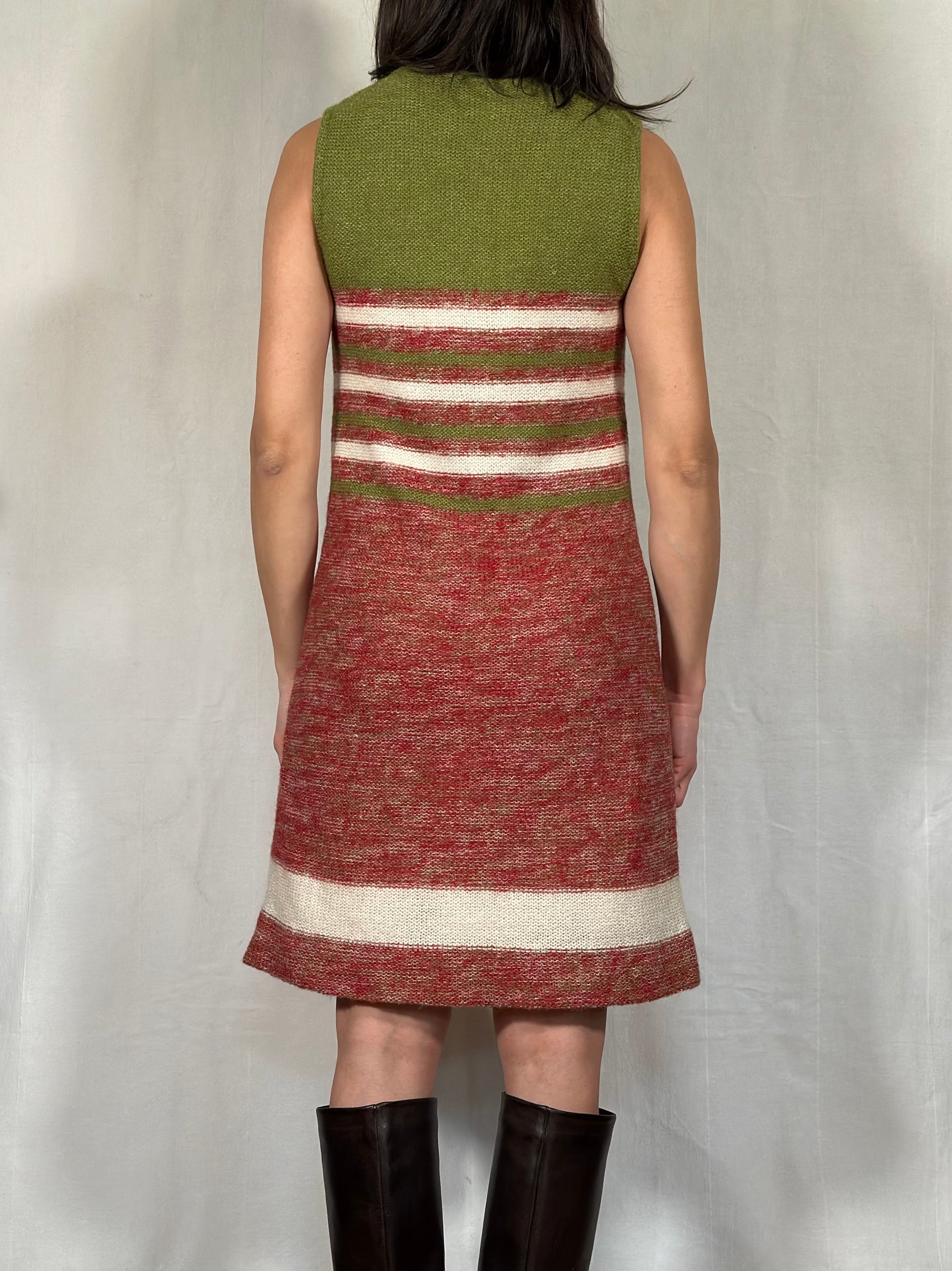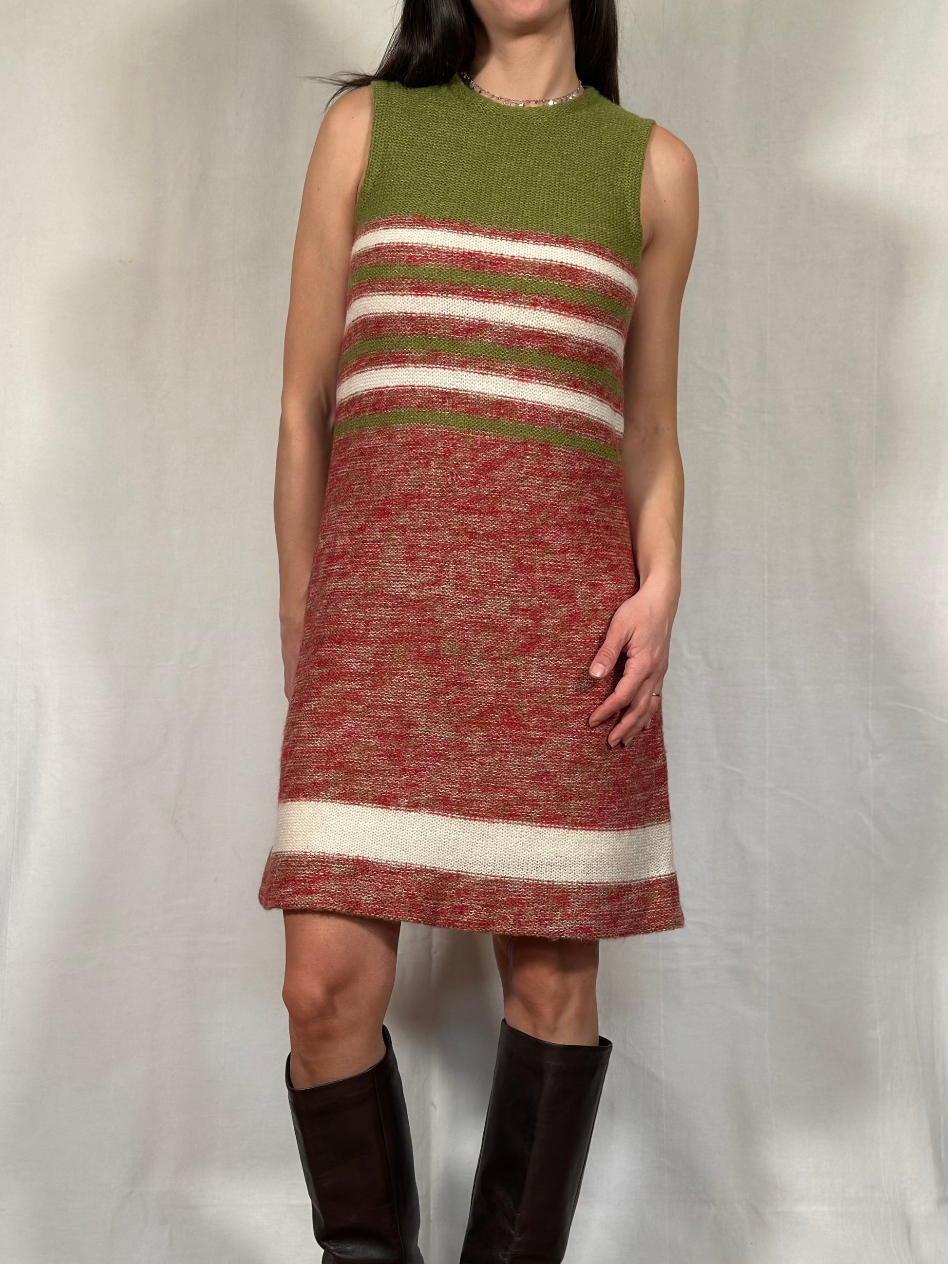 Stupendo vestito vintage sartoriale lavorato a maglia in morbida e calda lana rossa mélange, verde e panna, foderato.