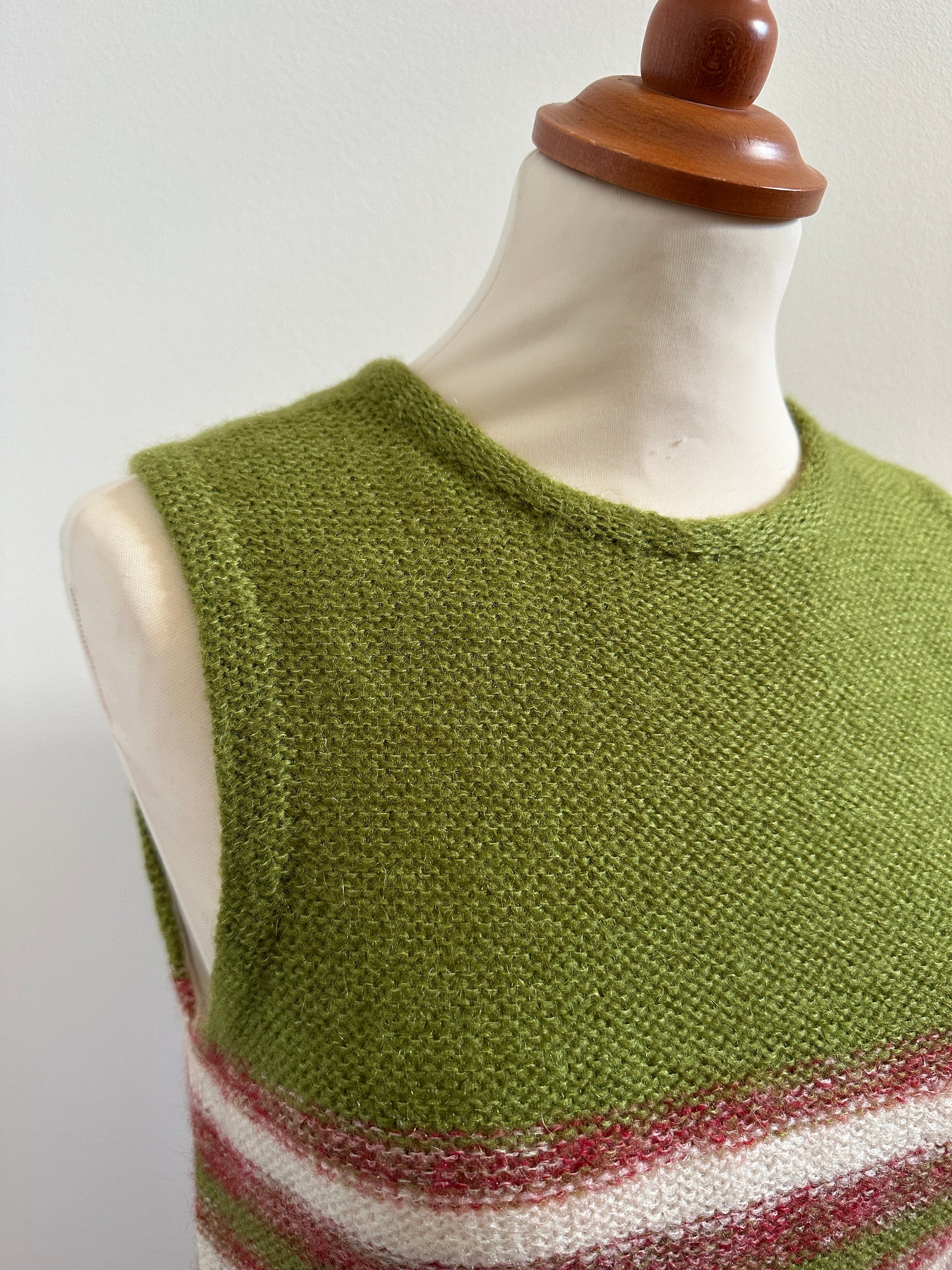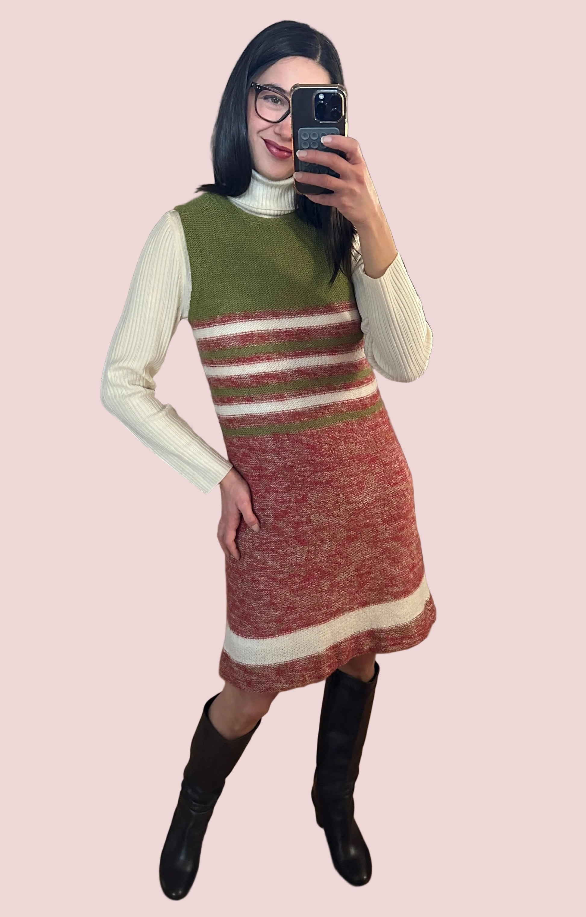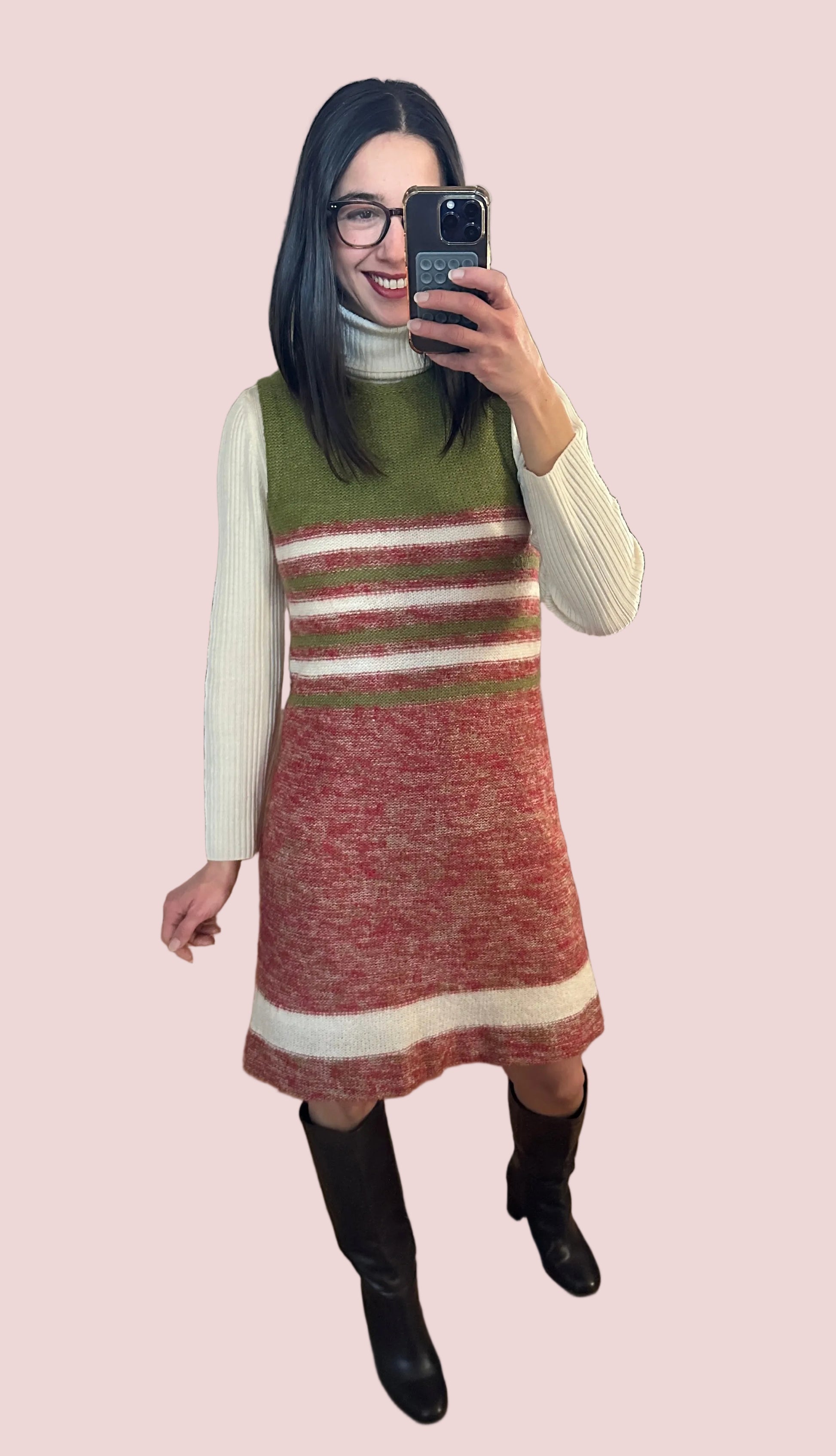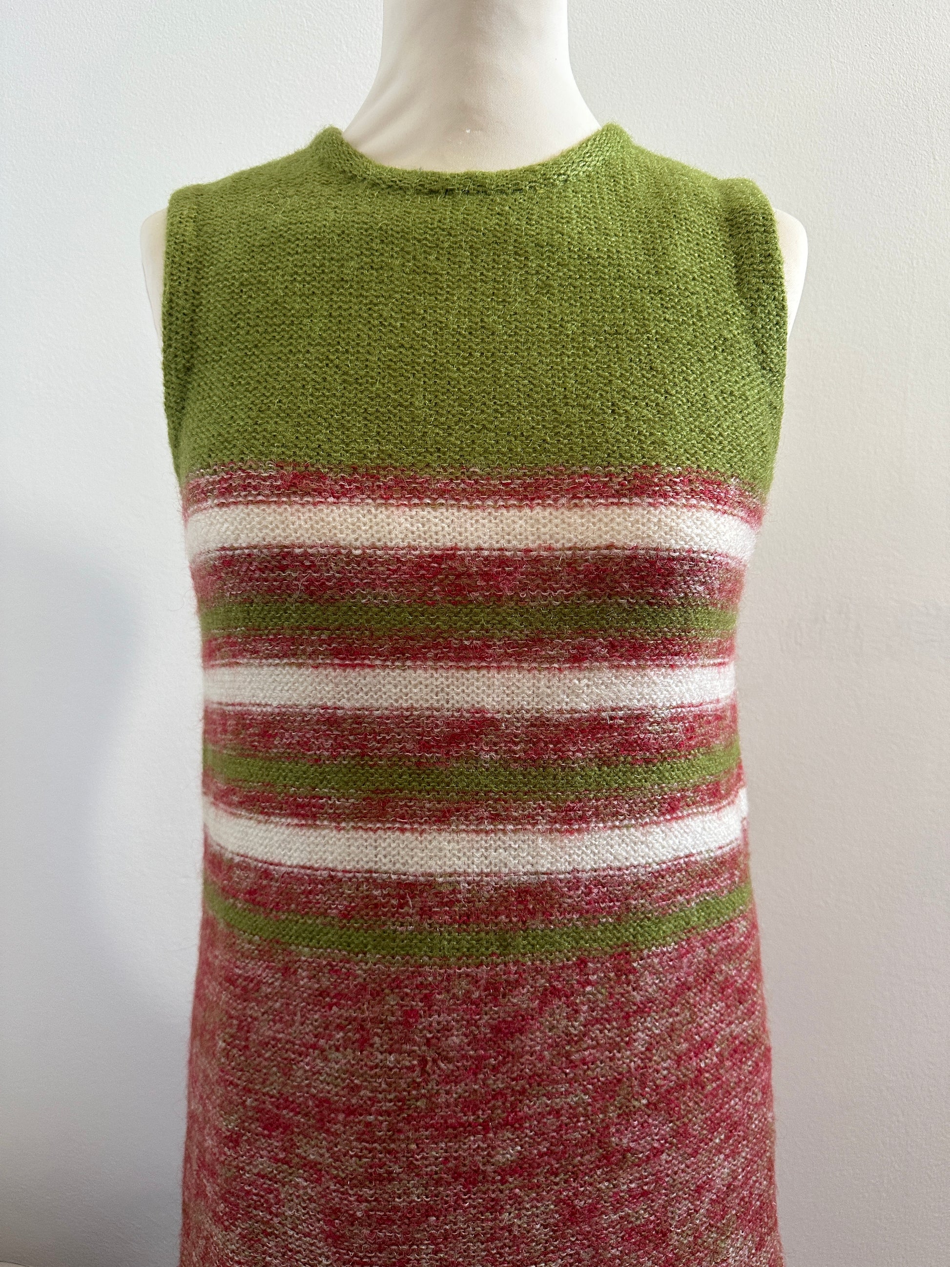 Stupendo vestito vintage sartoriale lavorato a maglia in morbida e calda lana rossa mélange, verde e panna, foderato.