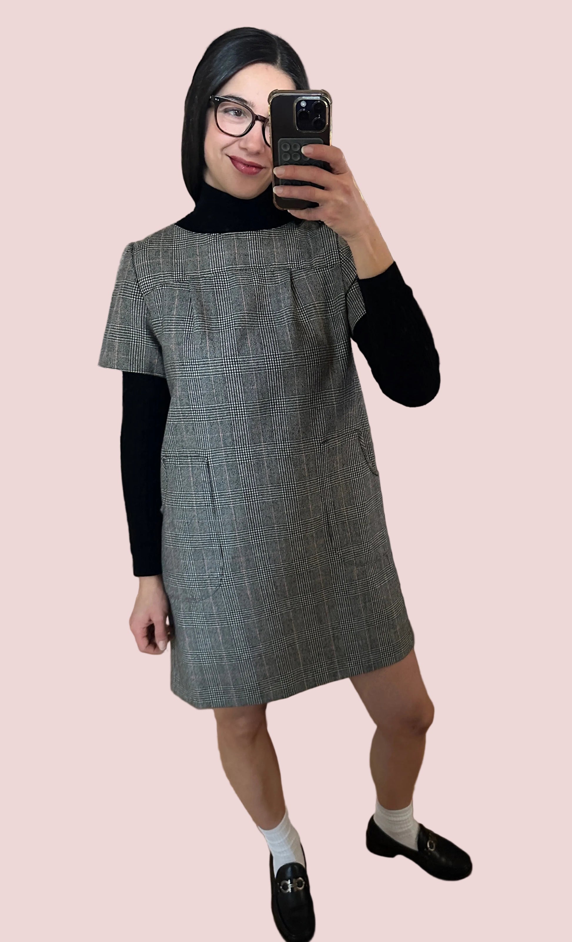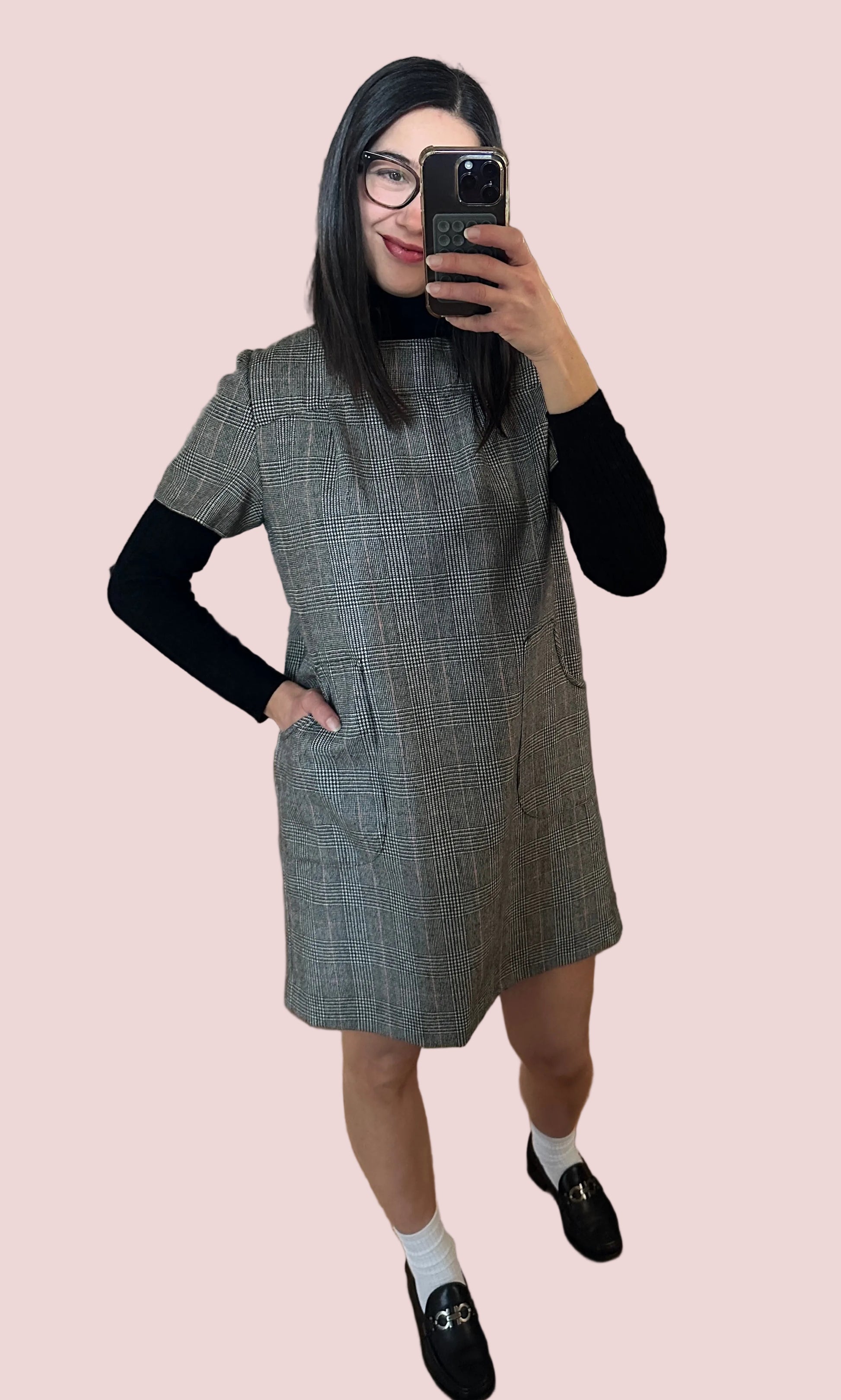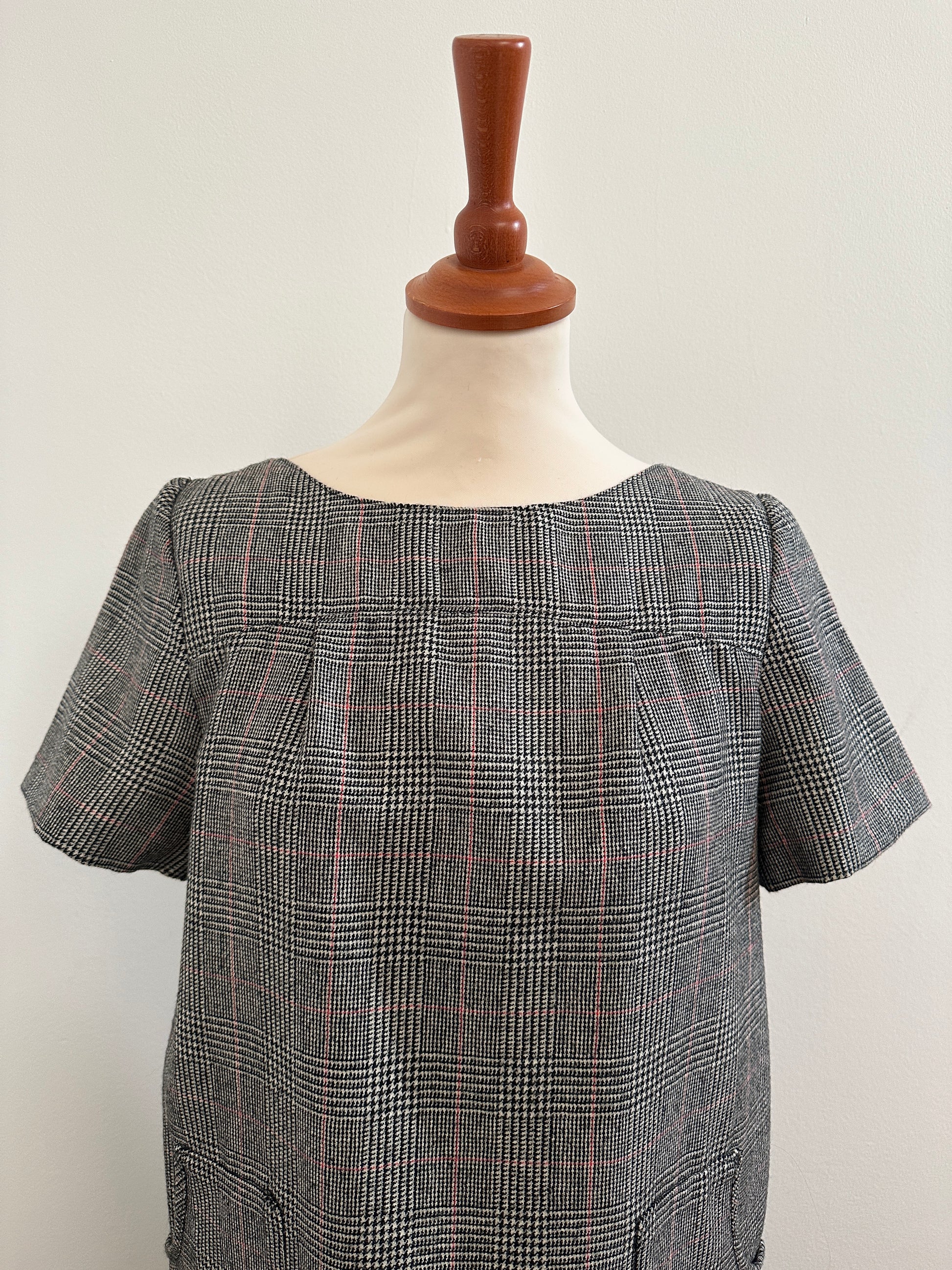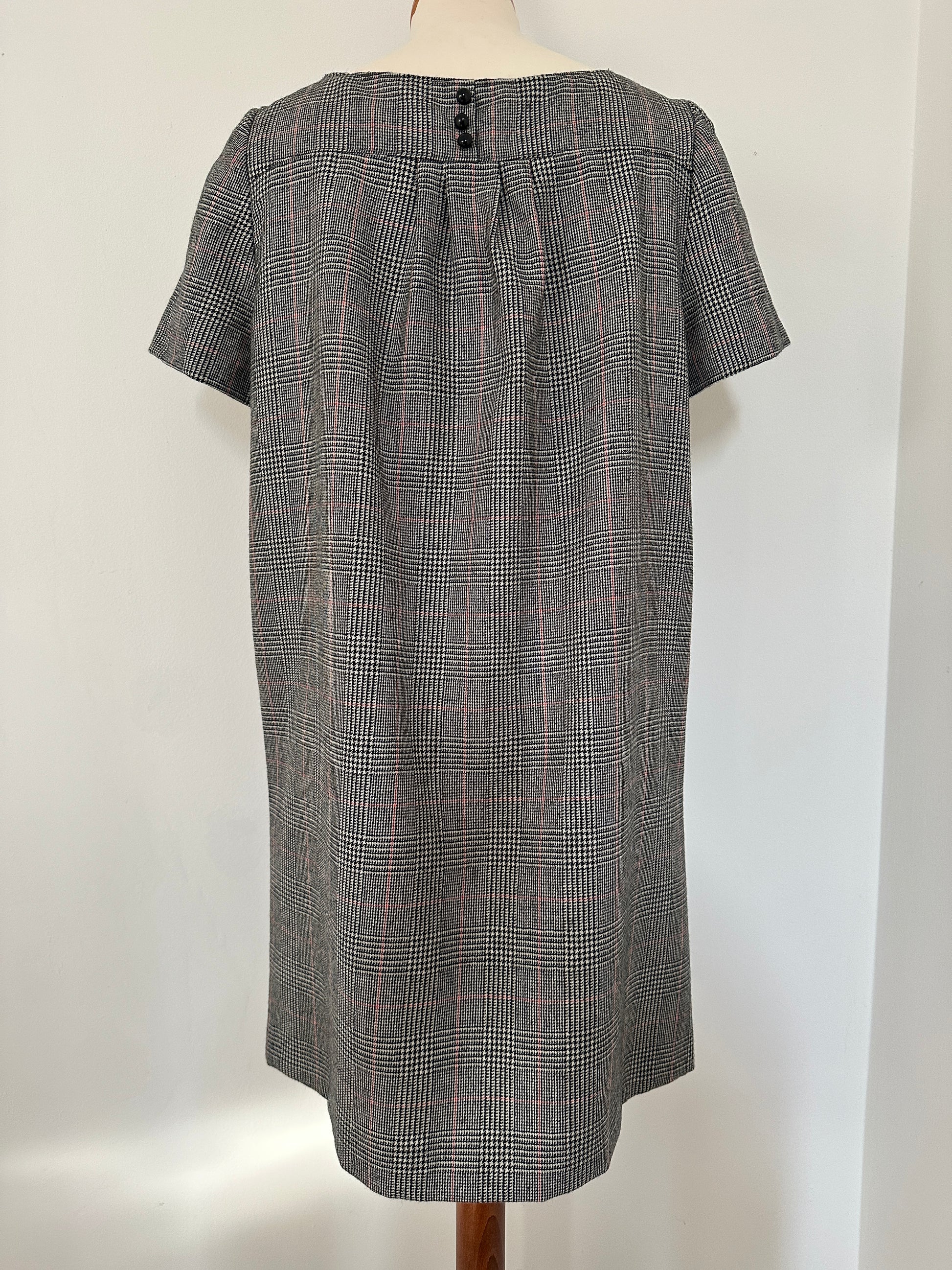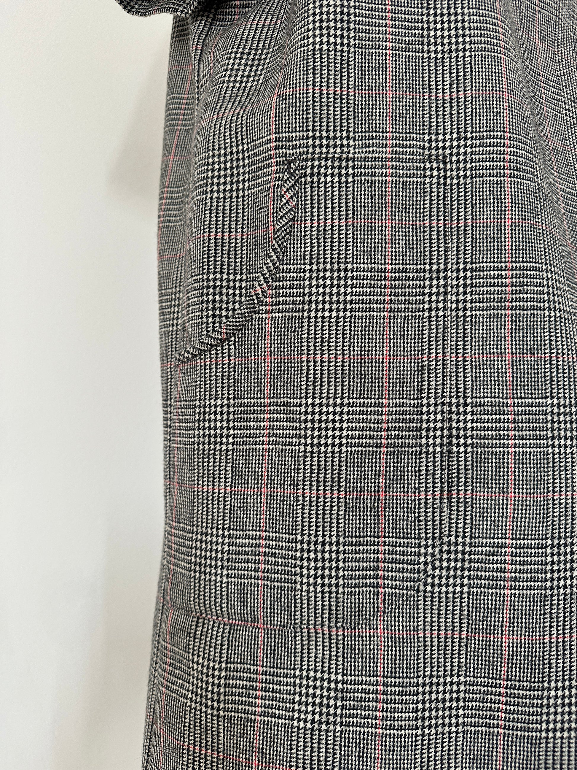 Vestito vintage anni Ottanta in fantasia Principe di Galles nera e bianca con righe rosse, con manica corta e grandi tasche applicate sul davanti.