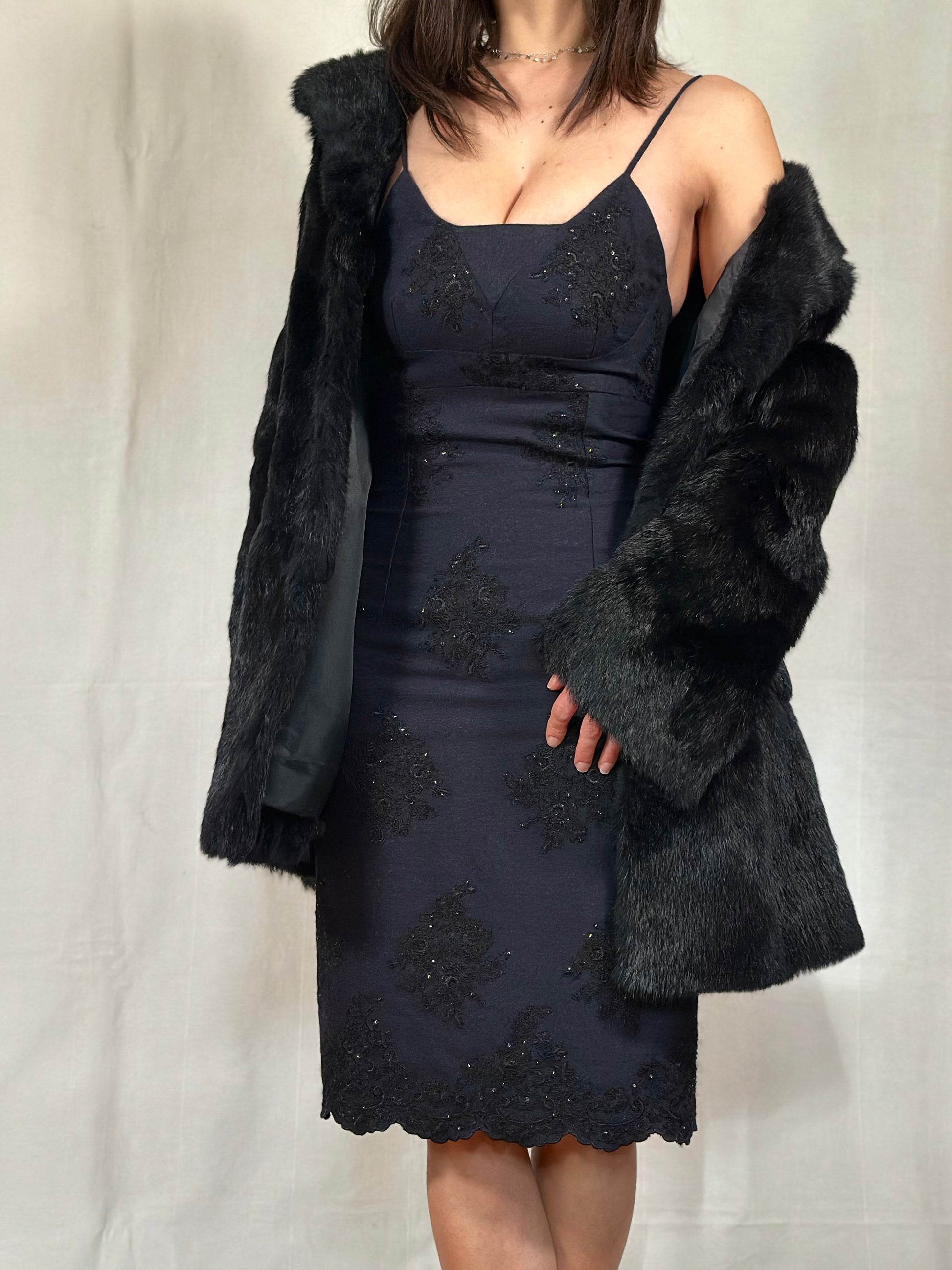 Tessuto impreziosito da ricami floreali neri presenti su tutto l’abito con micro paillettes che donano una leggera luminosità, l’abito termina con il fondo smerlato.