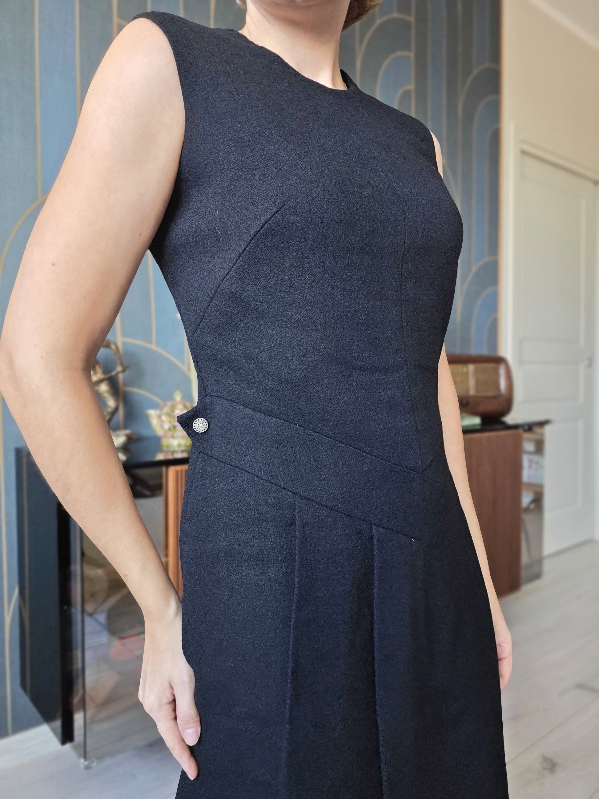 Splendido vestito sartoriale vintage pieni anni Sessanta, modello smanicato in crêpe di pura lana nera.