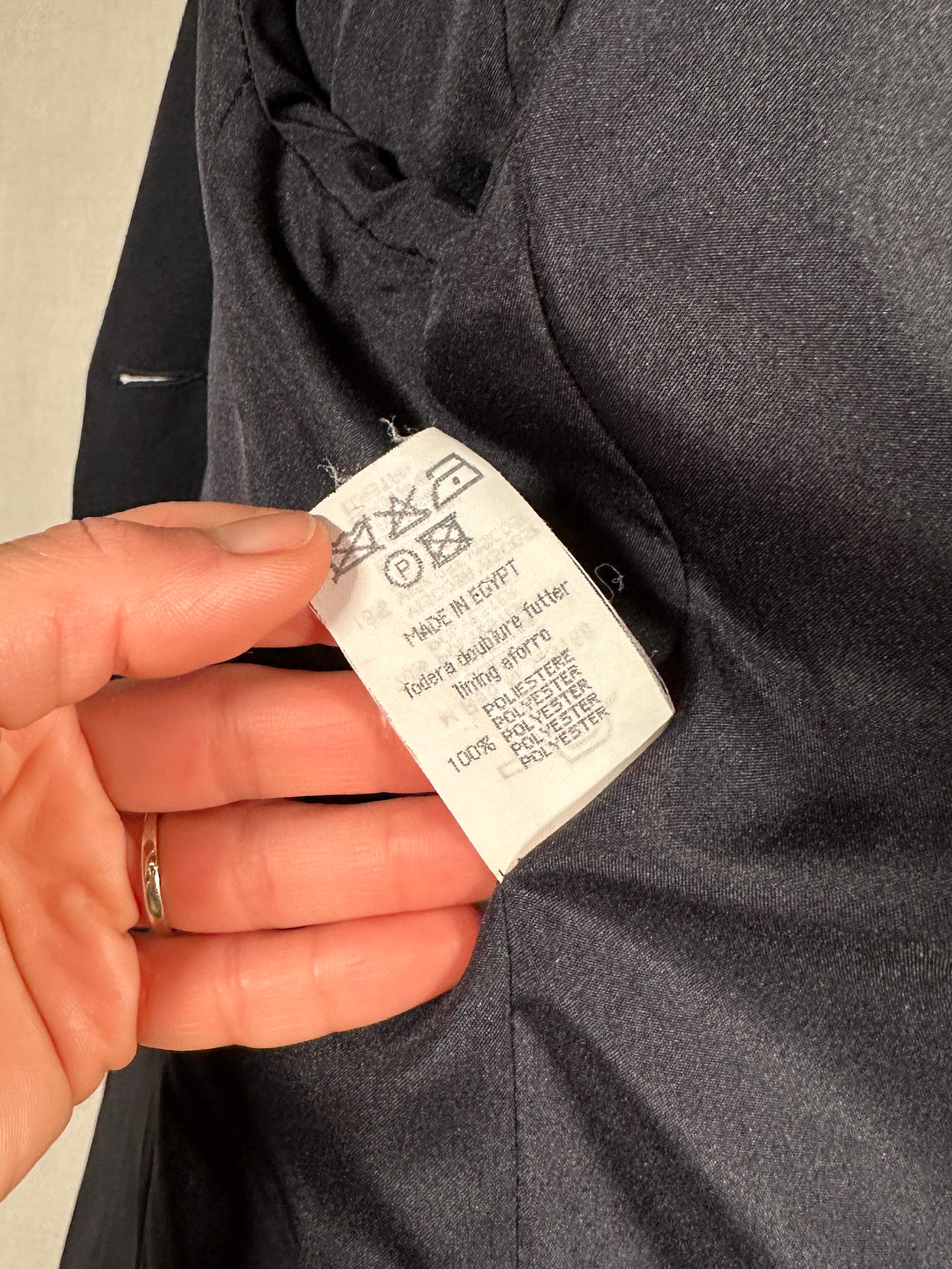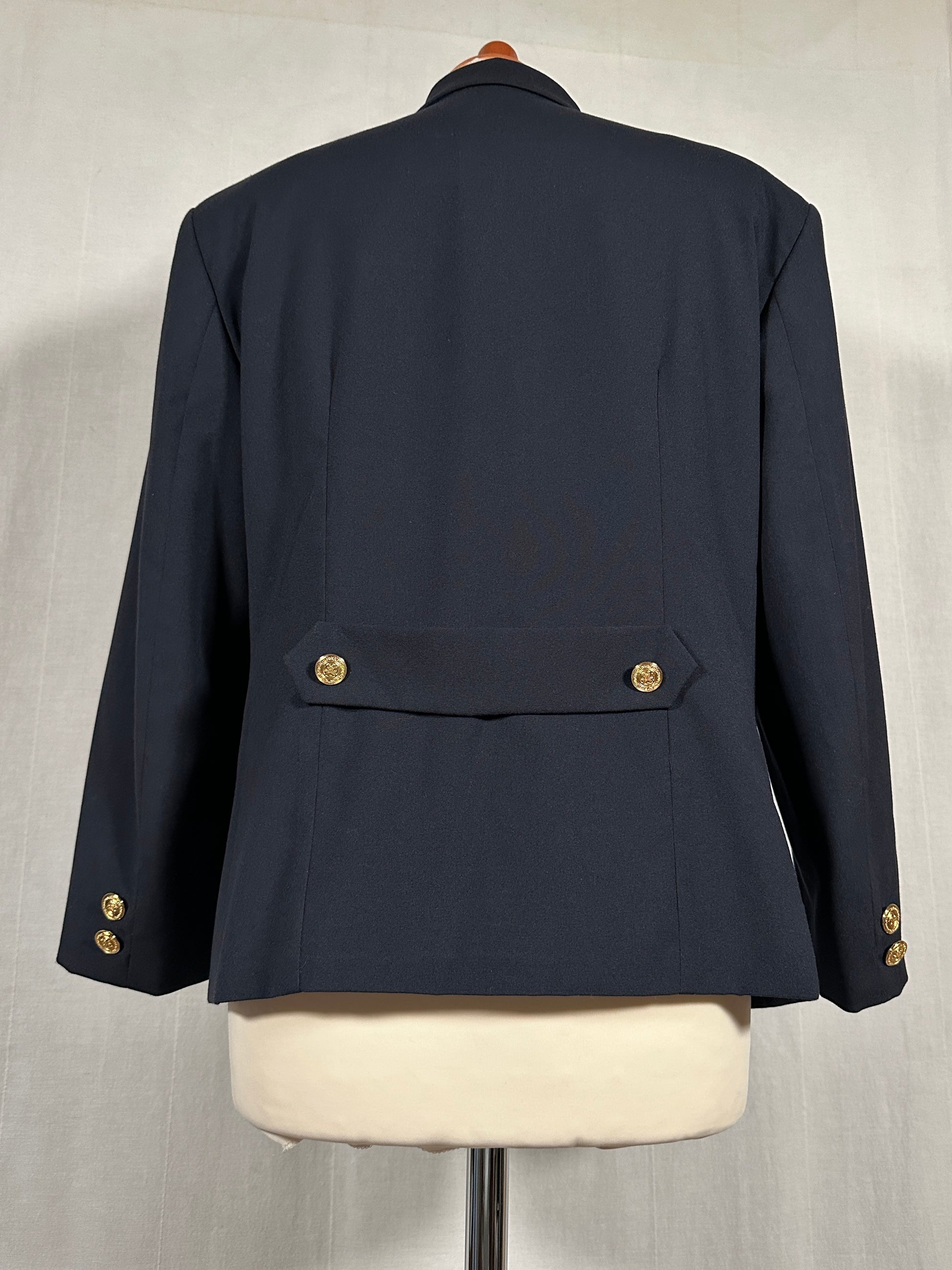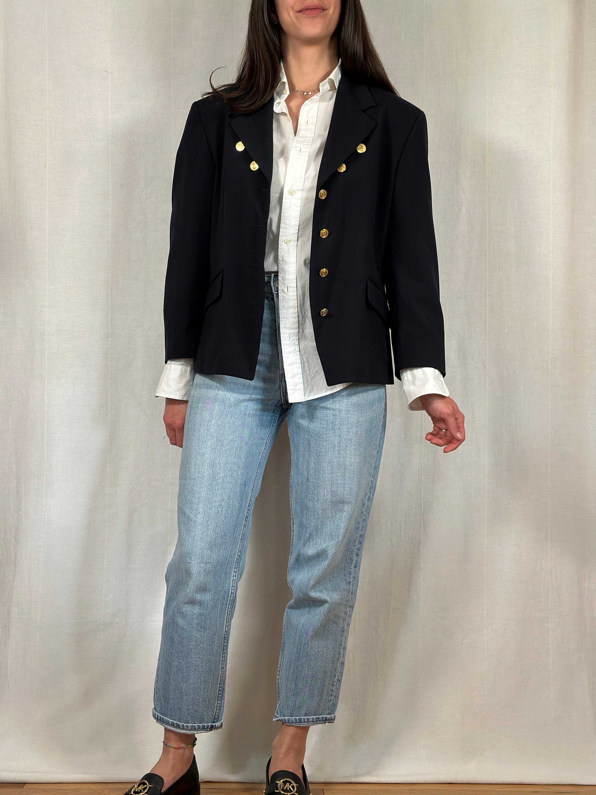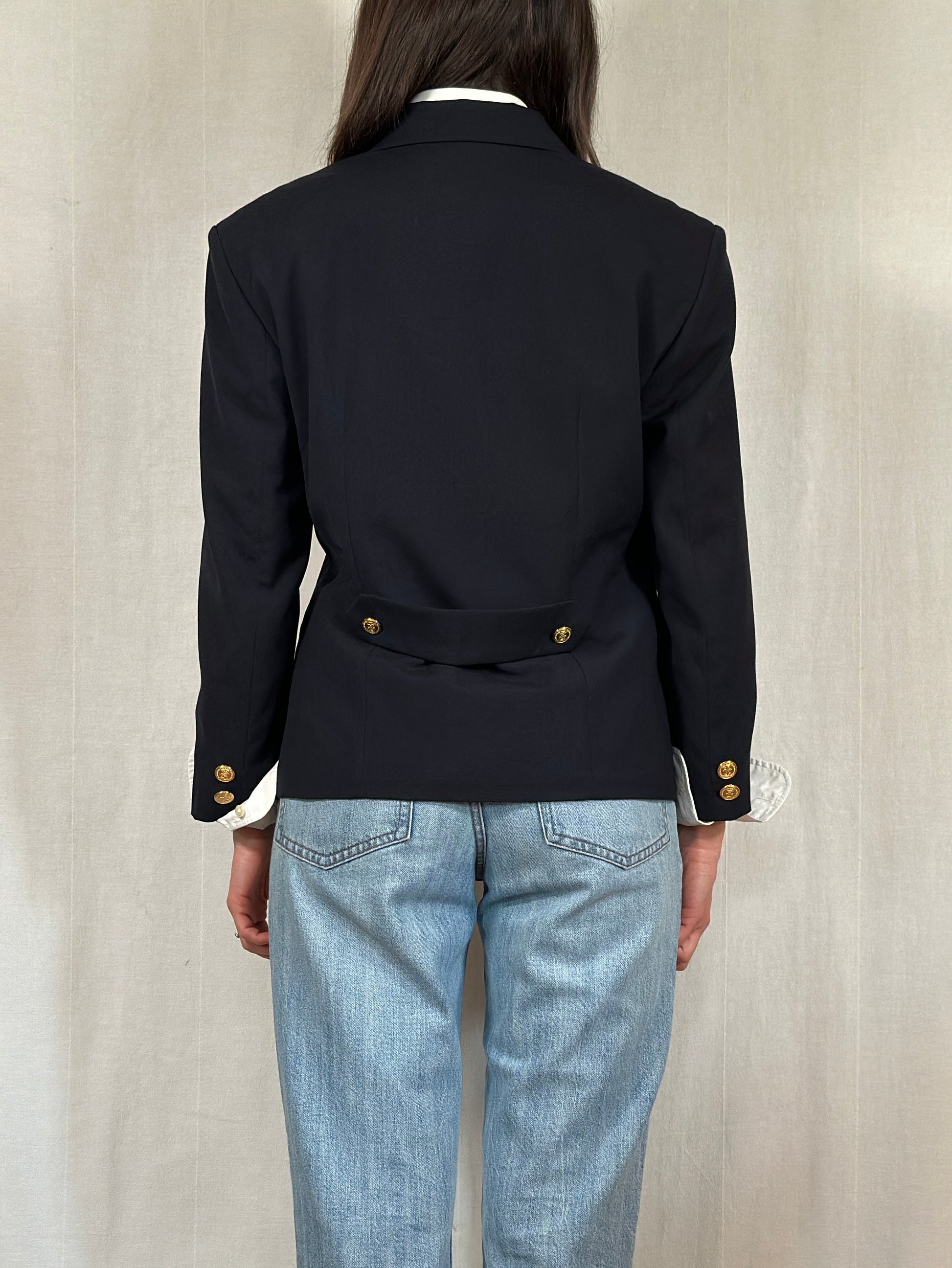 Blazer vintage primi anni Novanta in tessuto sintetico color blu scuro con bottoni dorati.