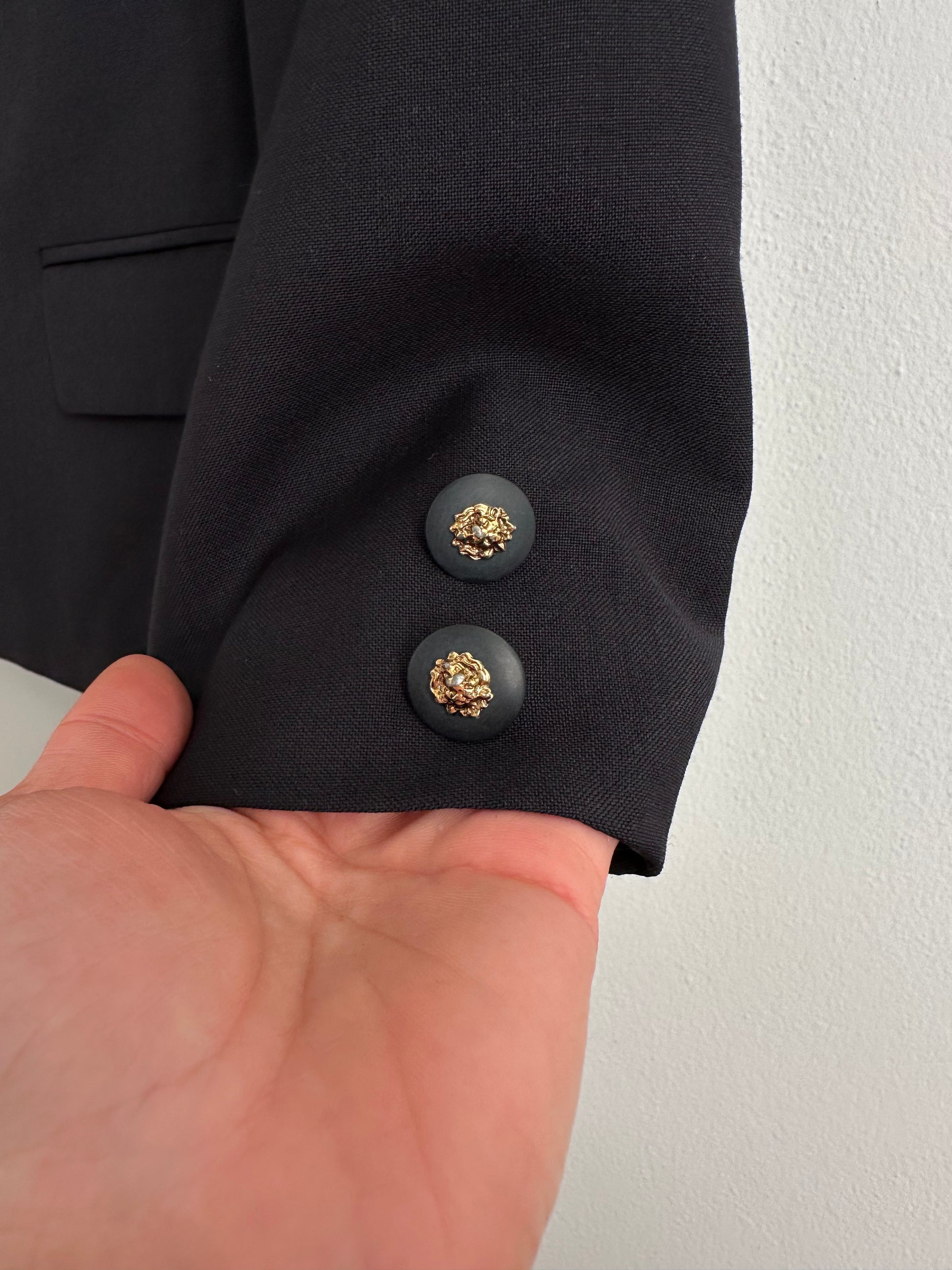 Giacca vintage in pura lana vergine blu scuro con bottoni gioiello con teste di leoni dorate.