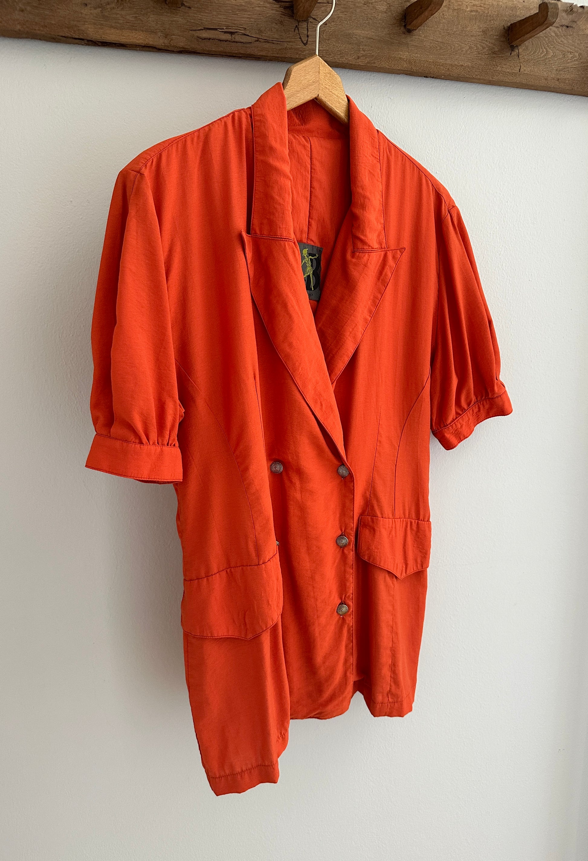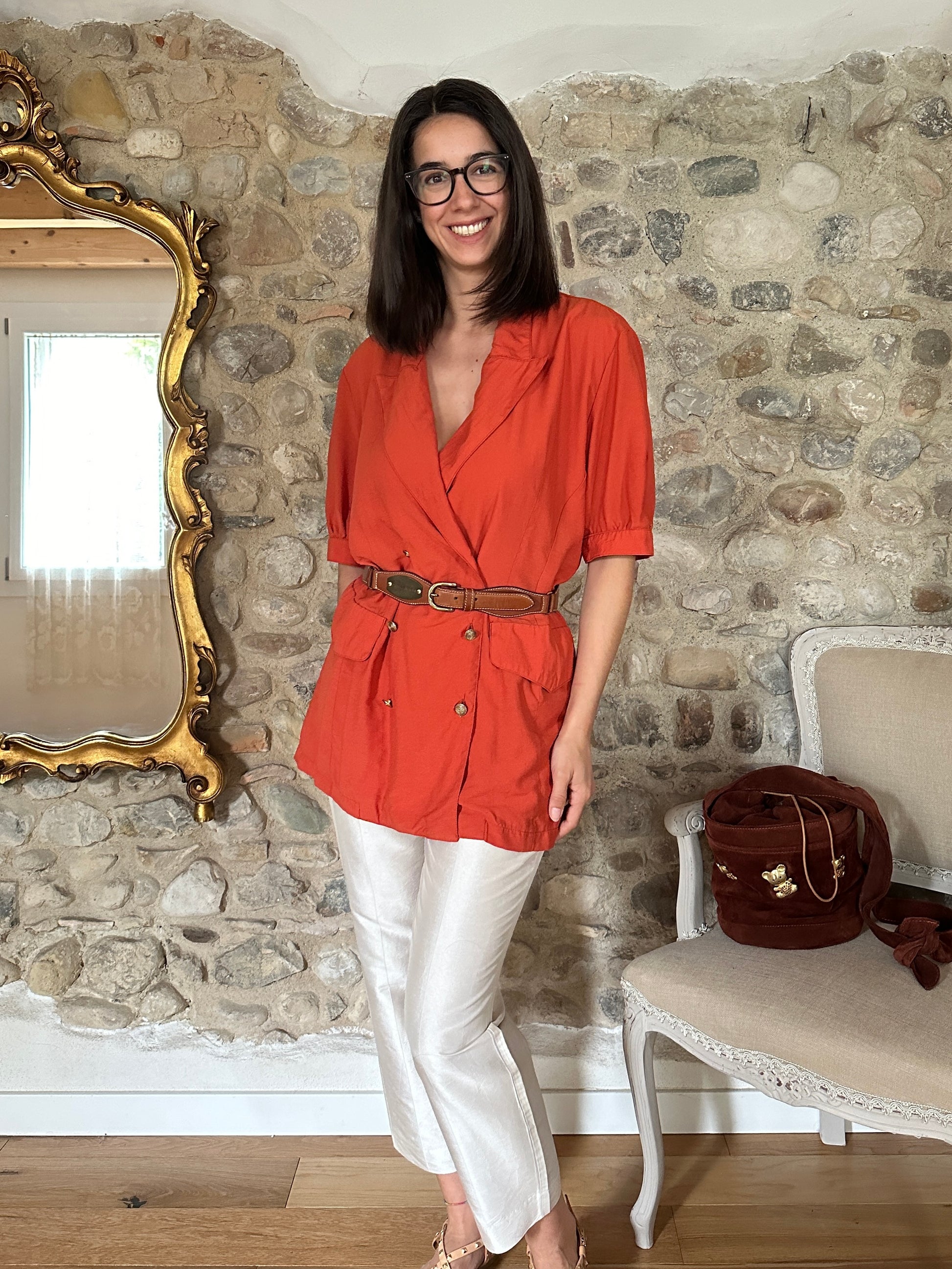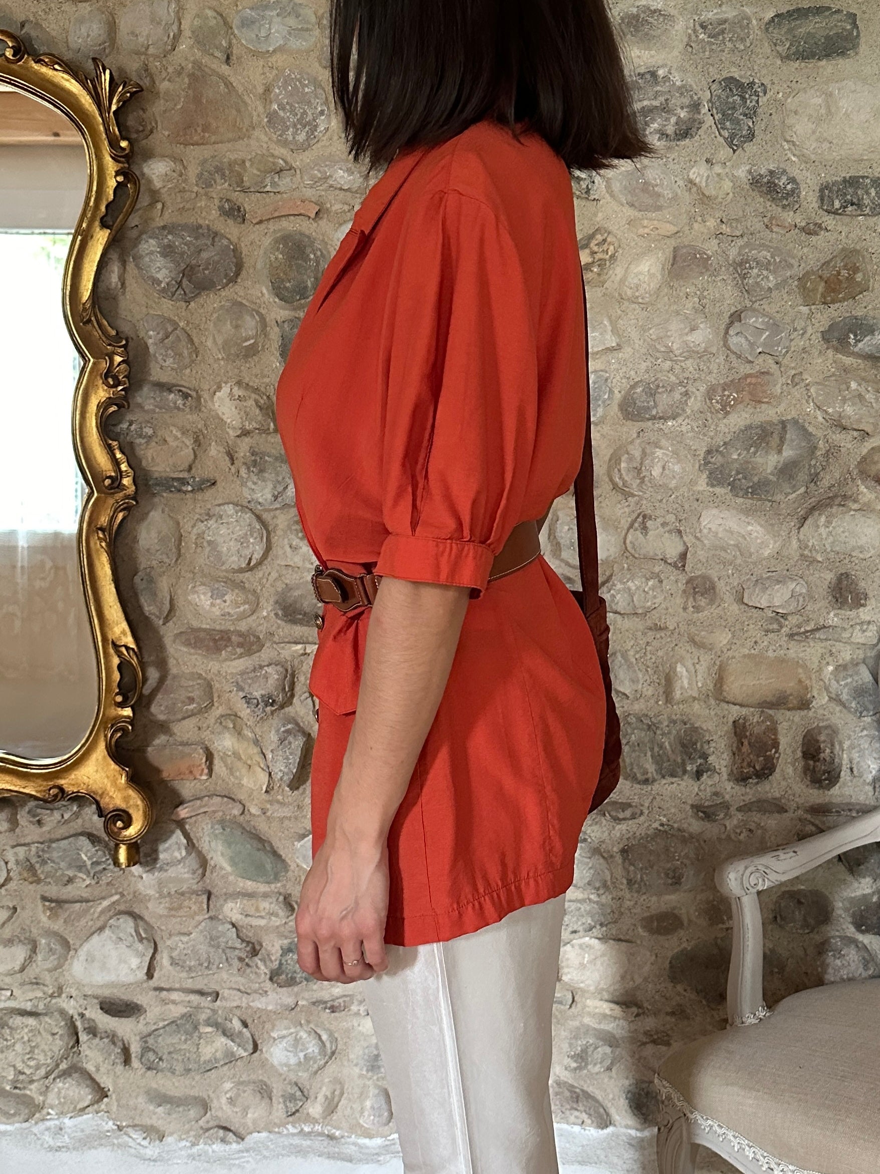 Casacca Made in Italy, doppiopetto dal taglio a camicia con rever a lancia, in un arancione mattone con bottoni in metallo dorato. Le tasche sono chiuse con pattina decorativa e le maniche terminano con polsini senza abbottonatura. Bella impreziosita con cintura in vita✨