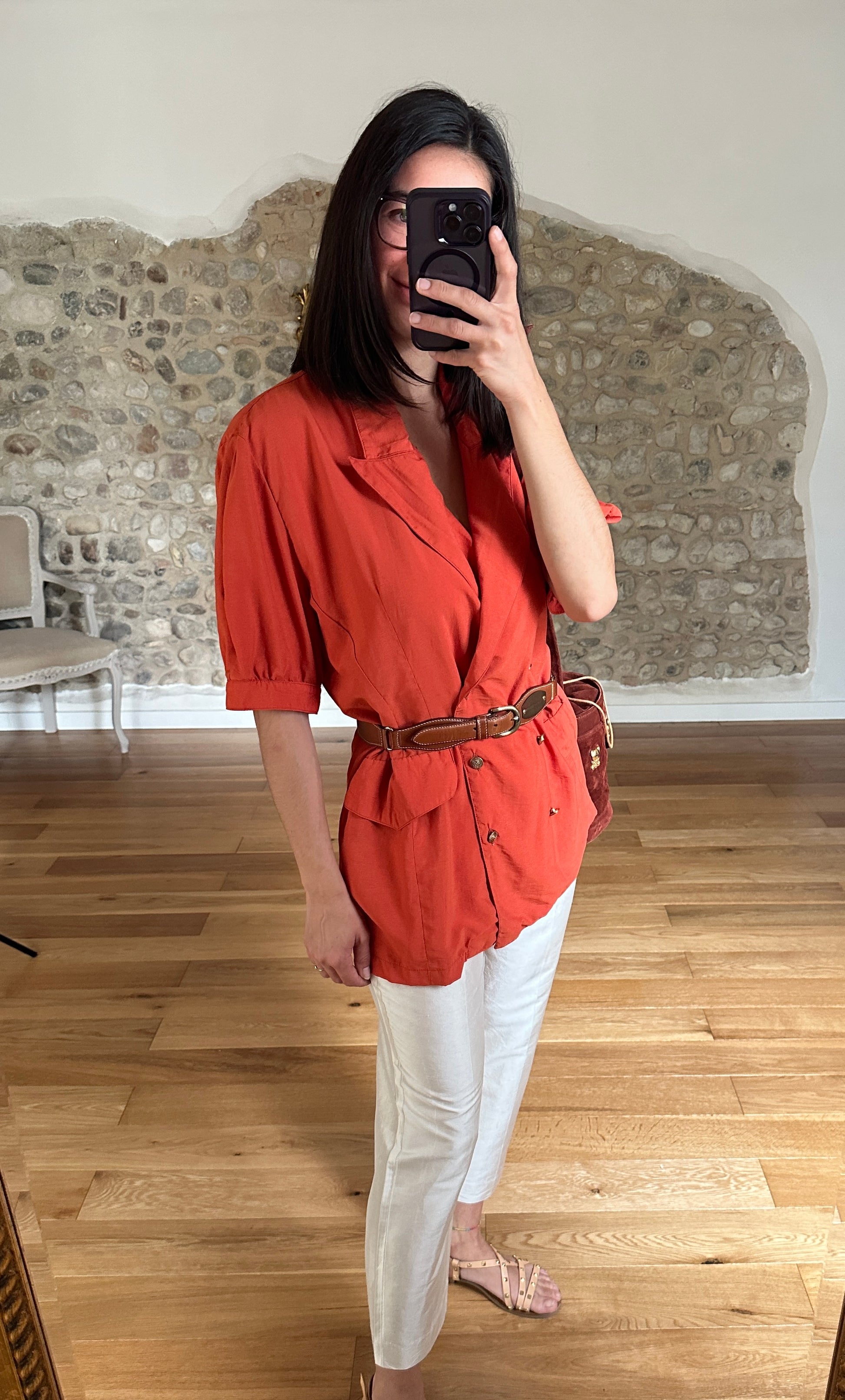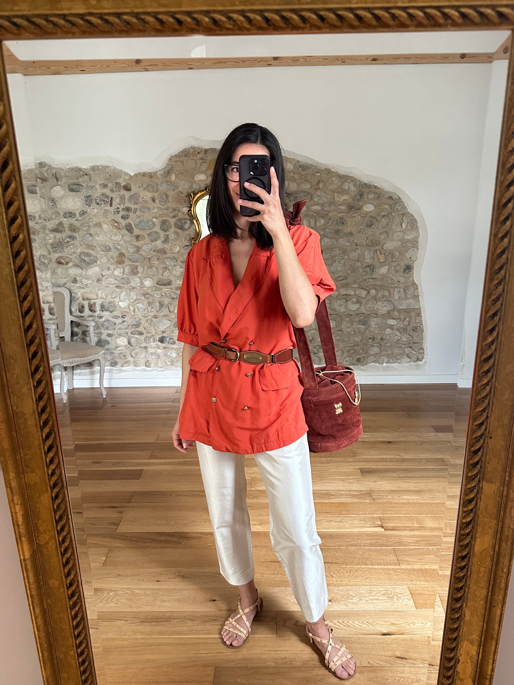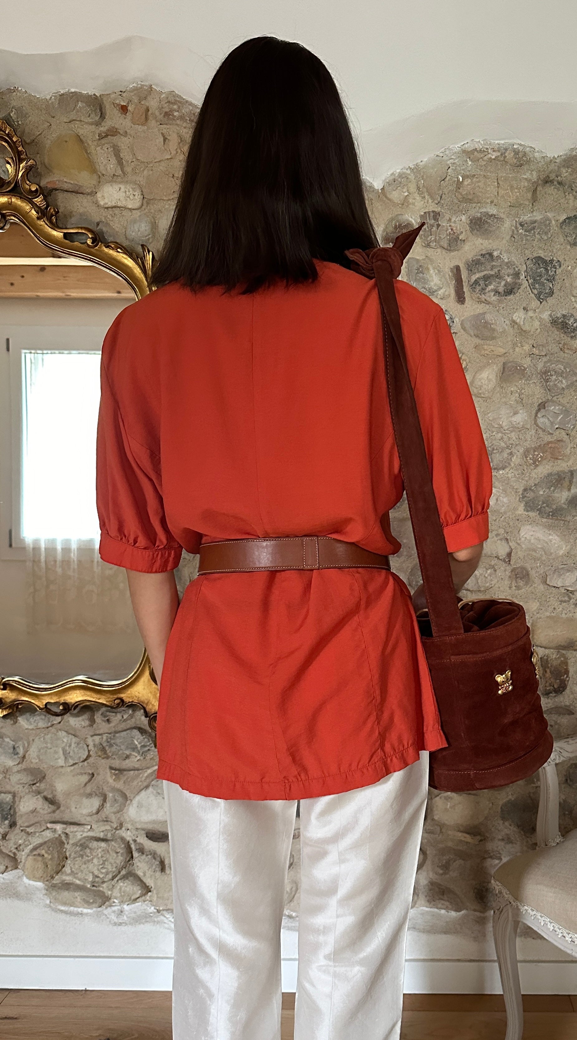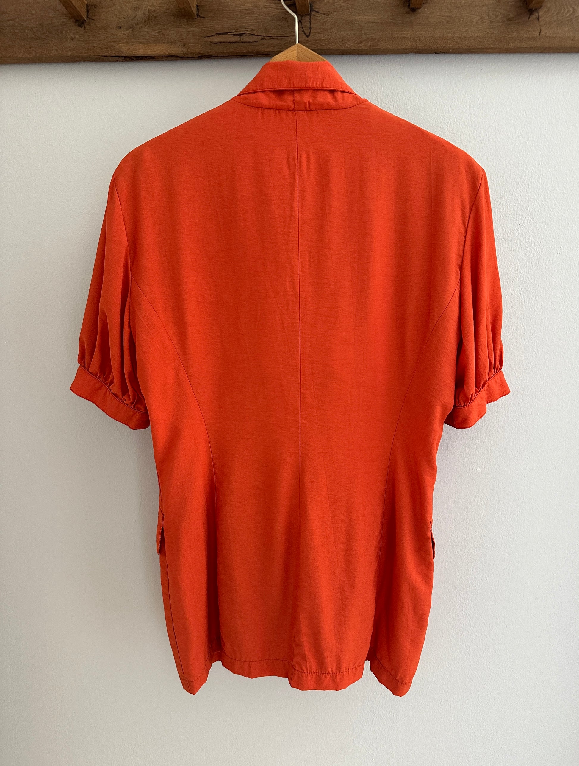 Casacca Made in Italy, doppiopetto dal taglio a camicia con rever a lancia, in un arancione mattone con bottoni in metallo dorato. Le tasche sono chiuse con pattina decorativa e le maniche terminano con polsini senza abbottonatura. Bella impreziosita con cintura in vita✨