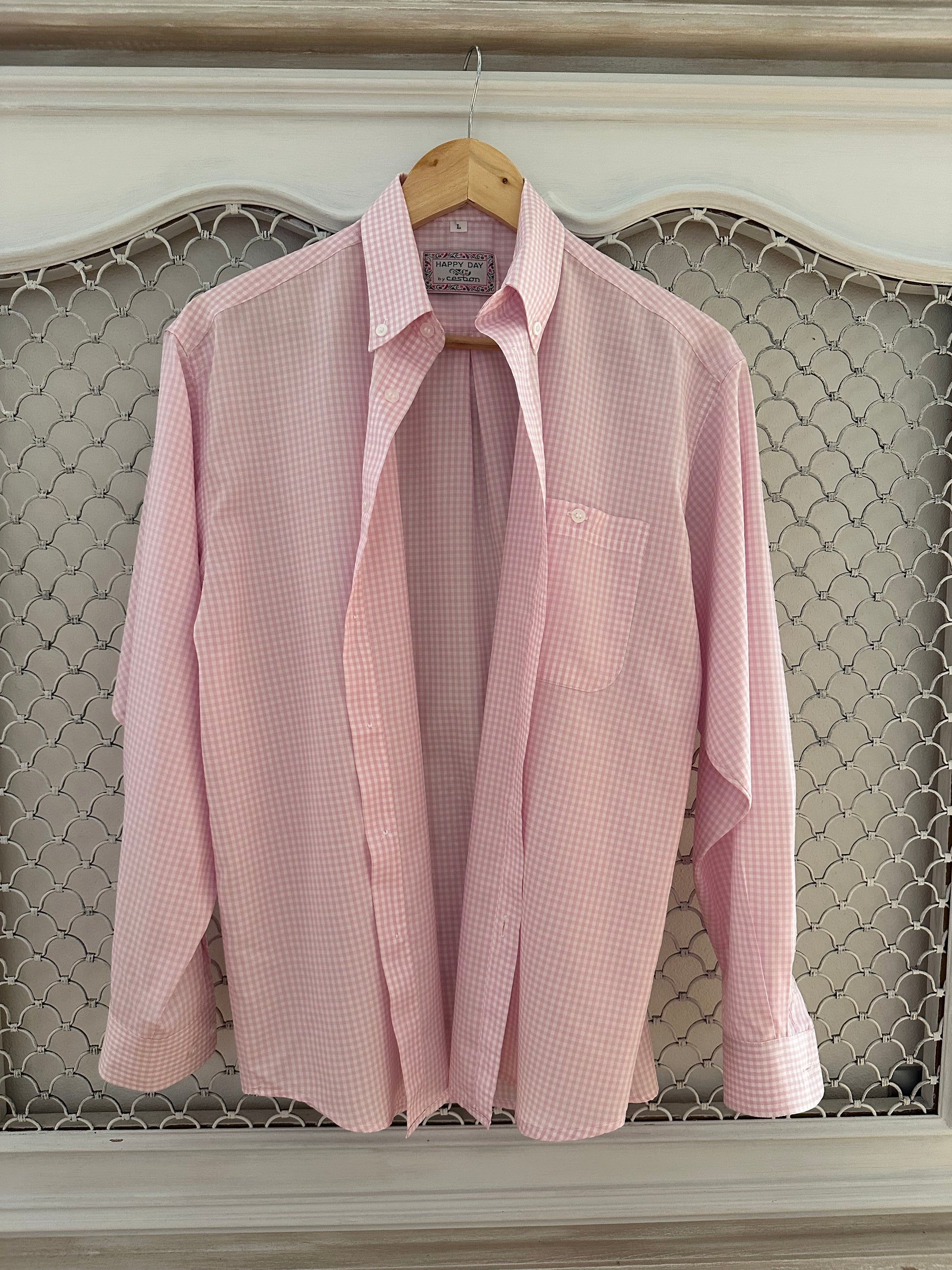 Camicia vintage che nasce da uomo, perfetta anche da donna. In cotone fresco, con una fantasia a quadretti bianchi e rosa. Chiusura con bottoni quasi trasparenti, presenta un taschino con bottoncino sul petto. Me la immagino indossata al mare come copricostume, con un cocktail colorato in mano✨