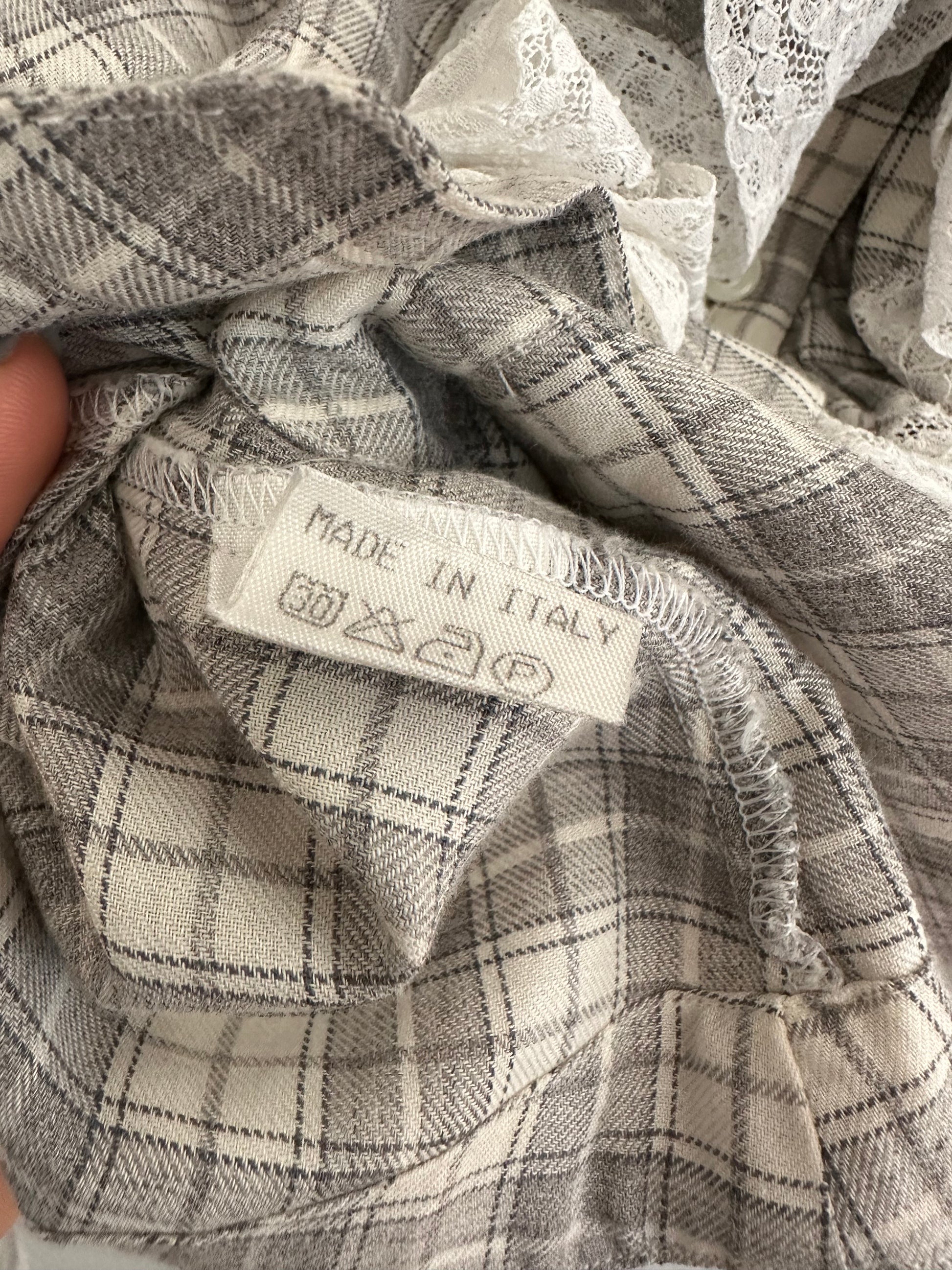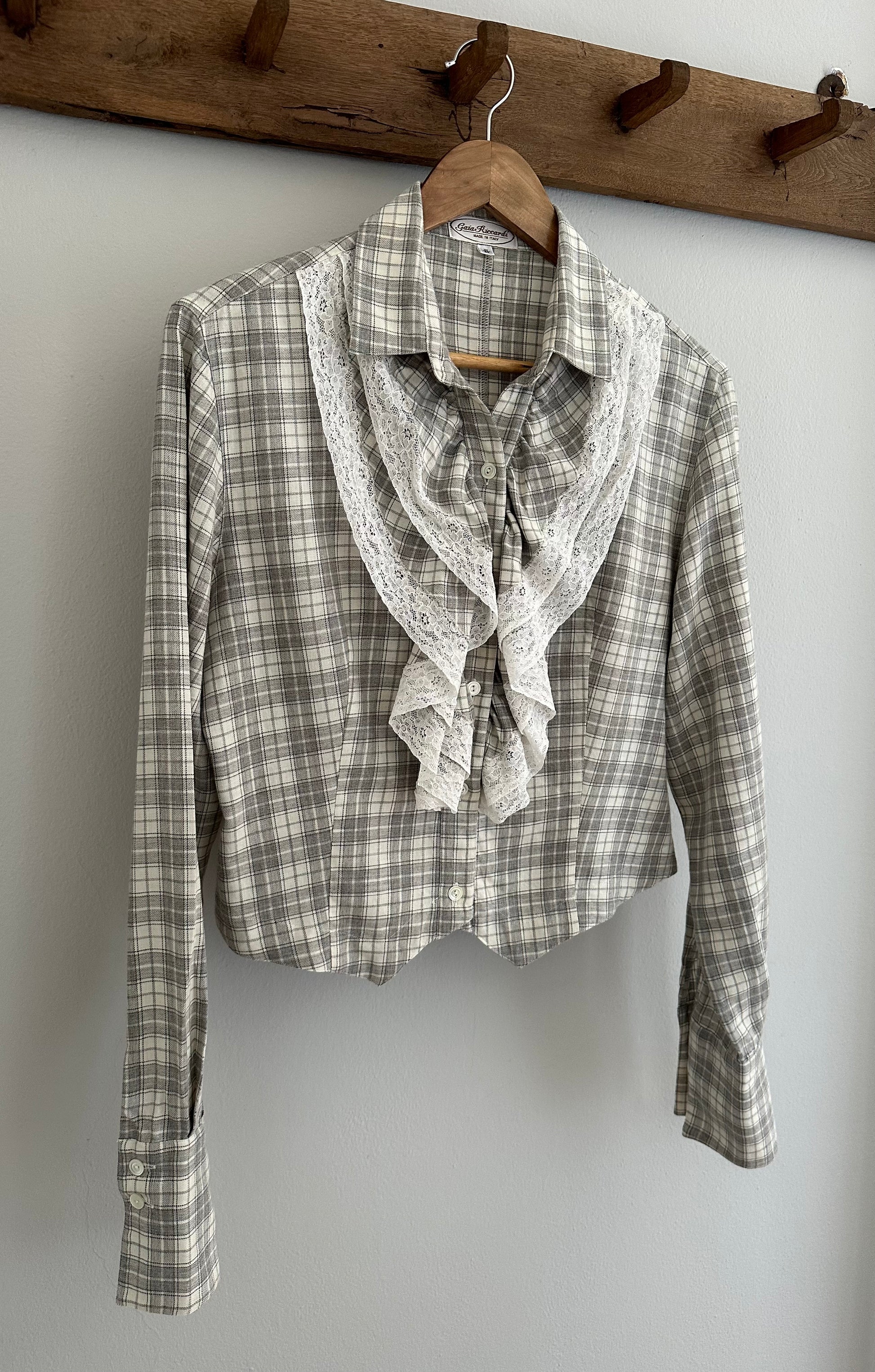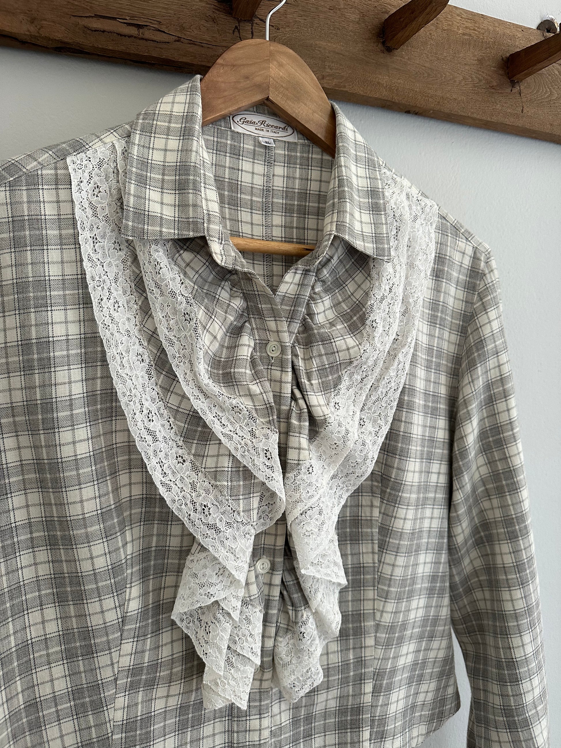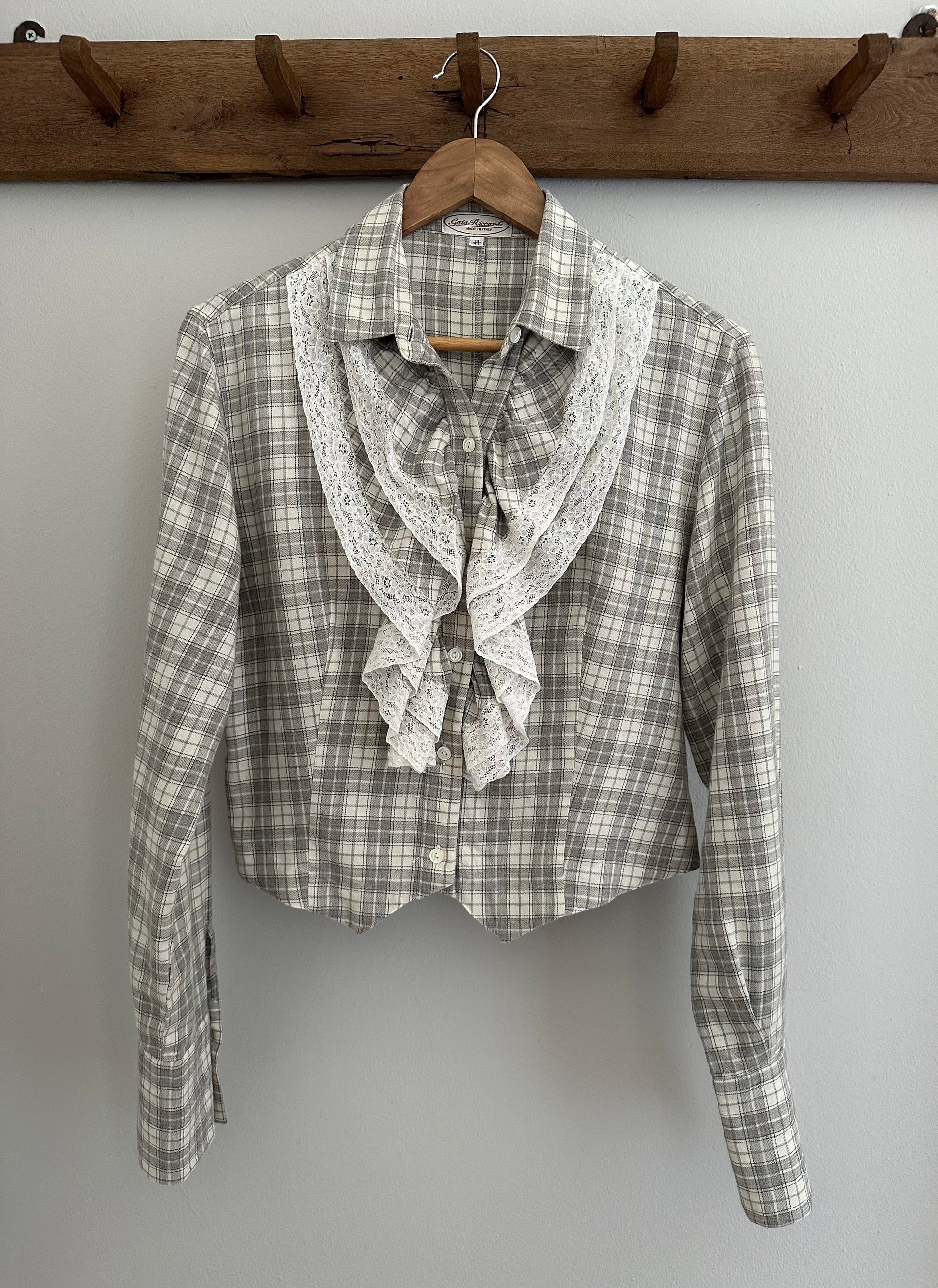 Camicia Gaia Riccardi, Made in Italy, originale fine anni Settanta/inizi anni Ottanta. Modello corto in fantasia tartan dai colori tenui nei toni del panna e del grigio. La sua particolarità è data dai volants con inserti in pizzo bianco che corrono sull’abbottonatura e dall’orlo che termina con due punte, come fosse un gilet. Chiusura con sei bottoncini in madreperla, due sono presenti anche sui polsini.