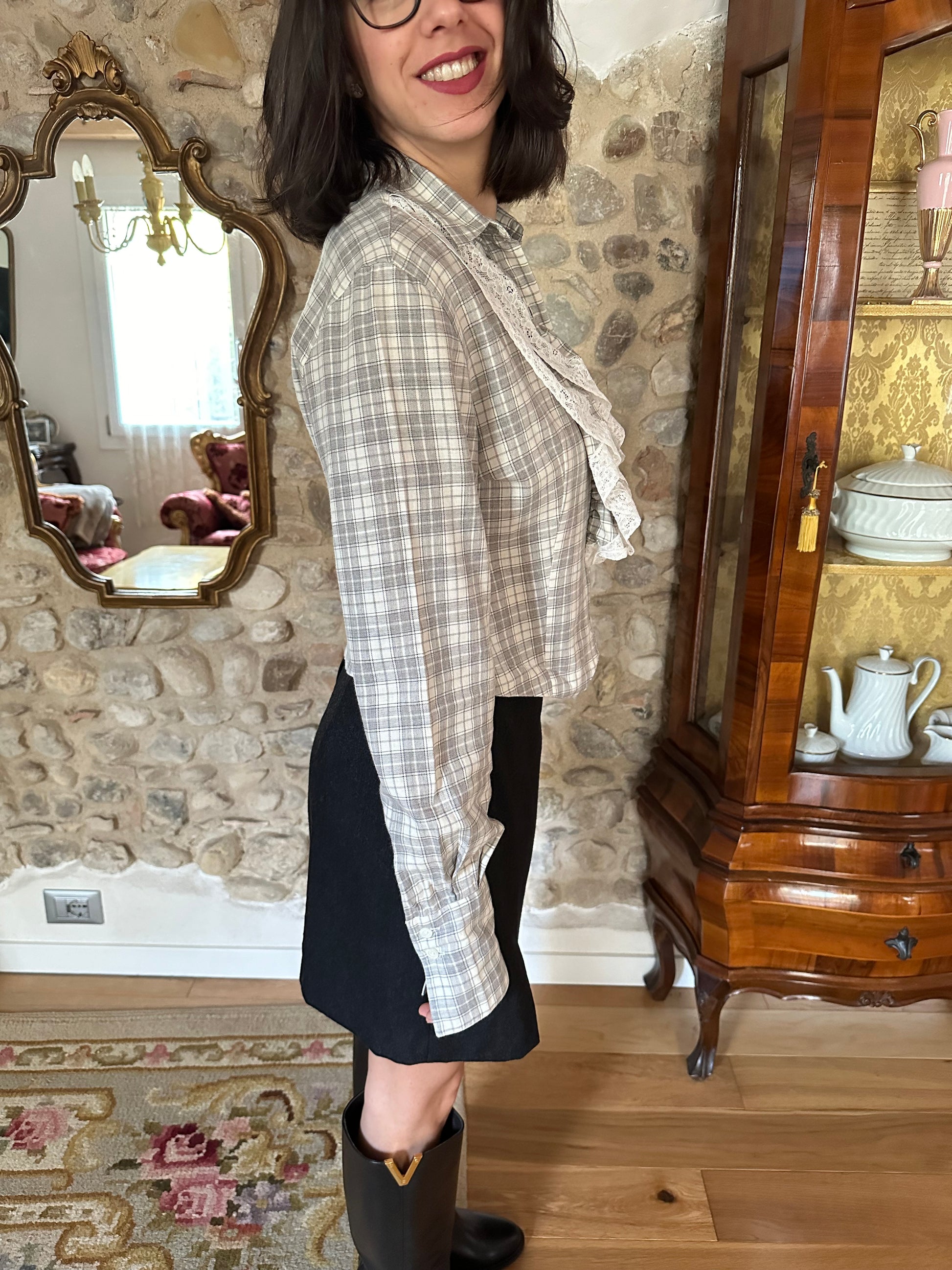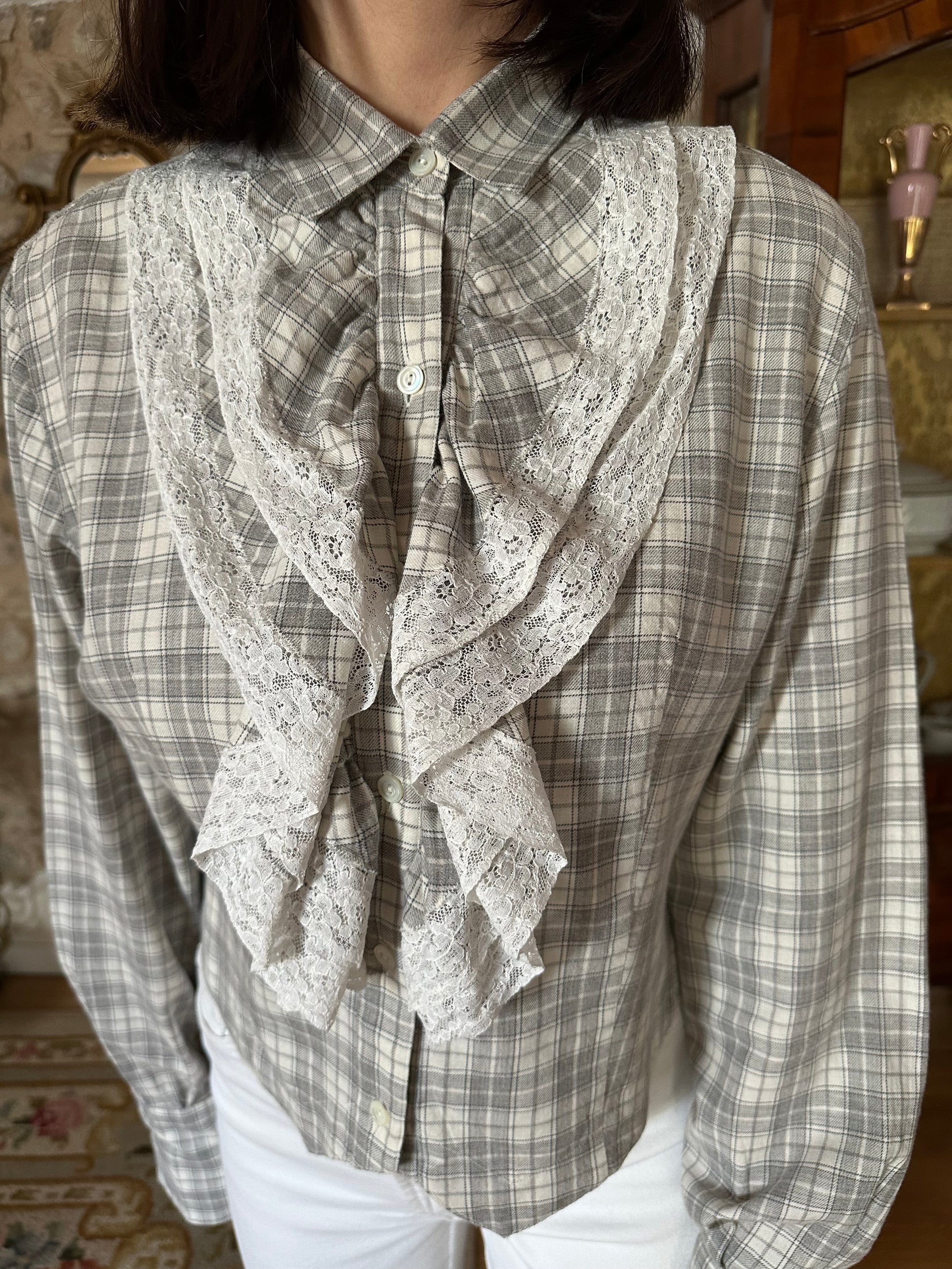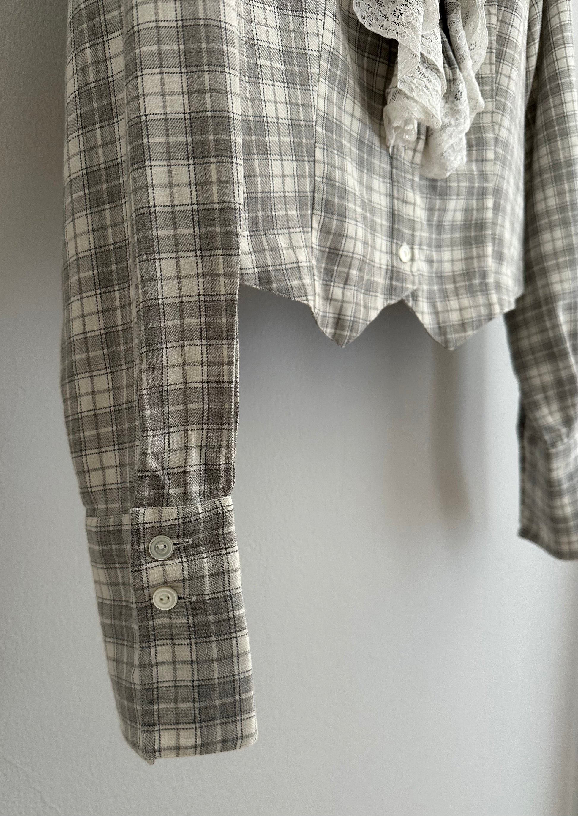 Camicia Gaia Riccardi, Made in Italy, originale fine anni Settanta/inizi anni Ottanta. Modello corto in fantasia tartan dai colori tenui nei toni del panna e del grigio. La sua particolarità è data dai volants con inserti in pizzo bianco che corrono sull’abbottonatura e dall’orlo che termina con due punte, come fosse un gilet. Chiusura con sei bottoncini in madreperla, due sono presenti anche sui polsini.