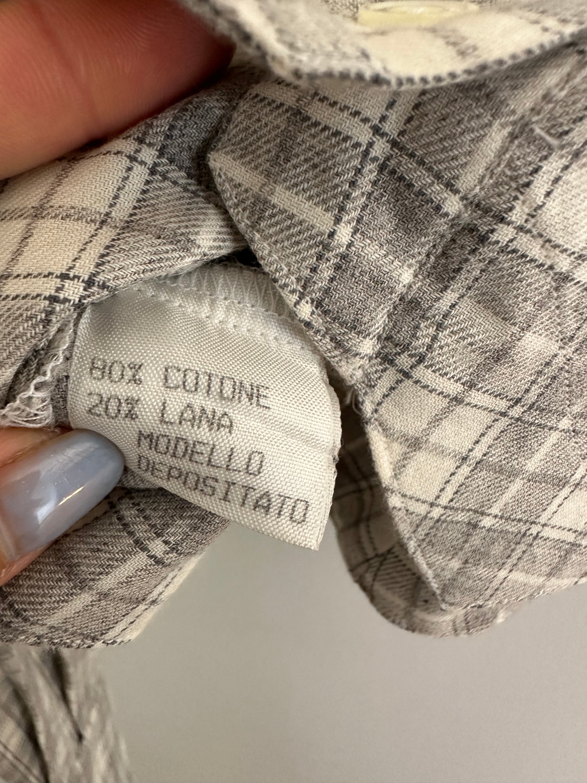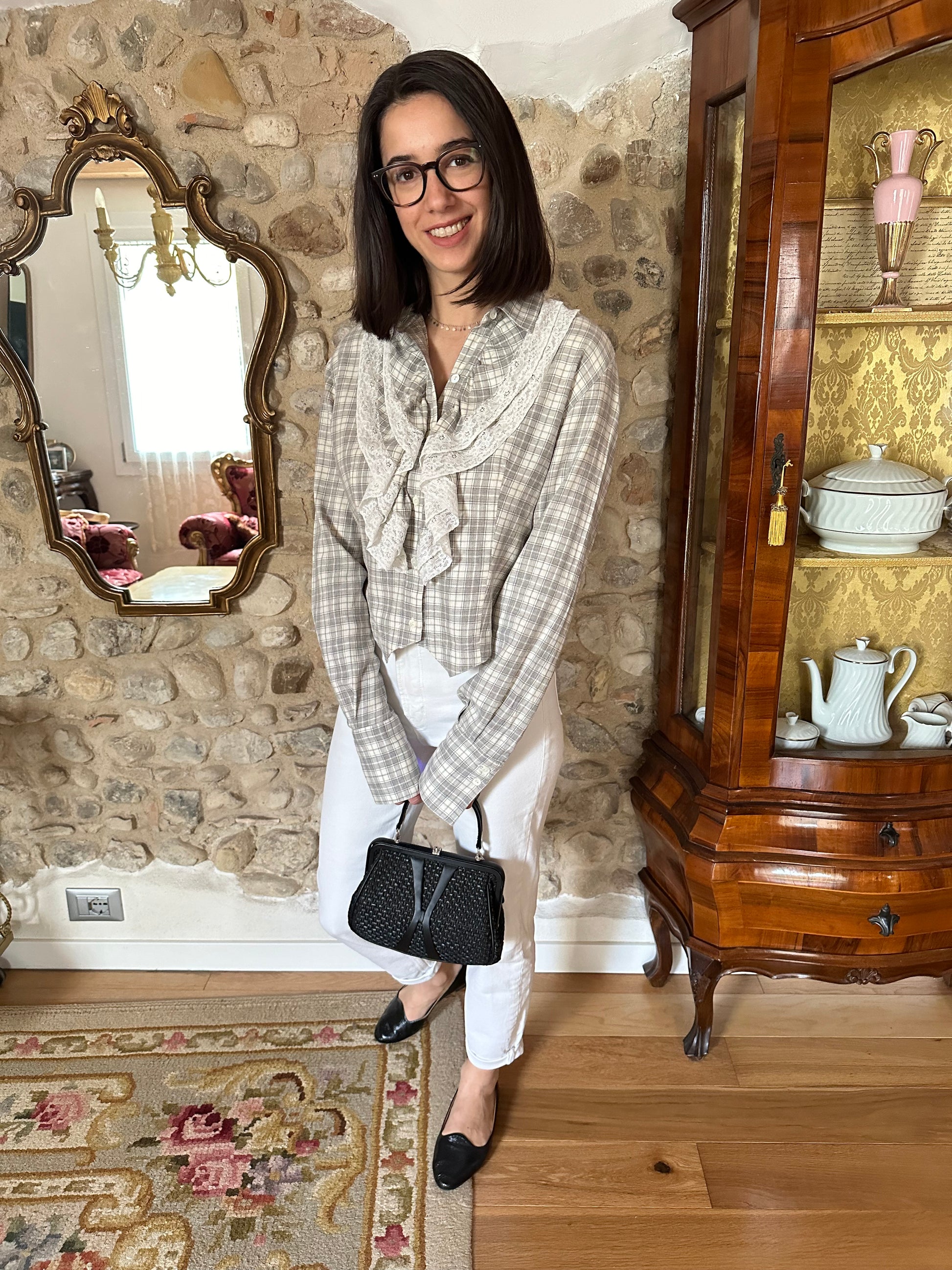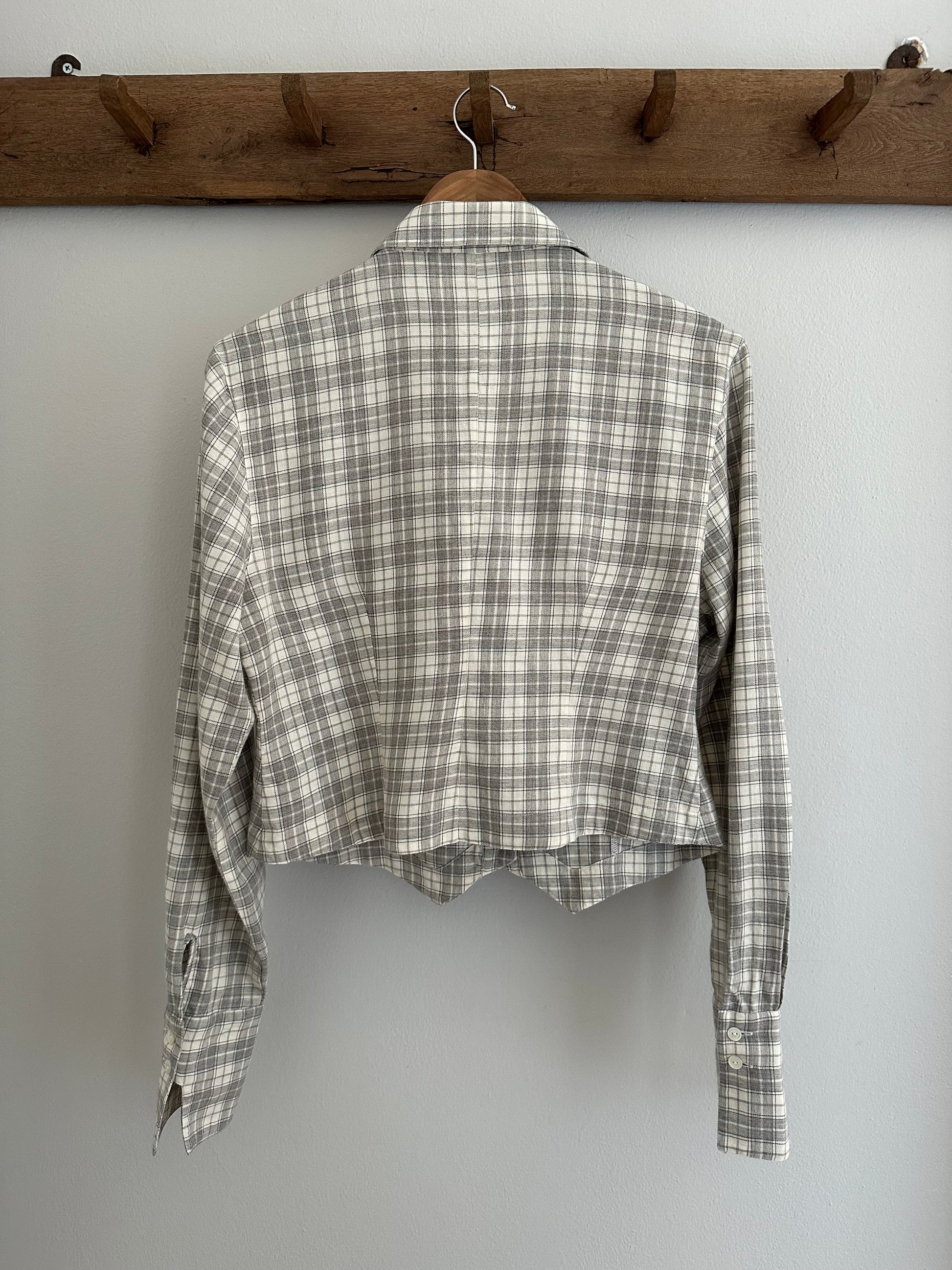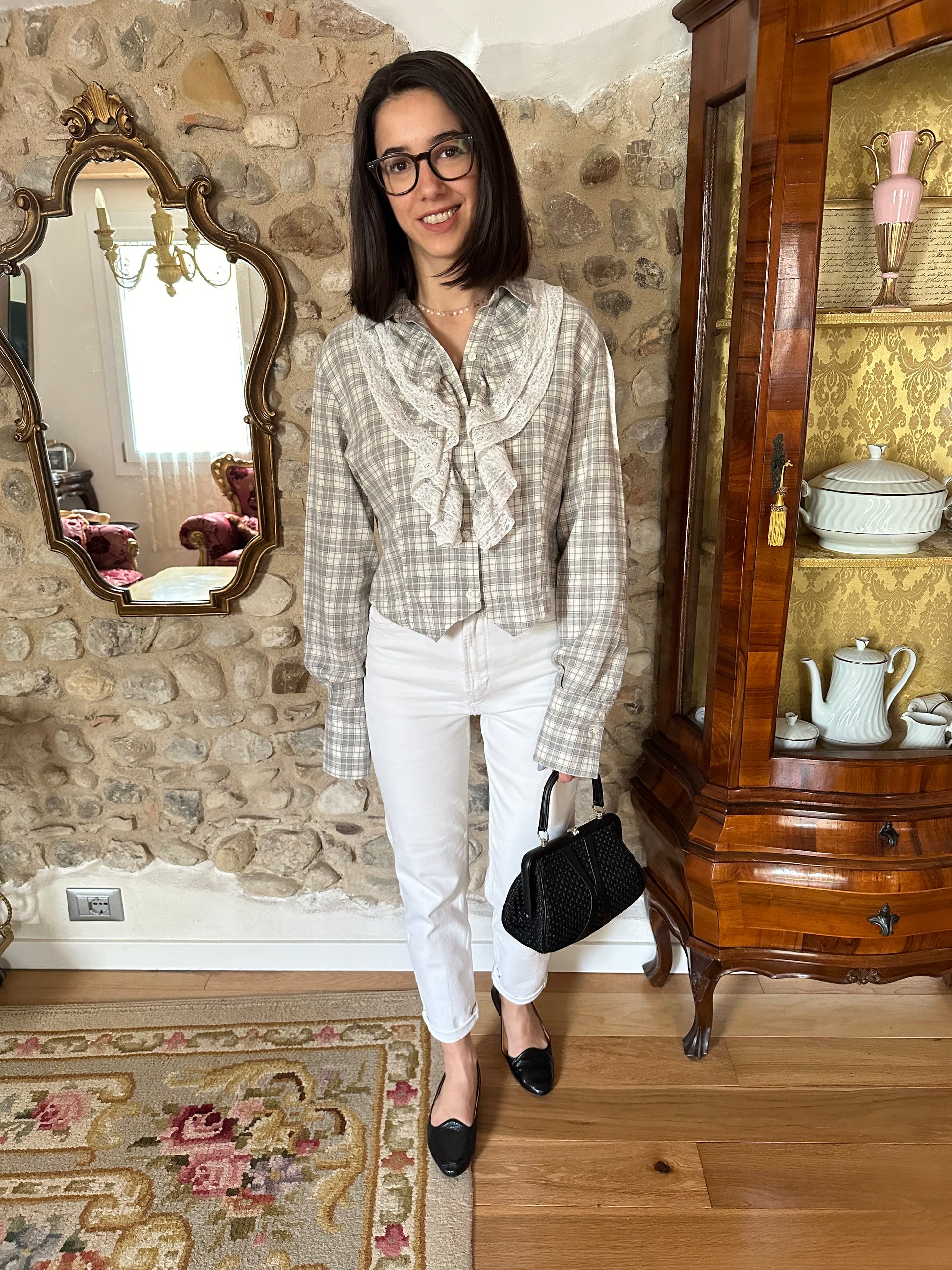 Camicia Gaia Riccardi, Made in Italy, originale fine anni Settanta/inizi anni Ottanta. Modello corto in fantasia tartan dai colori tenui nei toni del panna e del grigio. La sua particolarità è data dai volants con inserti in pizzo bianco che corrono sull’abbottonatura e dall’orlo che termina con due punte, come fosse un gilet. Chiusura con sei bottoncini in madreperla, due sono presenti anche sui polsini.