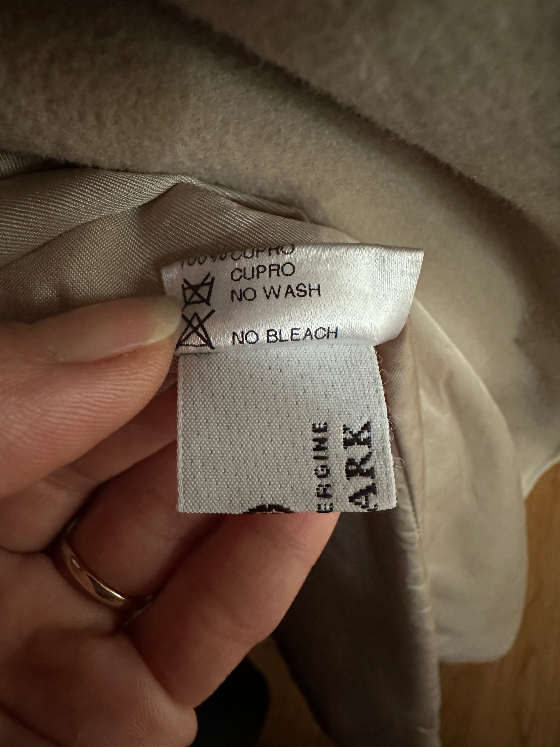 Cappotto minimal Delia Ferrari fine anni ‘90/primi 2000 dalla linea dritta ed essenziale e di un colore tra il beige e il grigio, greige.