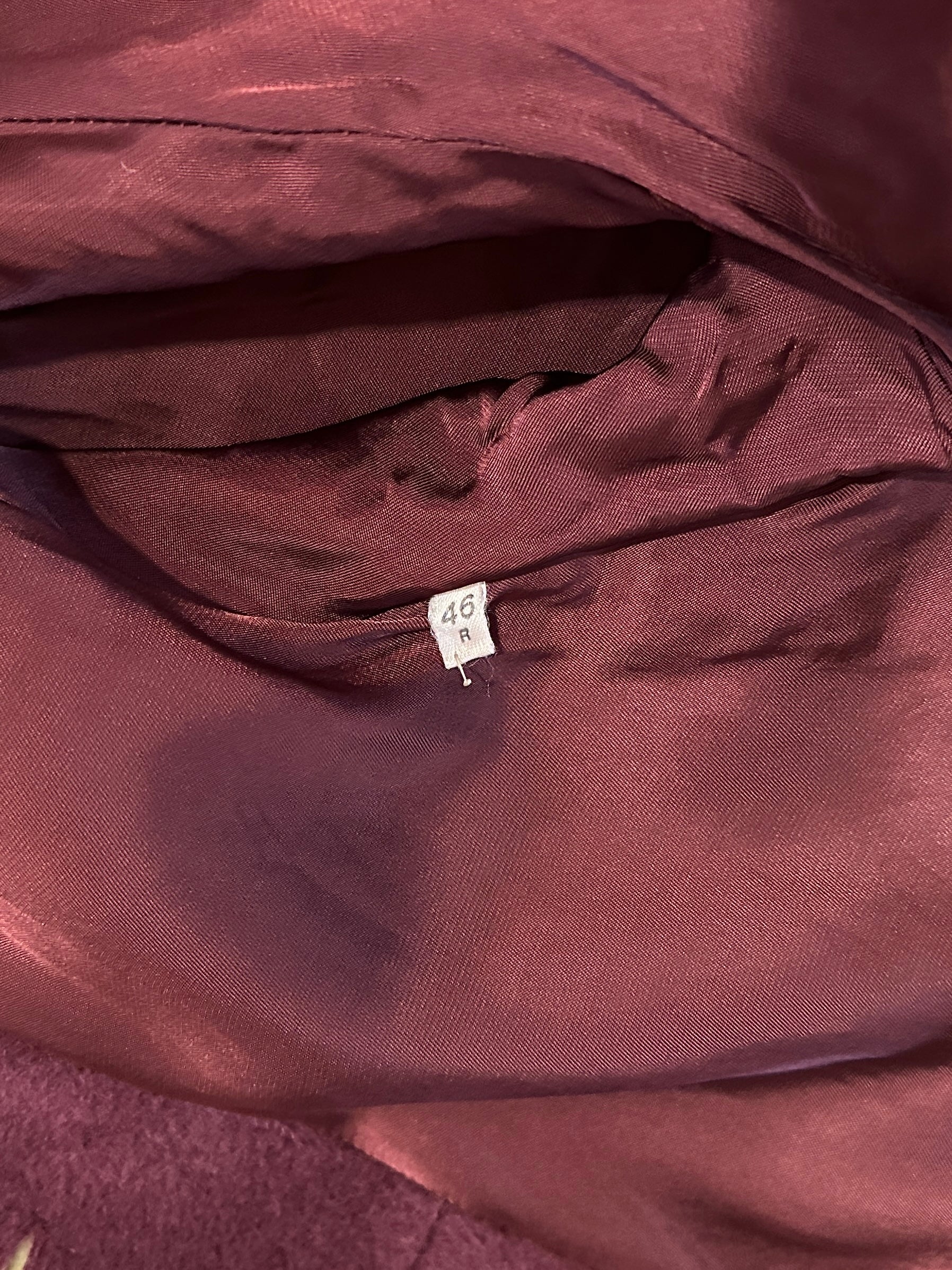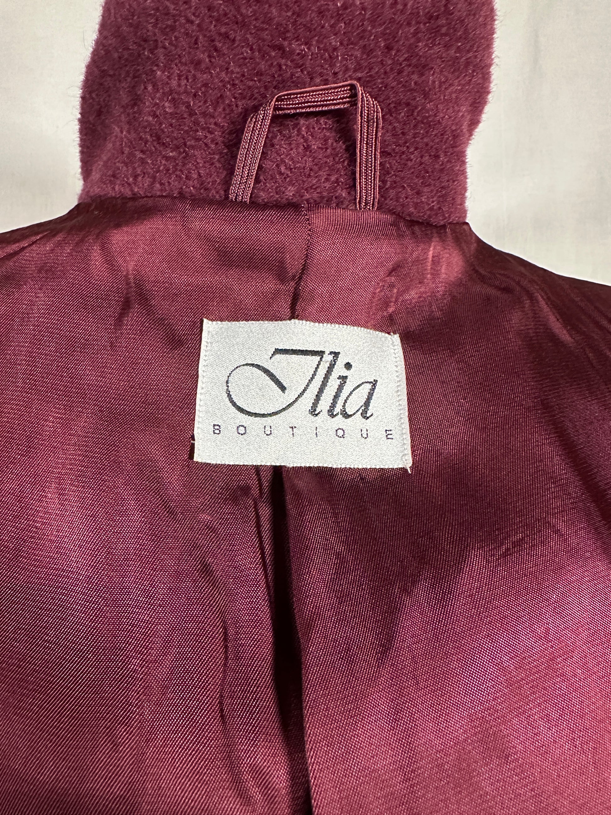 Cappotto over monopetto firmato Ilia Boutique vintage anni Ottanta dalla composizione pesante pazzesca, color vinaccia, linea dritta leggermente svasata e lunghezza al ginocchio.