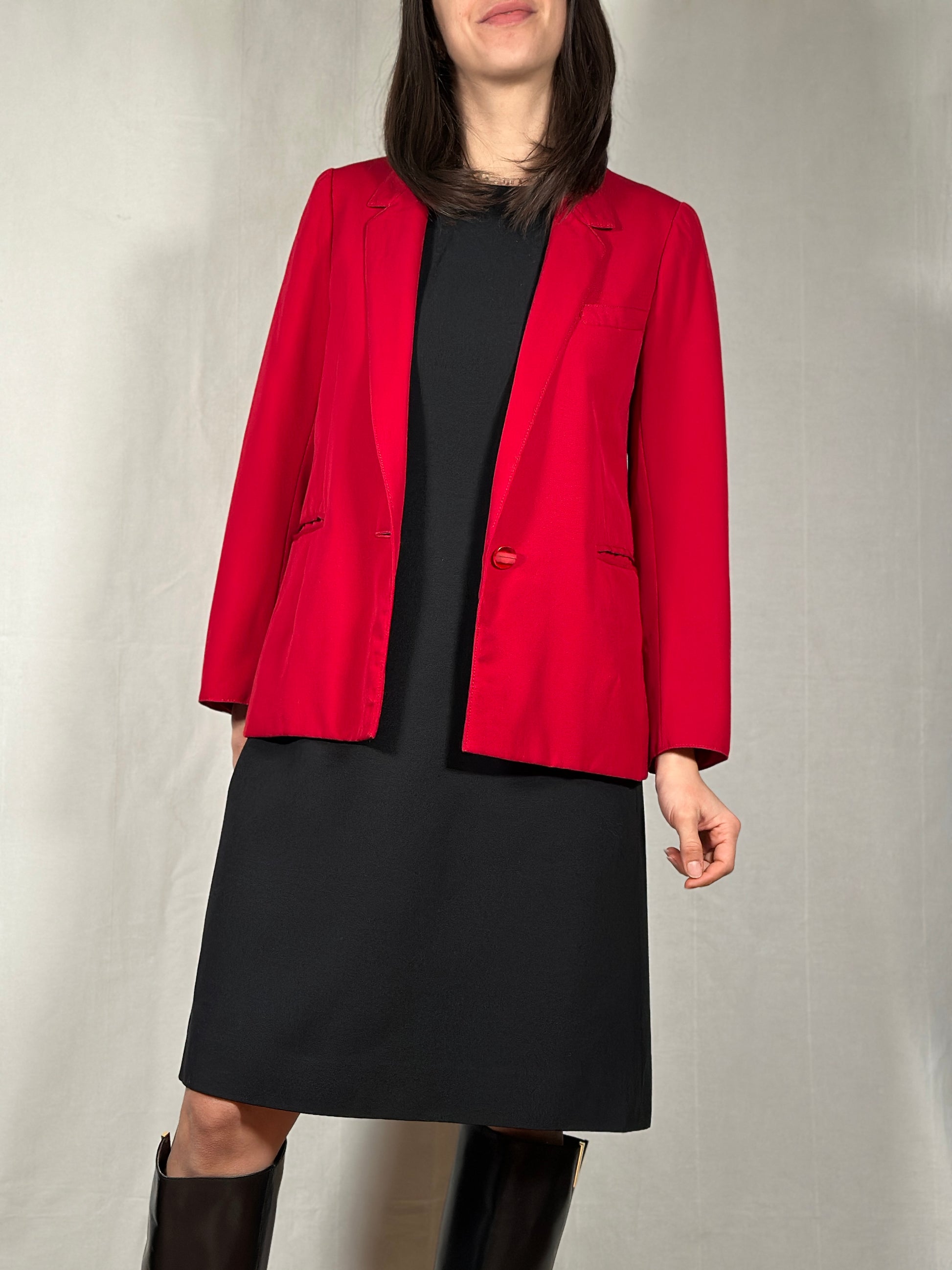 Blazer sartoriale monopetto dei primi anni ‘90 con rever classico e spalline leggermente strutturate in un rosso brillante e freddo.