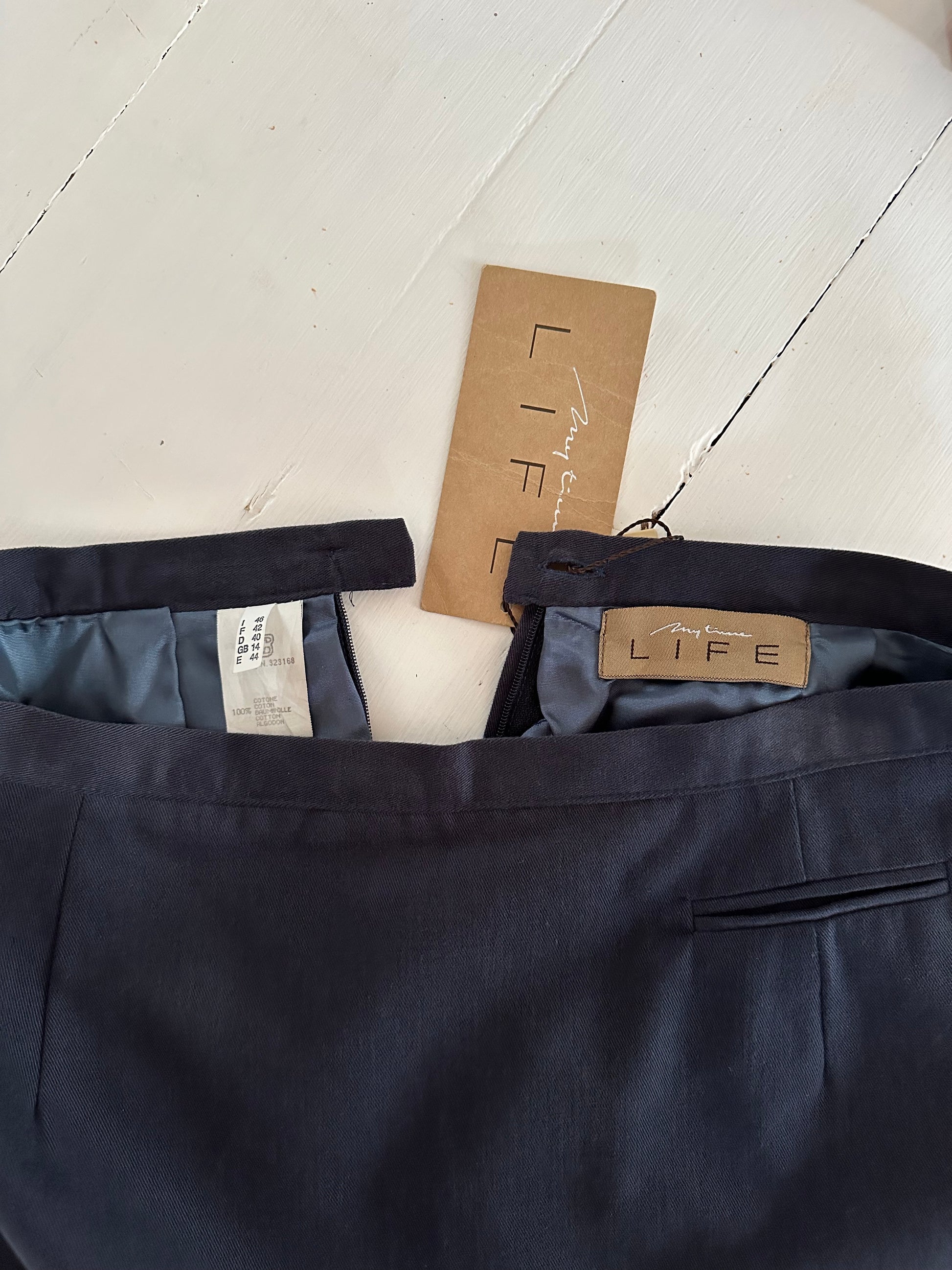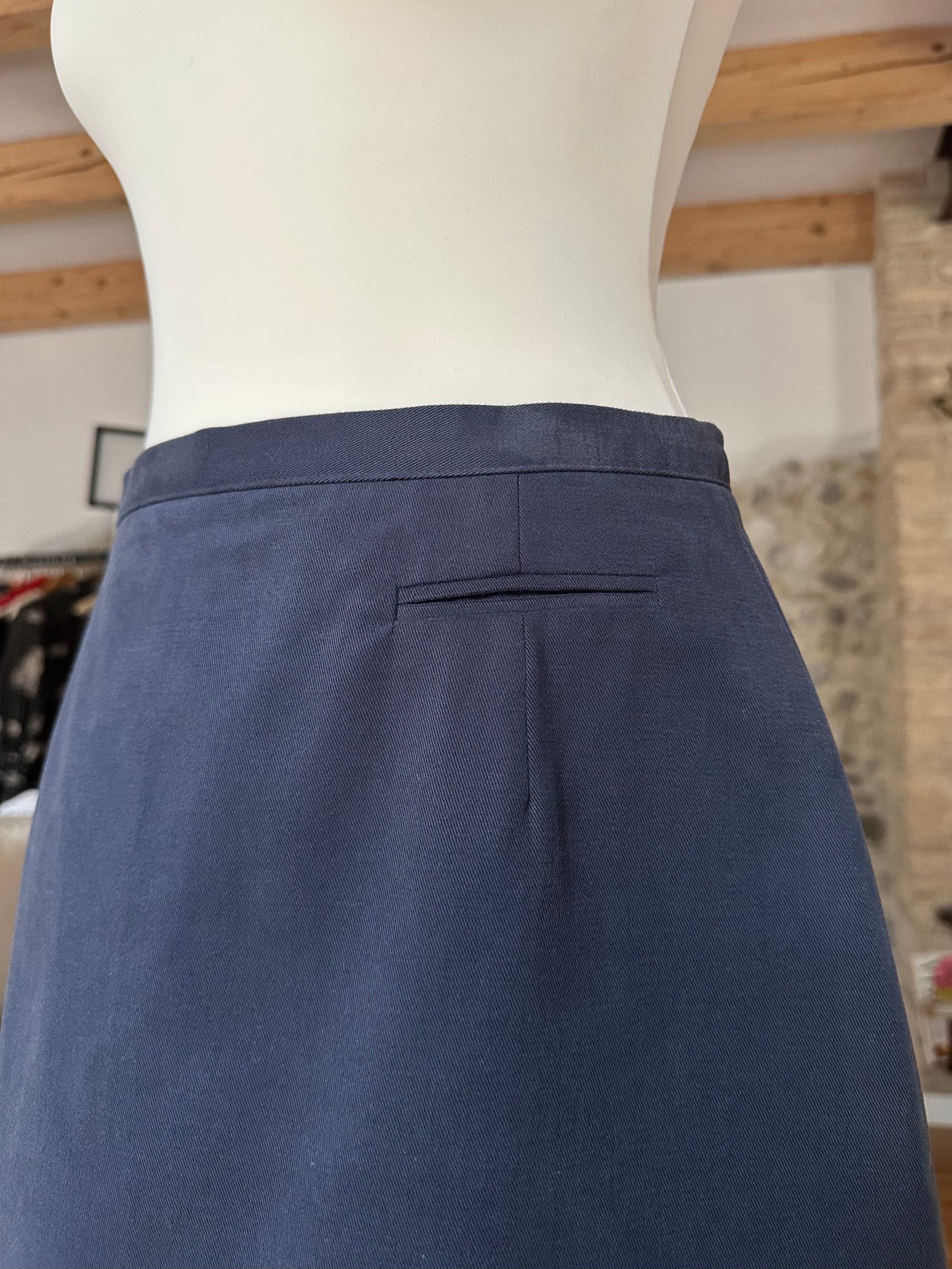 Gonna svasata modello ad A nuova con cartellino, risalente agli anni Novanta. Il tessuto è morbidissimo e vellutato e presenta una taschino decorativo✨ La chiusura è sul retro con zip Lampo e bottone logato.