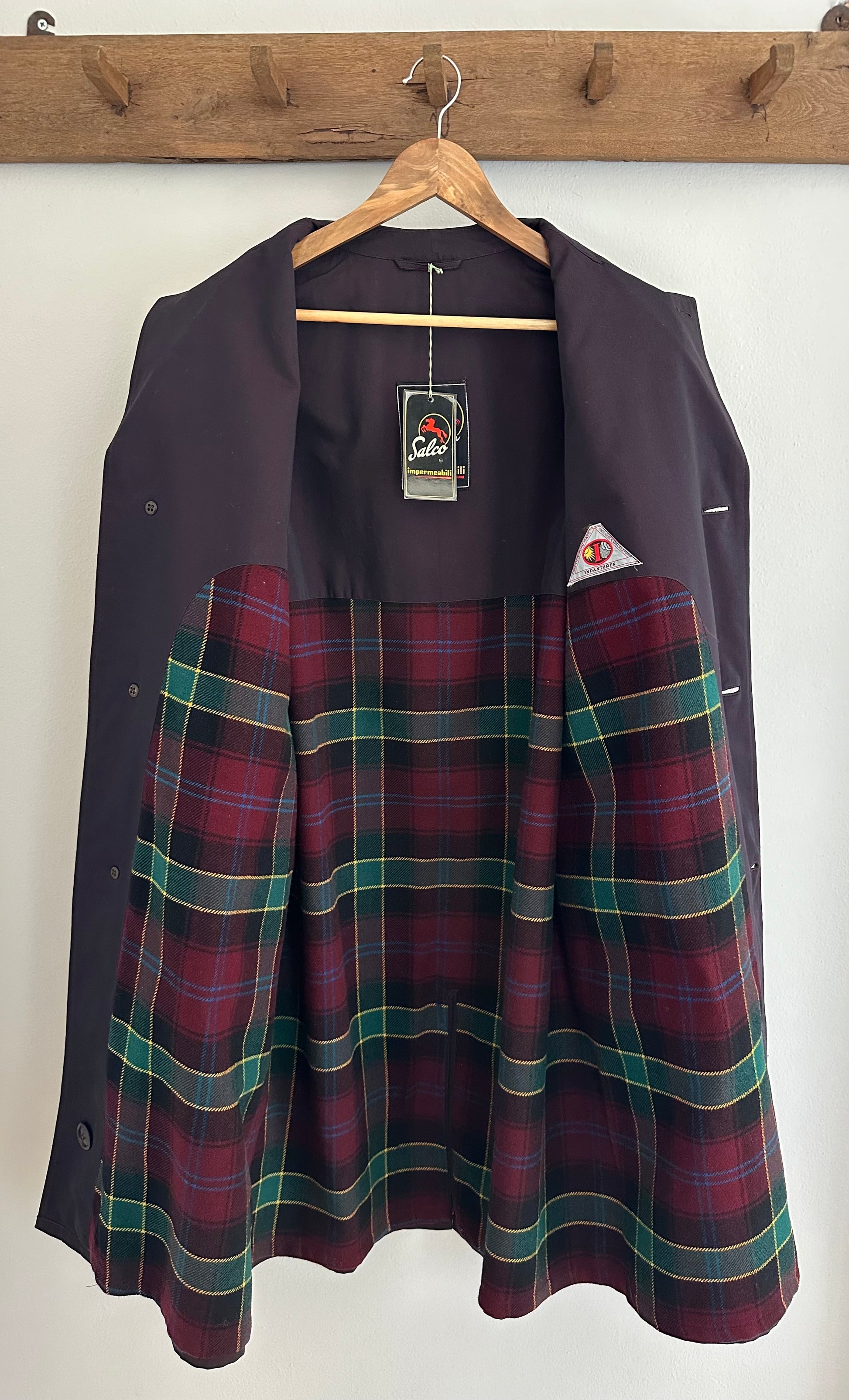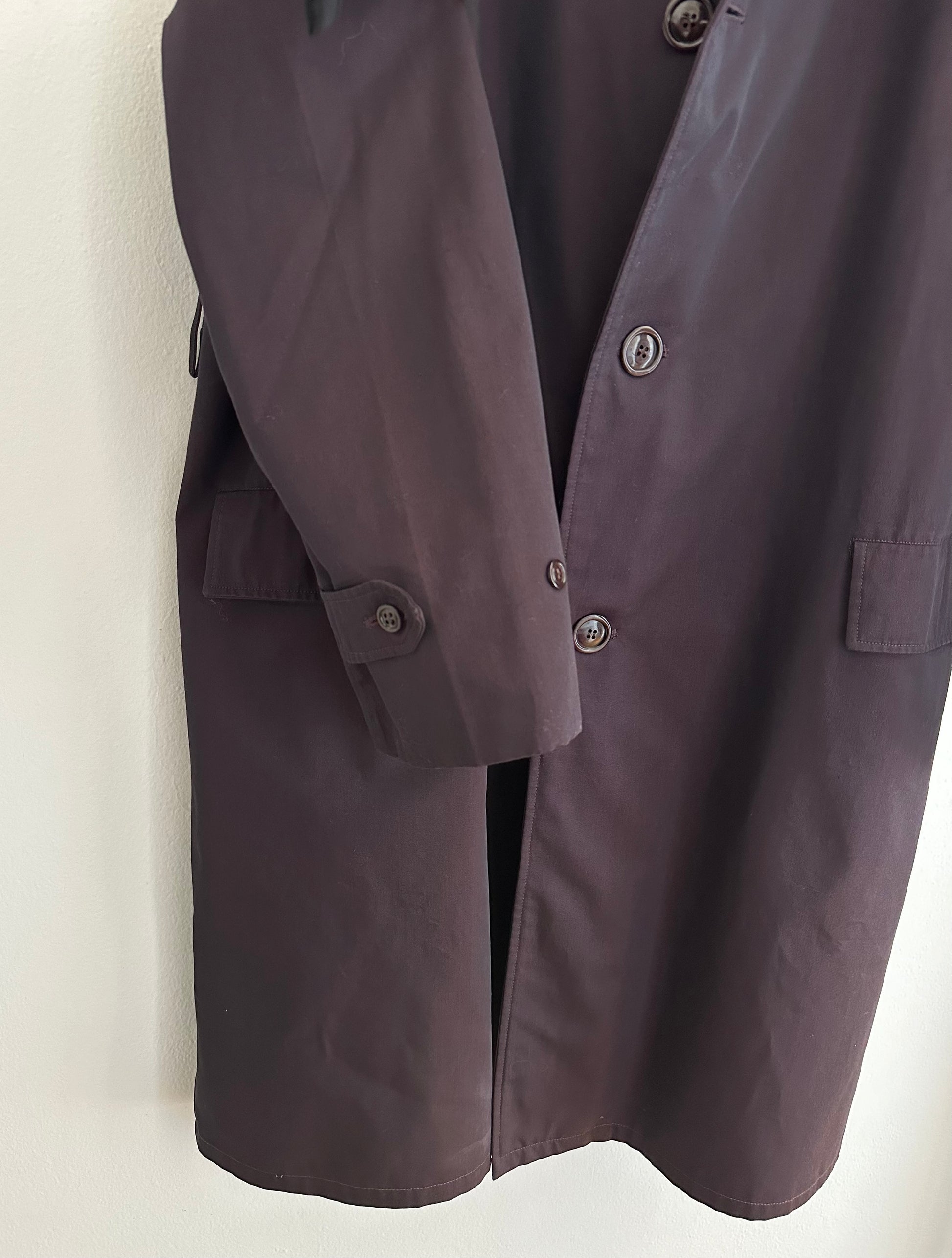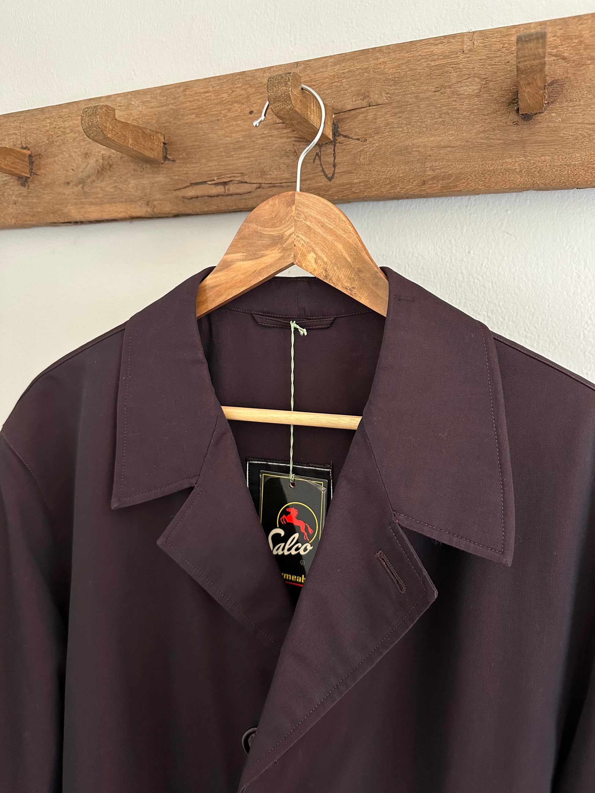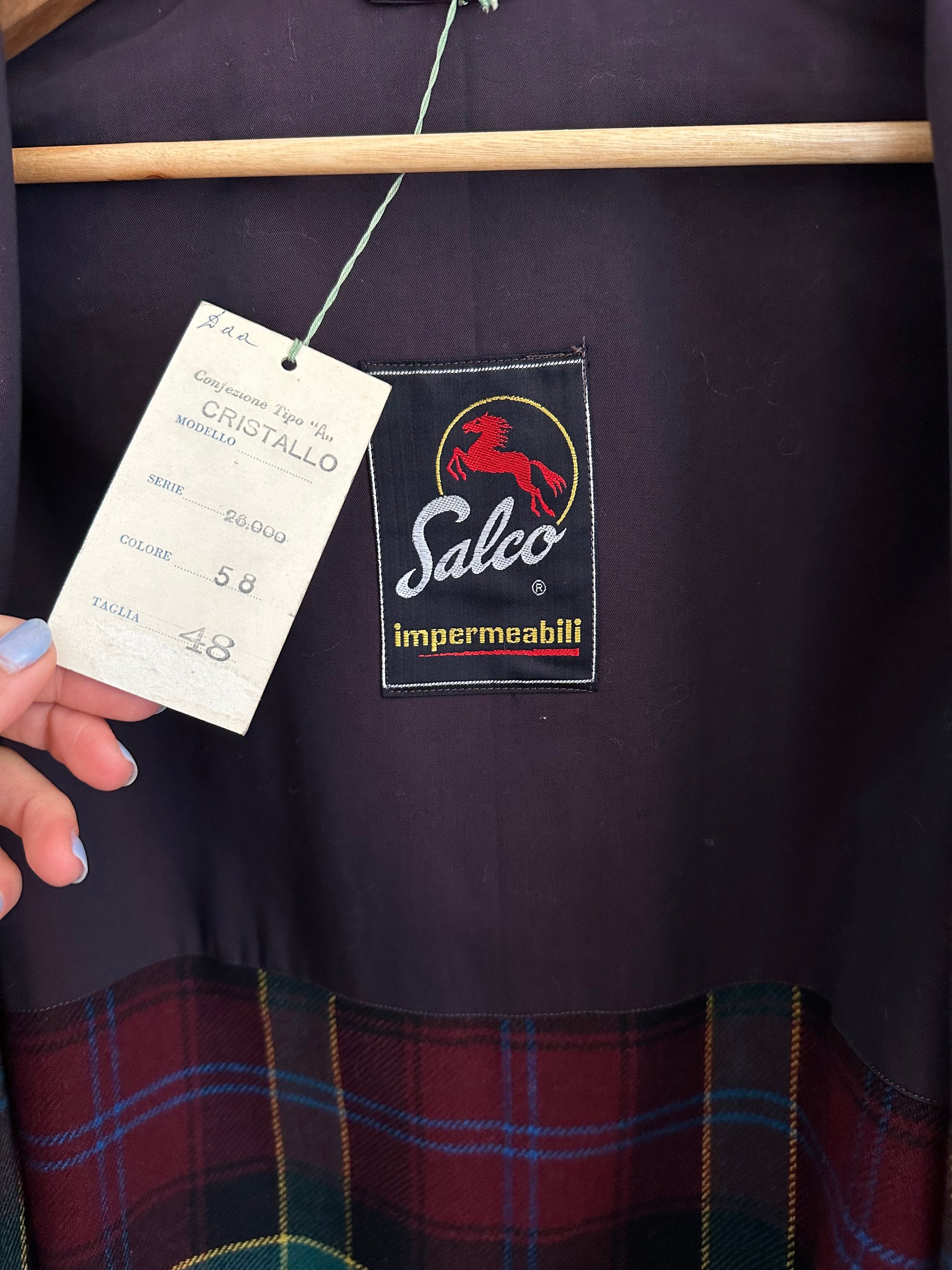 Impermeabile monopetto prodotto da Salco, azienda fondata nel 1951 a Empoli, di un colore viola melanzana iridescente. Fodera in lana in fantasia tartan, tasche con pattina, foderate internamente in flanella di cotone. Chiusura con 3 bottoni, presenta un cinturino sulle maniche e spacco sul retro. Manca la sua cintura originale.