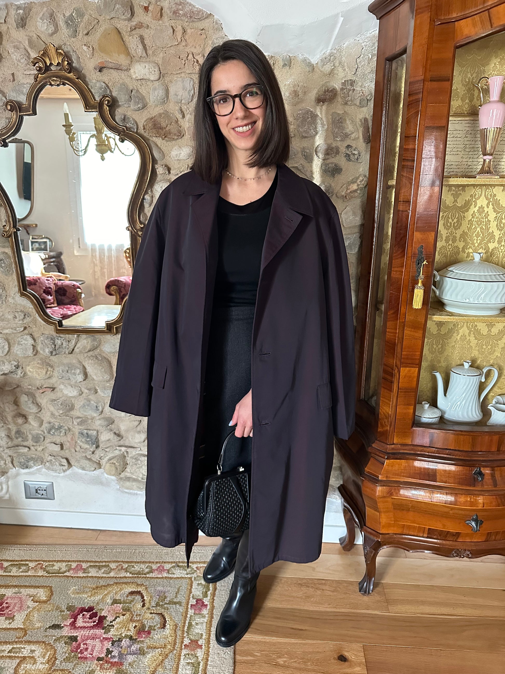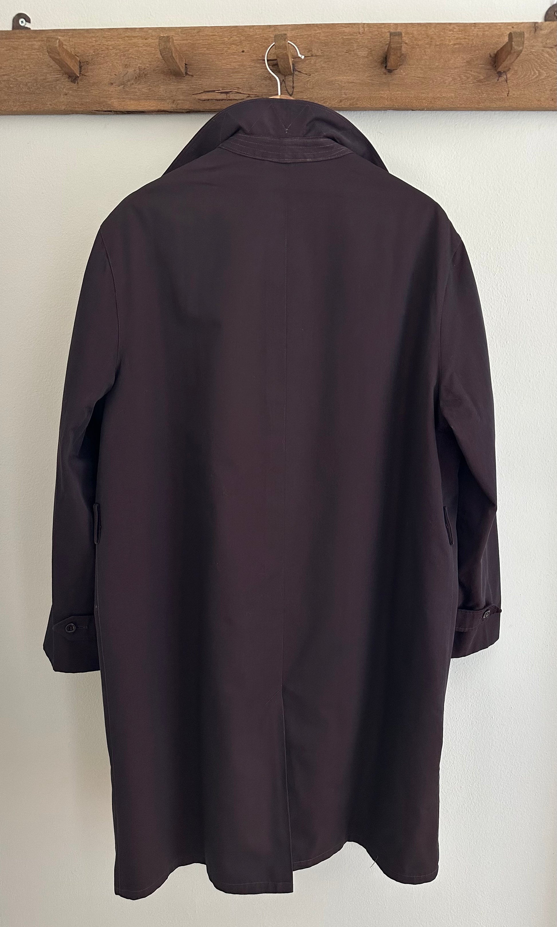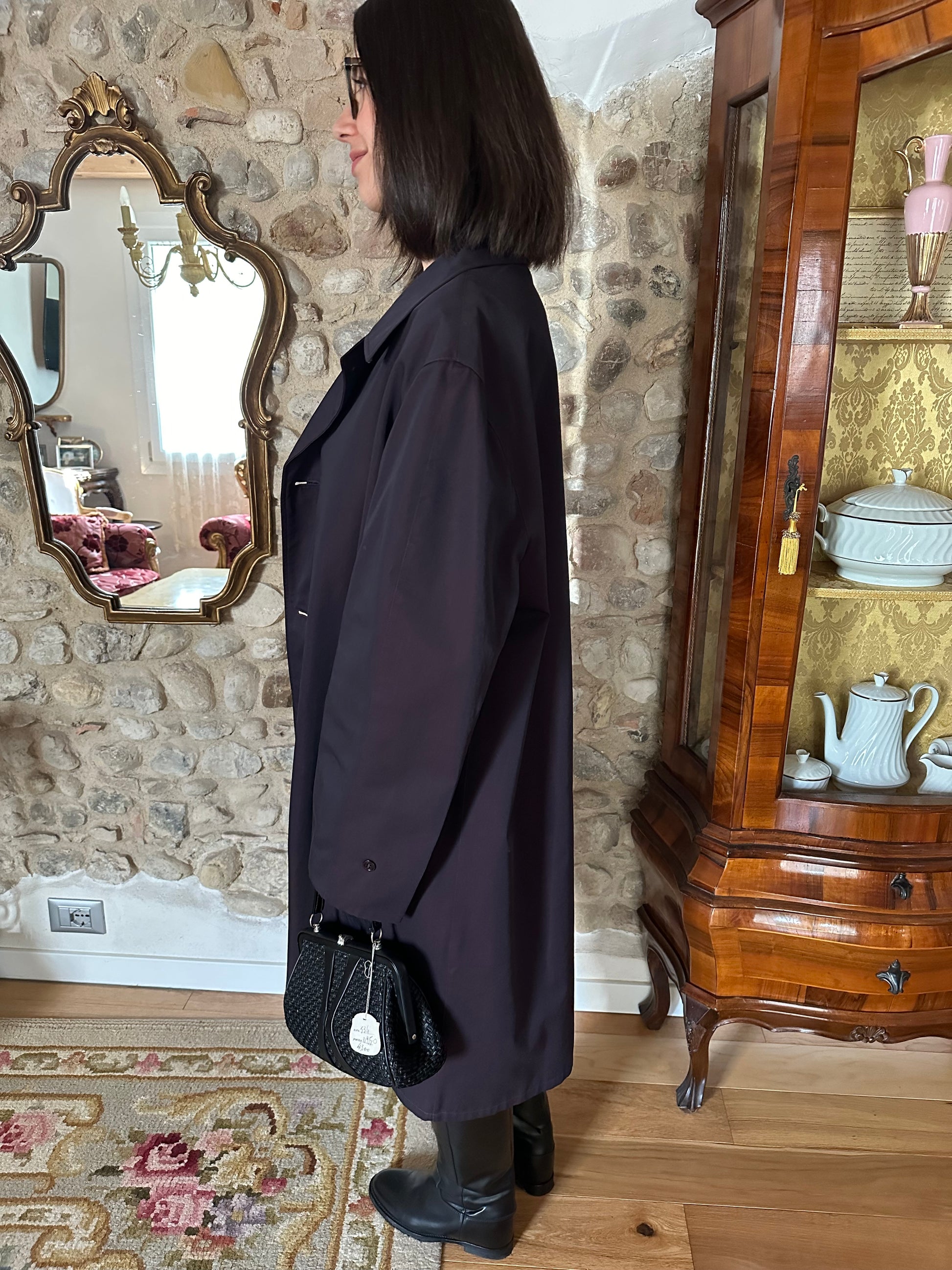 Impermeabile monopetto prodotto da Salco, azienda fondata nel 1951 a Empoli, di un colore viola melanzana iridescente. Fodera in lana in fantasia tartan, tasche con pattina, foderate internamente in flanella di cotone. Chiusura con 3 bottoni, presenta un cinturino sulle maniche e spacco sul retro. Manca la sua cintura originale.