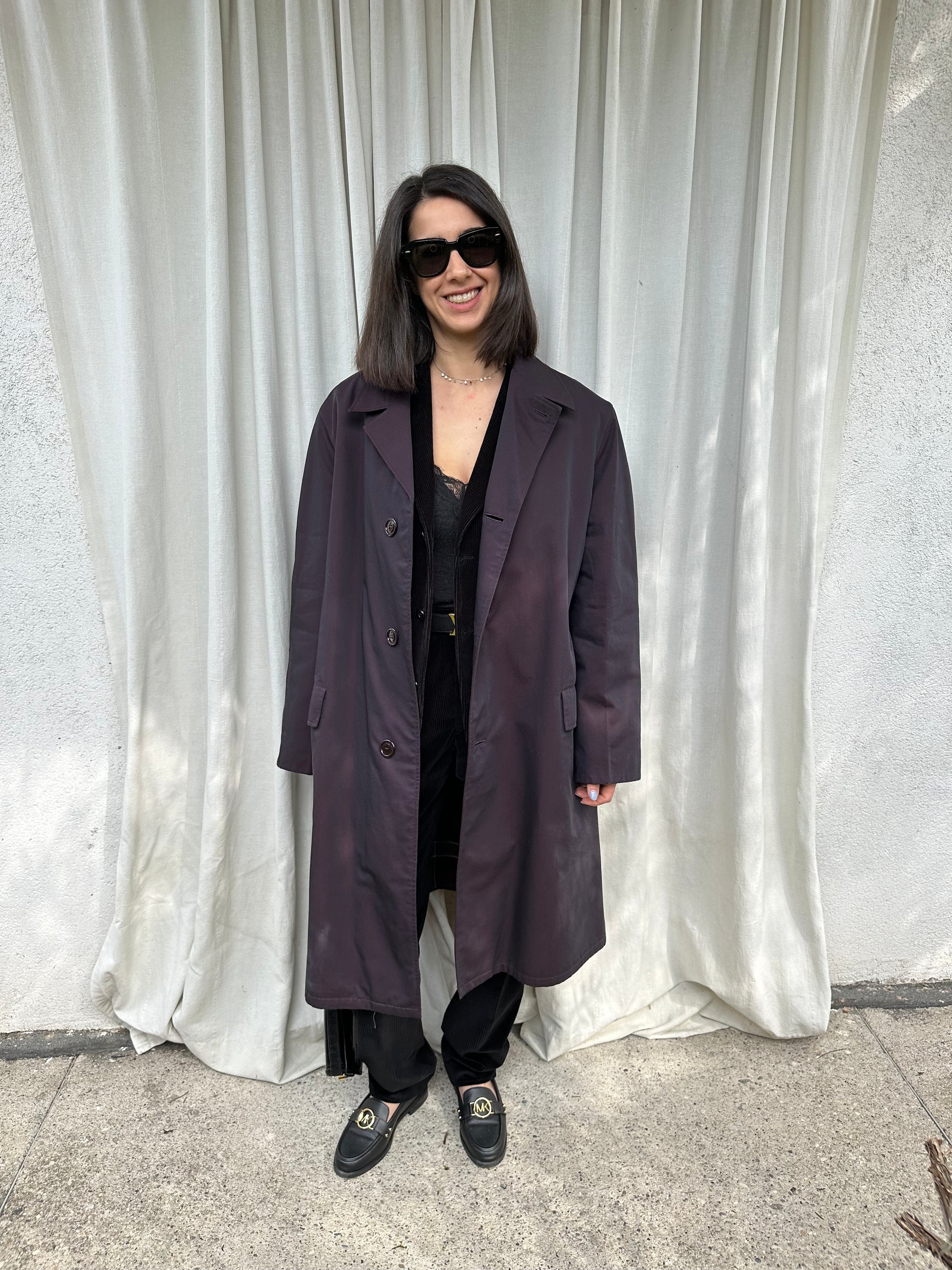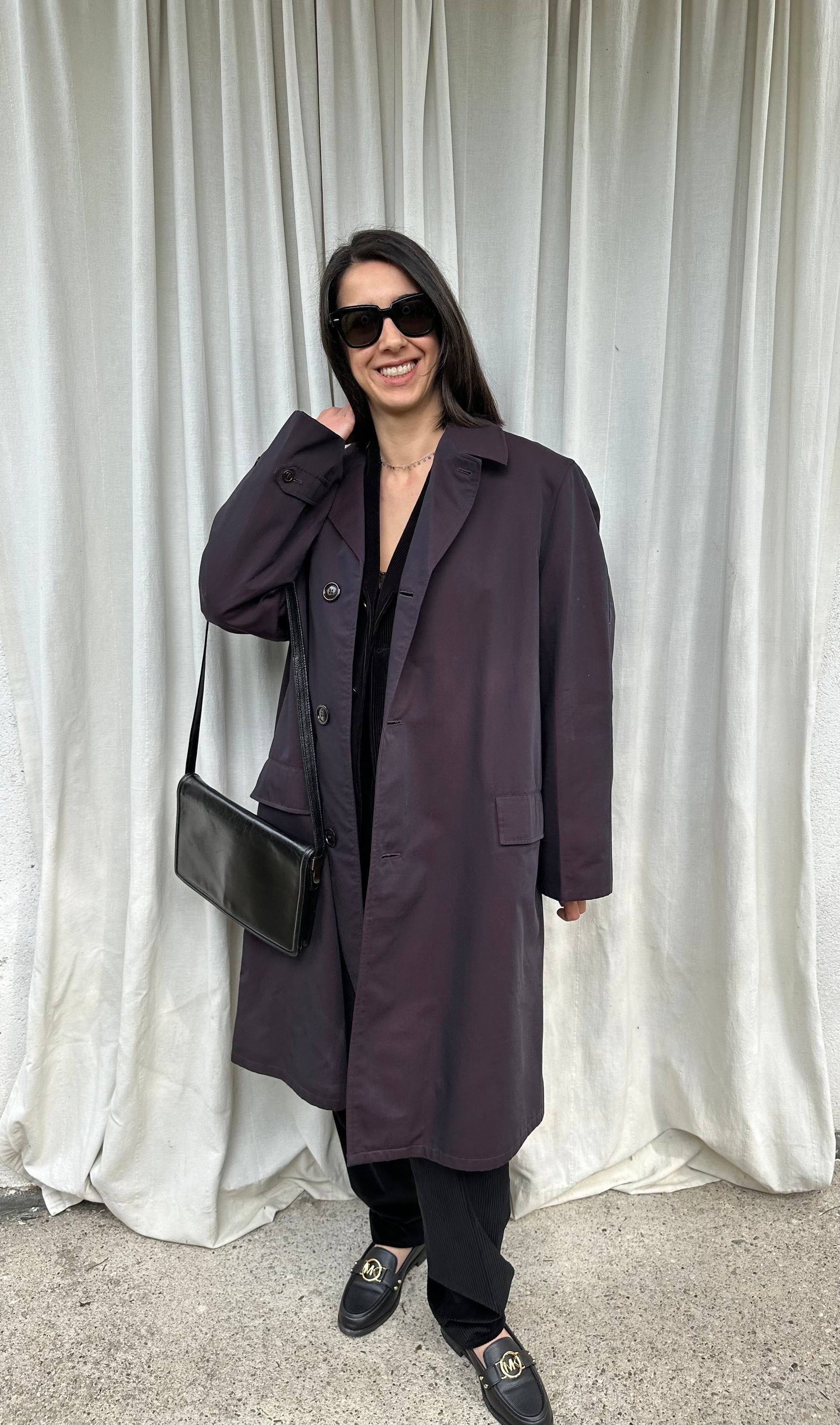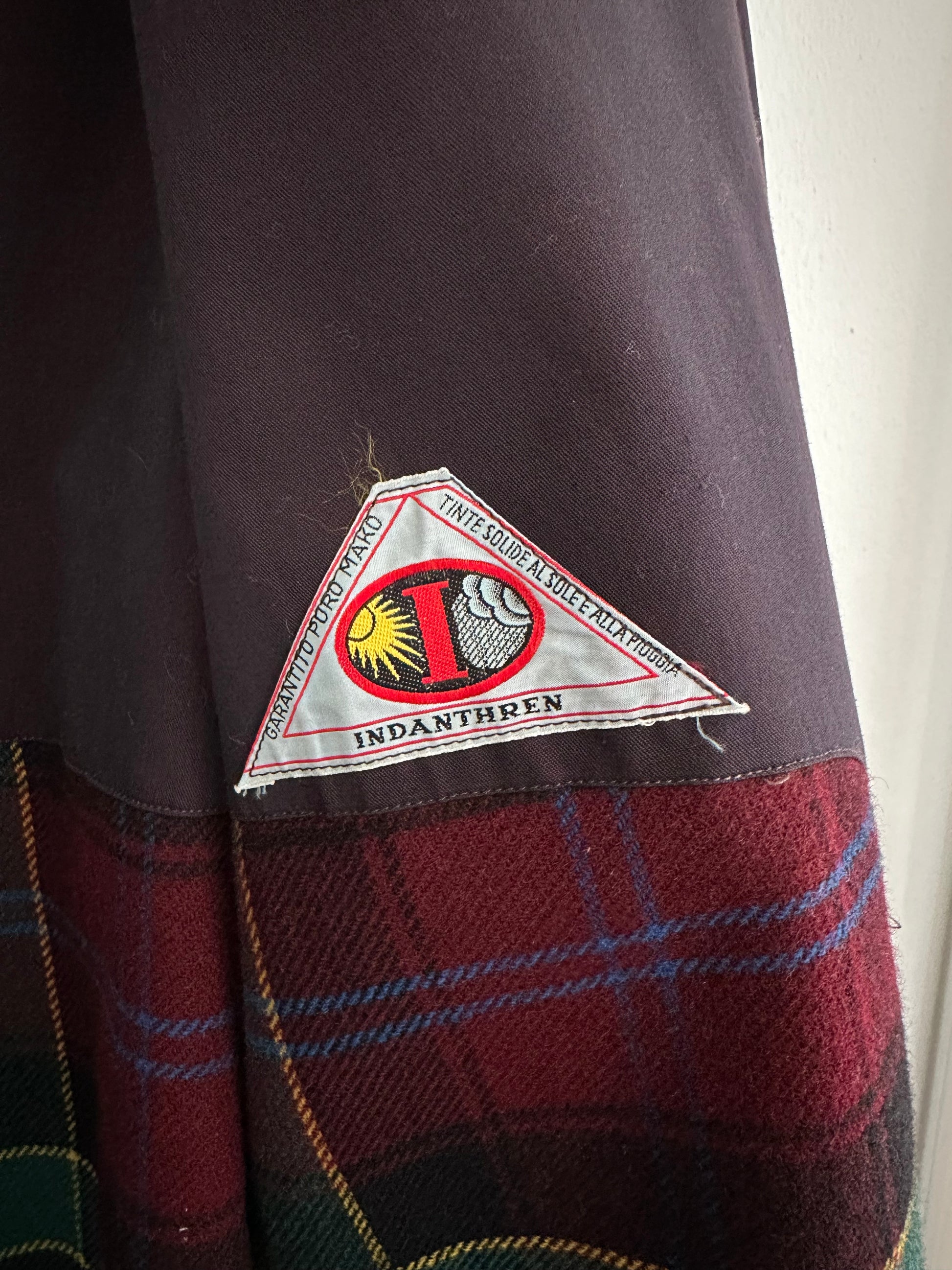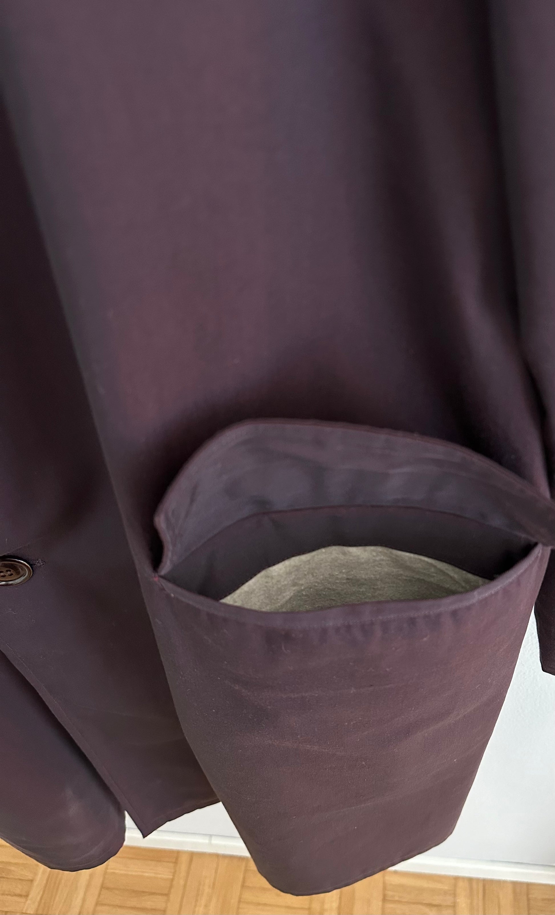 Impermeabile monopetto prodotto da Salco, azienda fondata nel 1951 a Empoli, di un colore viola melanzana iridescente. Fodera in lana in fantasia tartan, tasche con pattina, foderate internamente in flanella di cotone. Chiusura con 3 bottoni, presenta un cinturino sulle maniche e spacco sul retro. Manca la sua cintura originale.