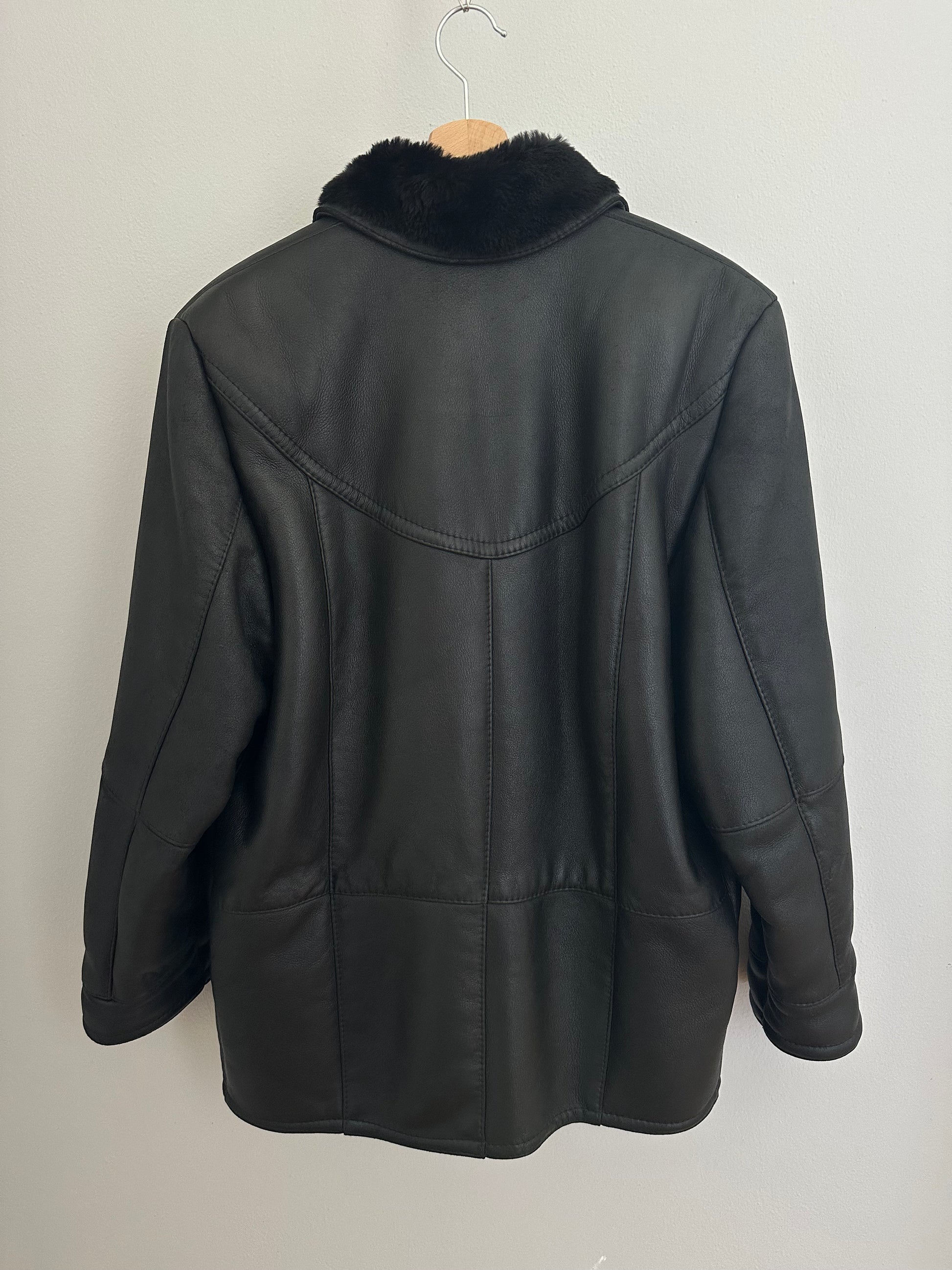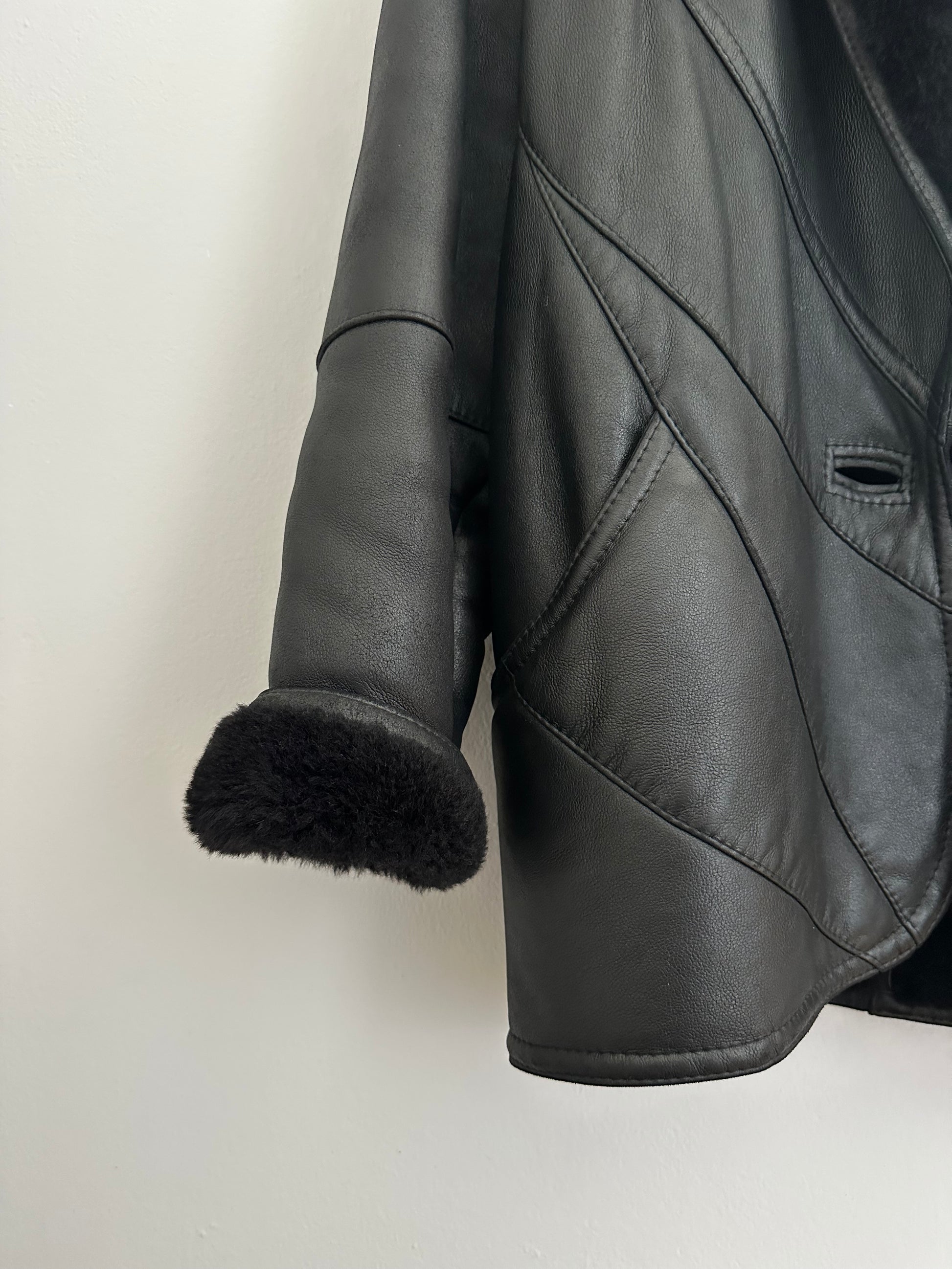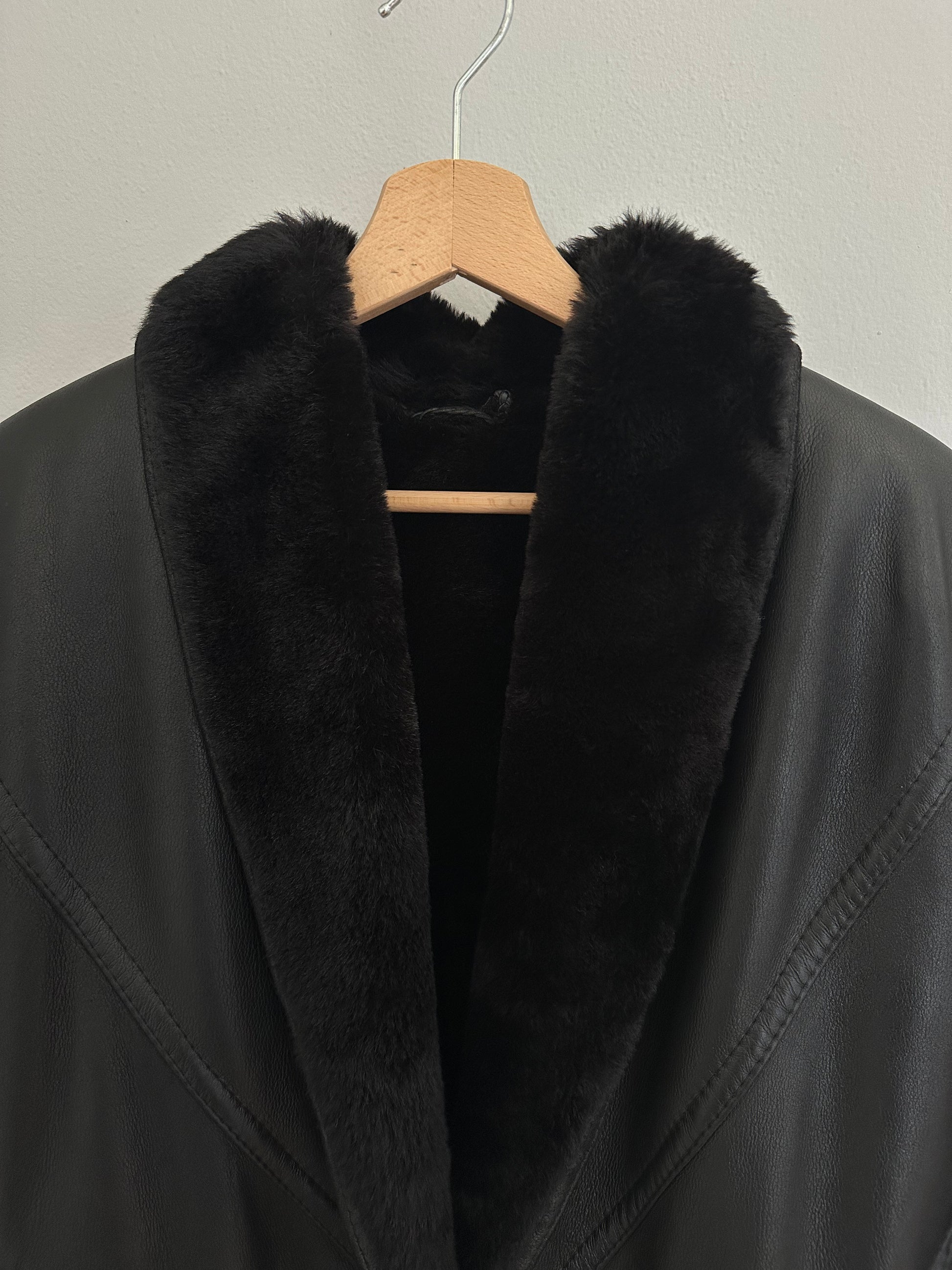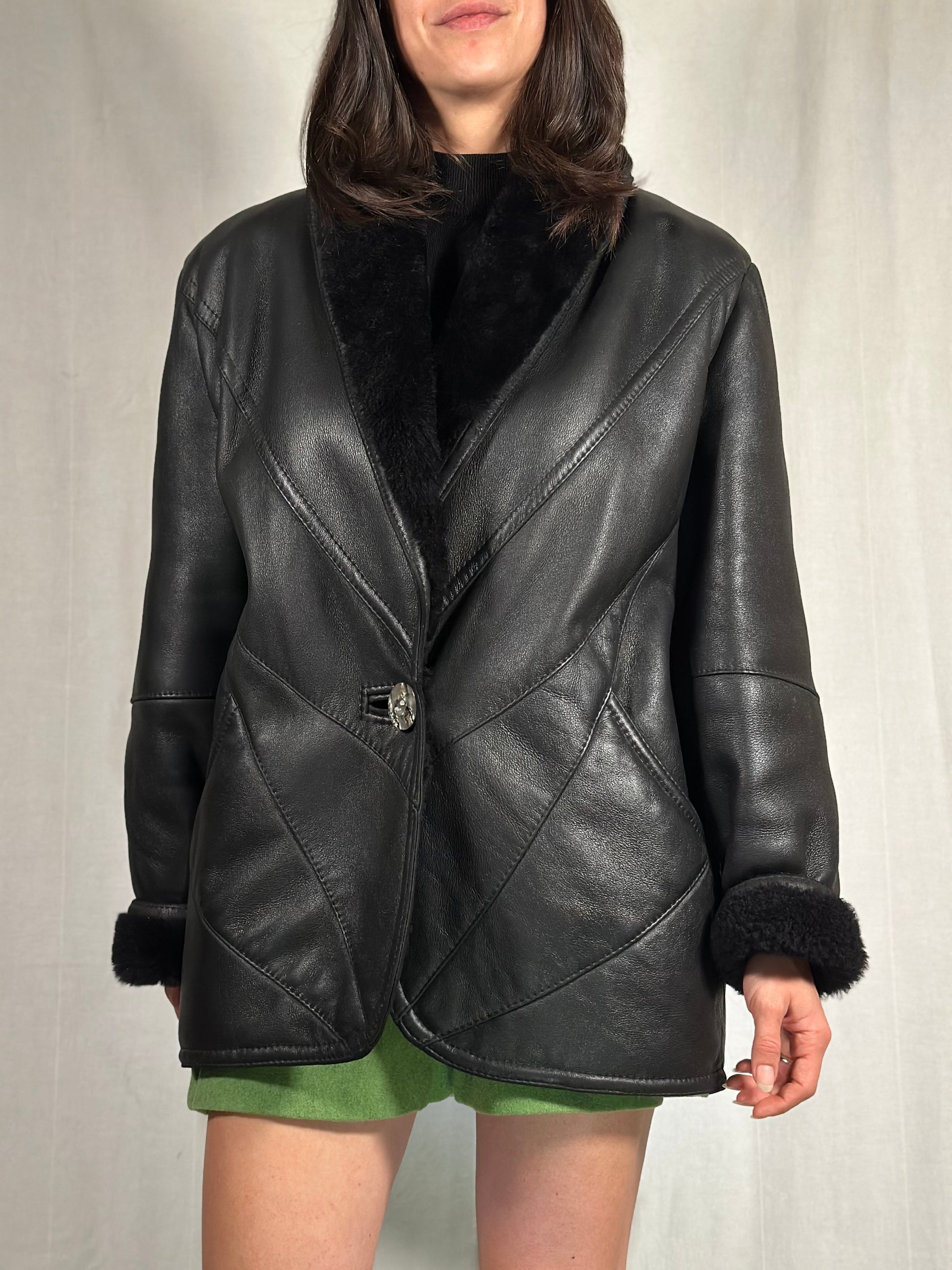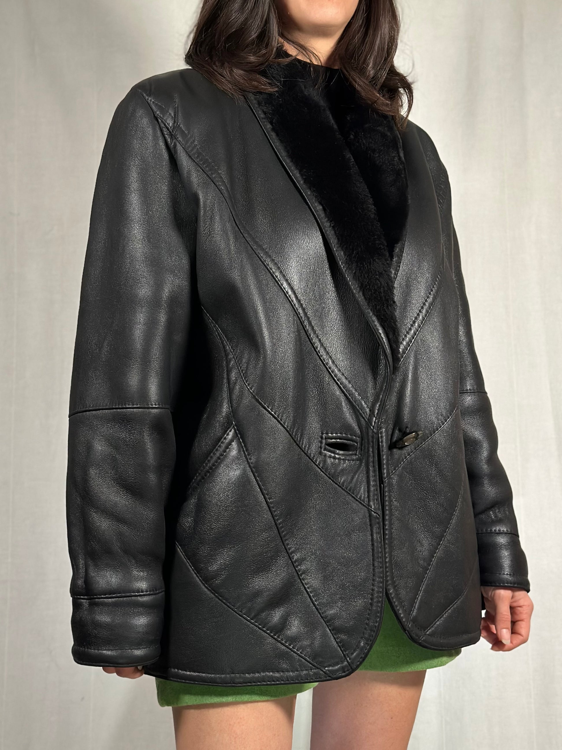 Un capo iconico: giaccone vintage in vera pelle nera con interno in morbido montone sempre nero, avvolgente e caldo.