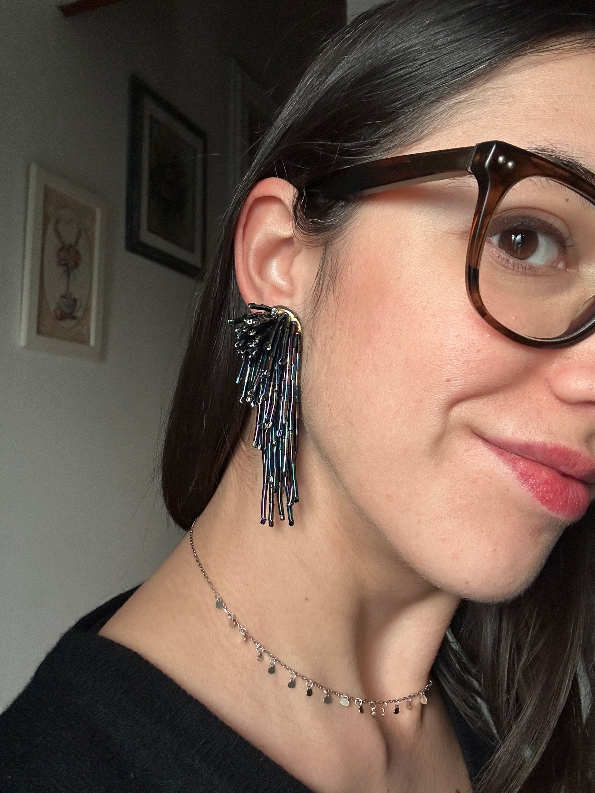 Le perline sono montate su fili più corti sul lobo e man mano che scendono i fili diventano più lunghi, creando un’effetto cascata.