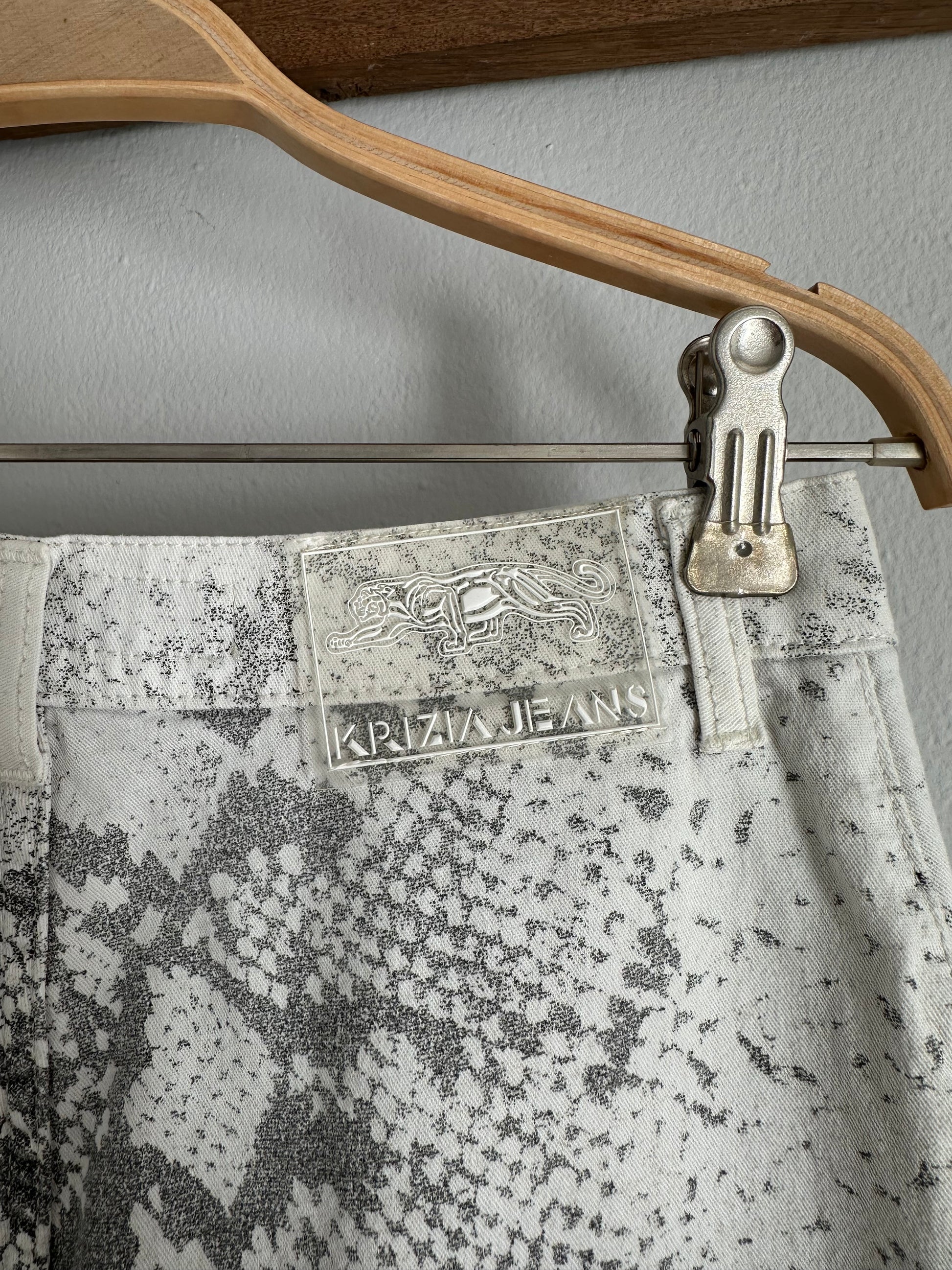 Pantalone Krizia Jeans risalente agli anni Novanta, in stampa super trendy pitonata nei toni del grigio su fondo bianco che sfuma diventando beige sull’orlo. Modello a vita alta e con gamba dritta. Chiusura con cerniera e bottone logato argentato con l’immancabile tigre in rilievo, simbolo del brand. Tutti i rivetti del pantalone sono teste di tigre! 🐯 Presenta passanti per la cintura e l’etichetta posteriore in gomma trasparente con il logo e la tigre. Un pezzo super wow✨