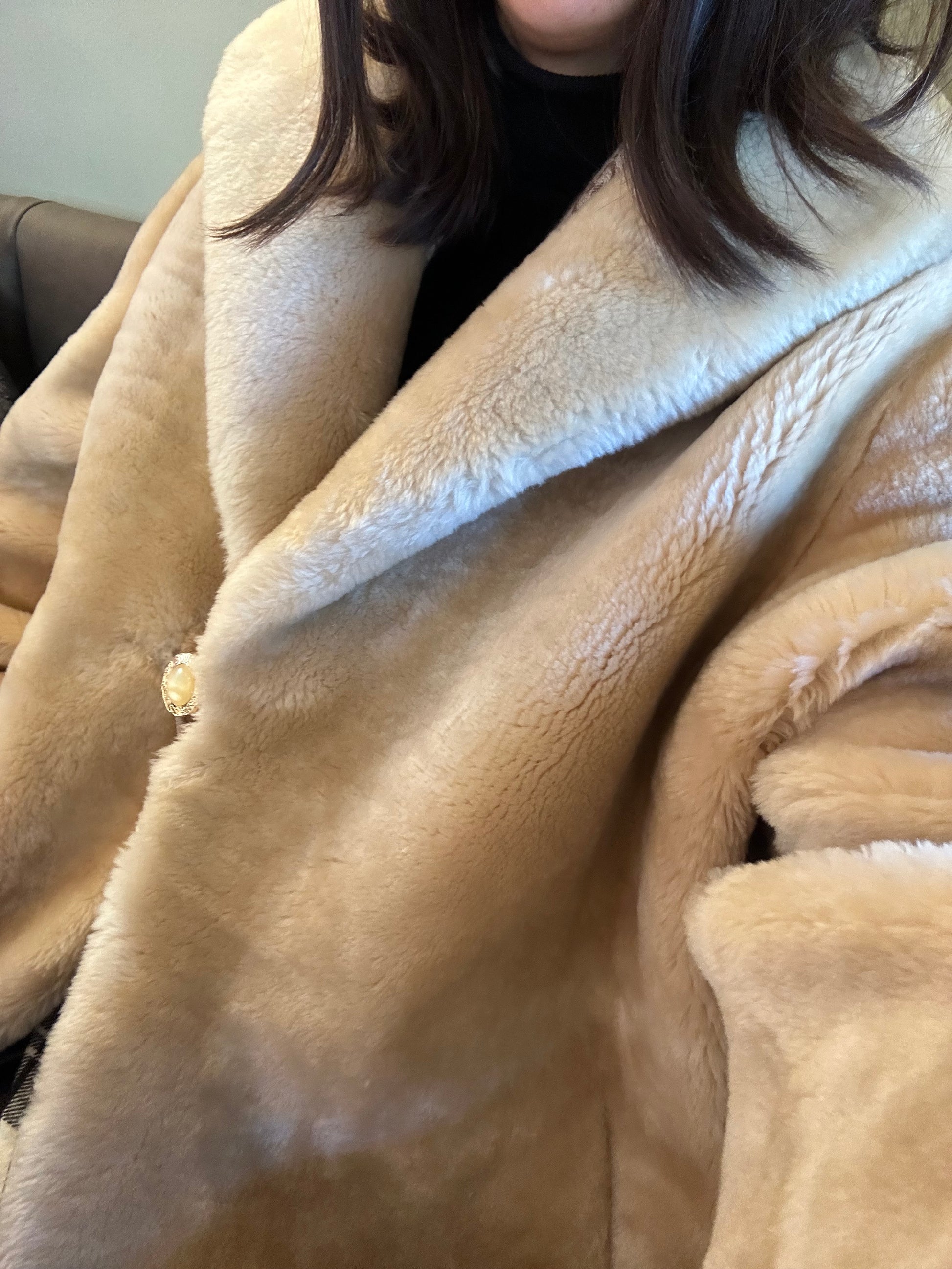 Pelliccia anni Ottanta in vero agnello rasato dal taglio ampio e vaporoso della Pellicceria Nicola di Levada di Ponte di Piave. Lunghezza metà coscia con collo ampio e tasche laterali a filetto foderate in pelle e tessuto. Chiusura con asola in pelle e bottone all’altezza del petto. Non è leggera ma indossandola non ci si fa caso✨