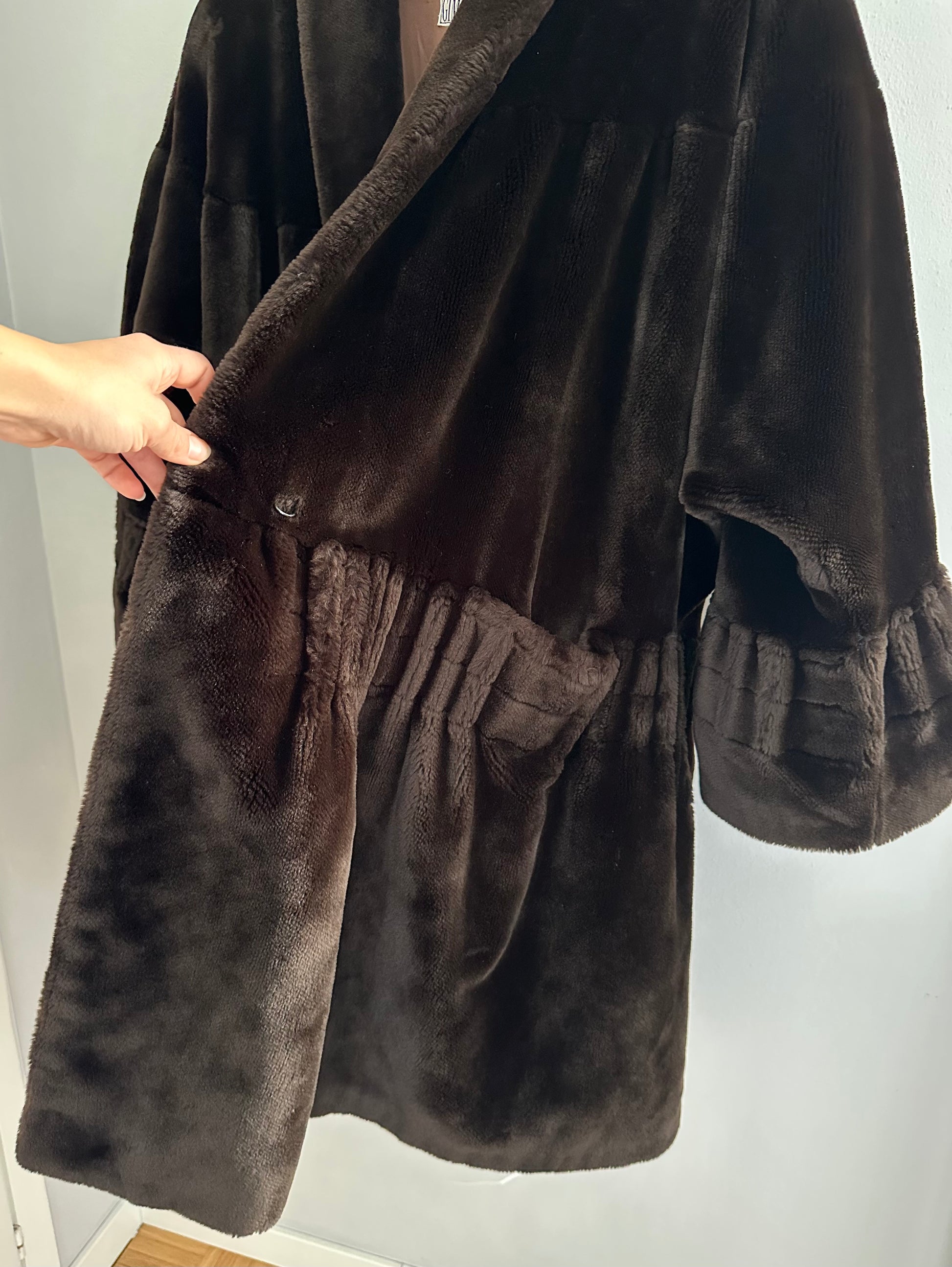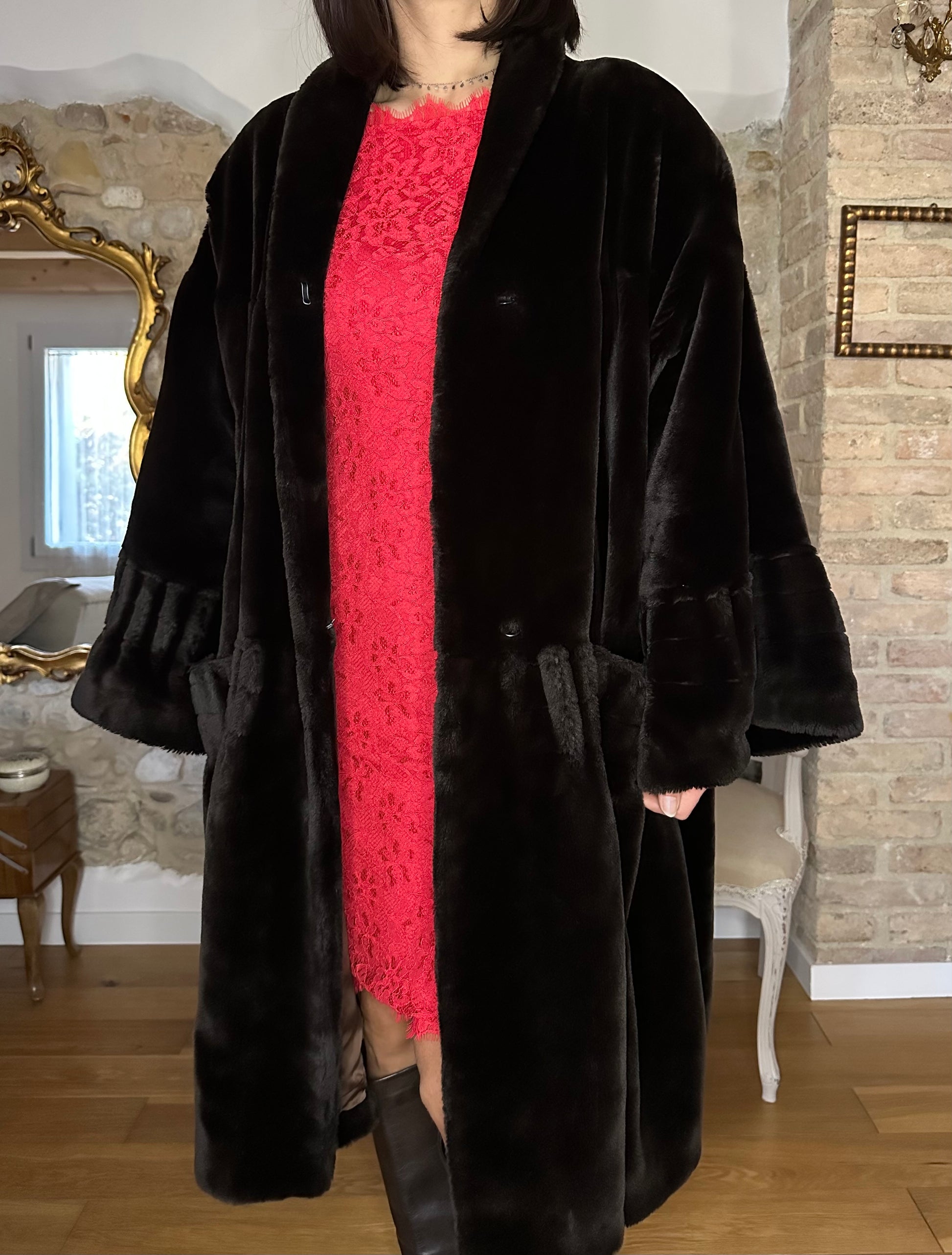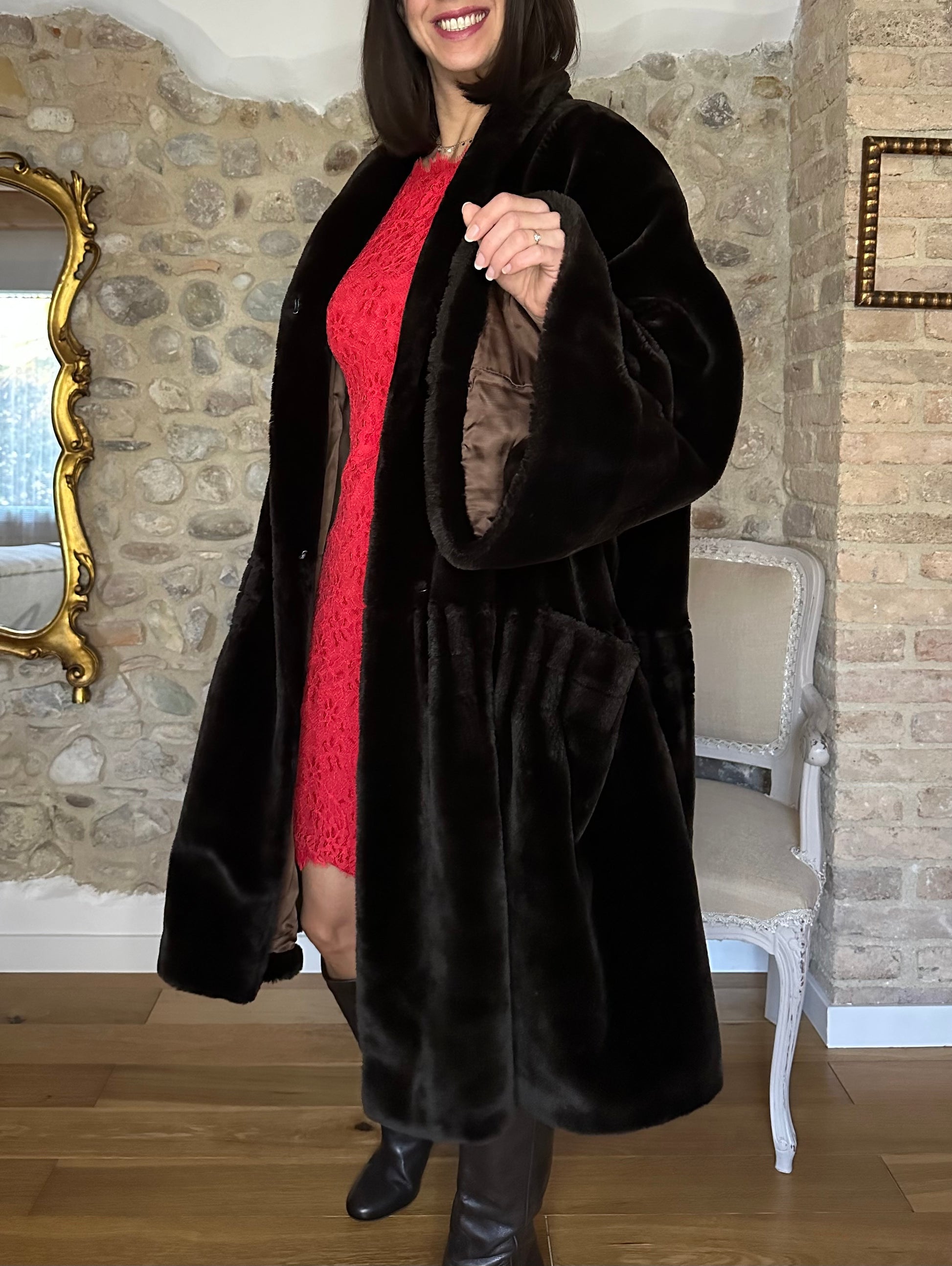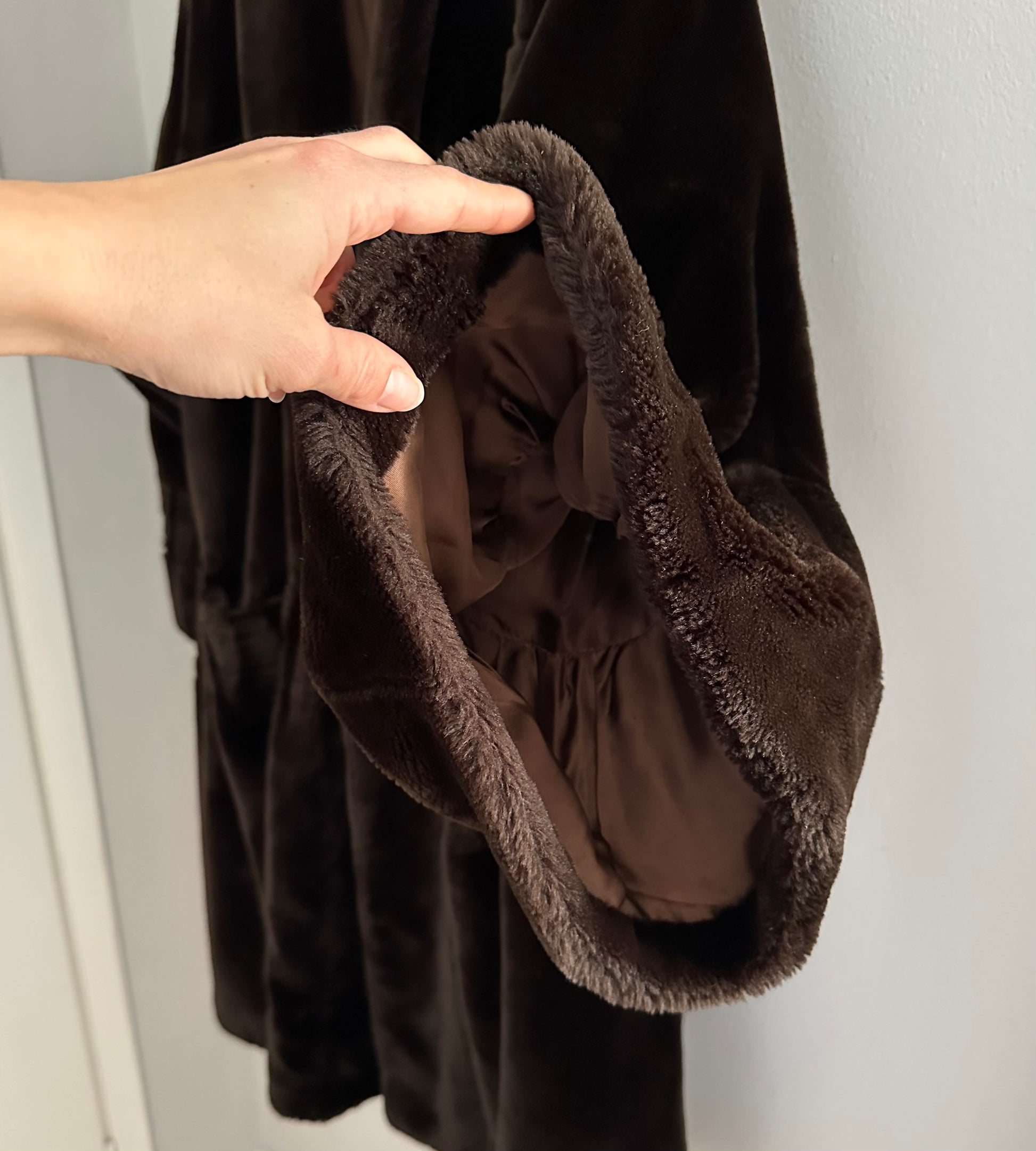 Pelliccia a mantello ampissima, morbida e avvolgente risalente agli anni Ottanta in un marrone molto scuro. Lunghezza media con maniche che finiscono a campana. Presenta spalline leggermente imbottite e chiusura senza bottoni ma con due ganci. La fodera interna è tutta bordata da passamaneria.
