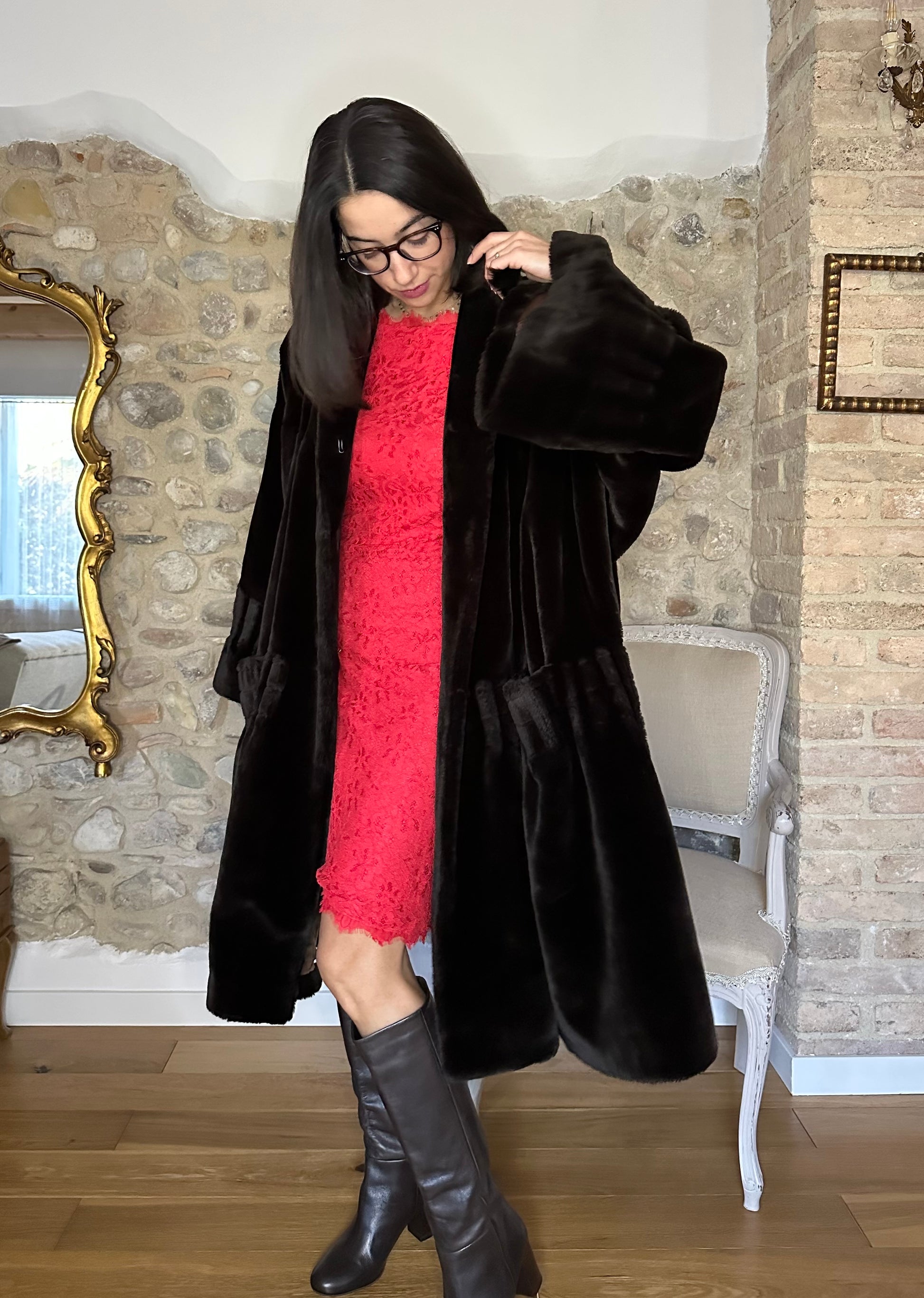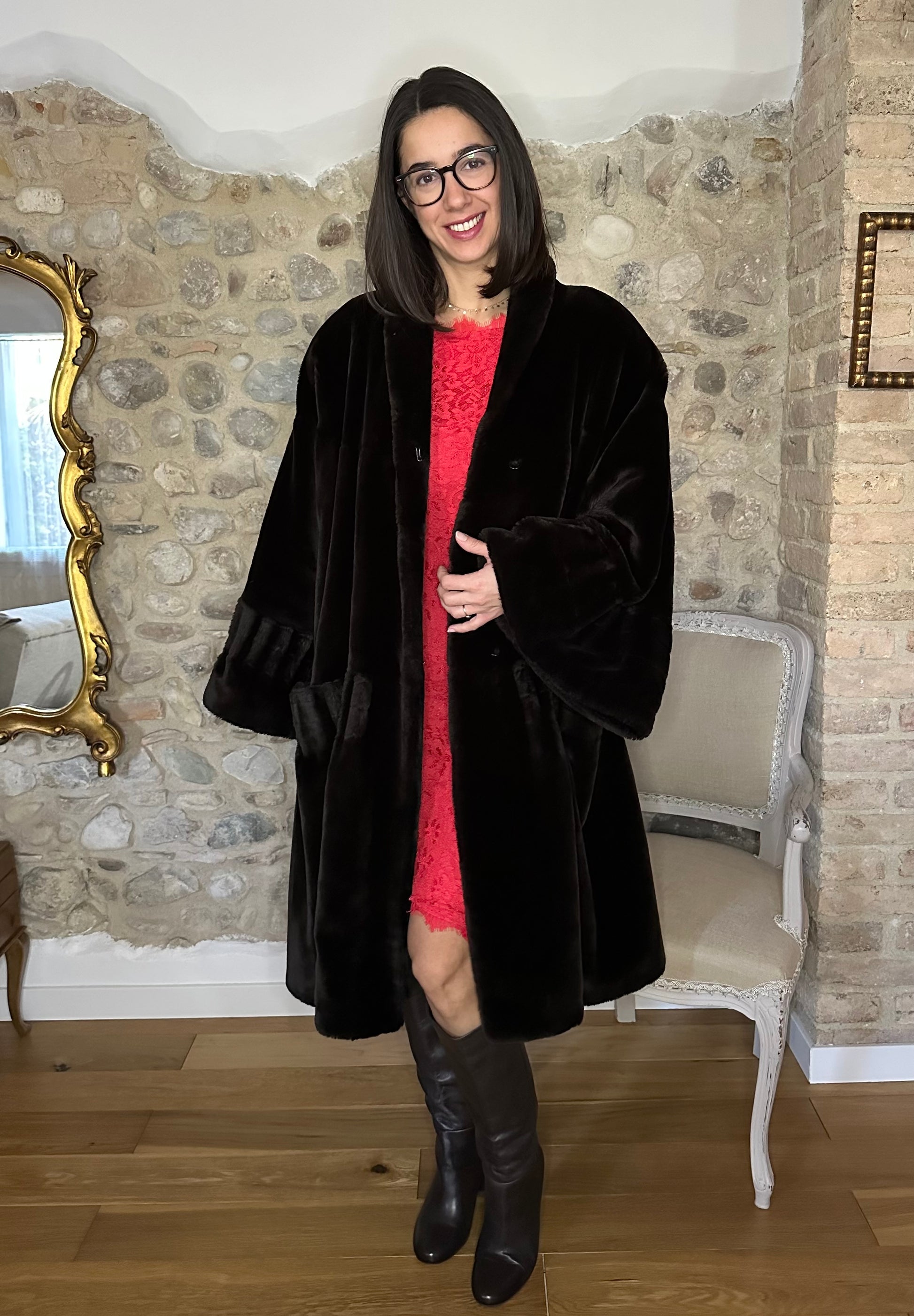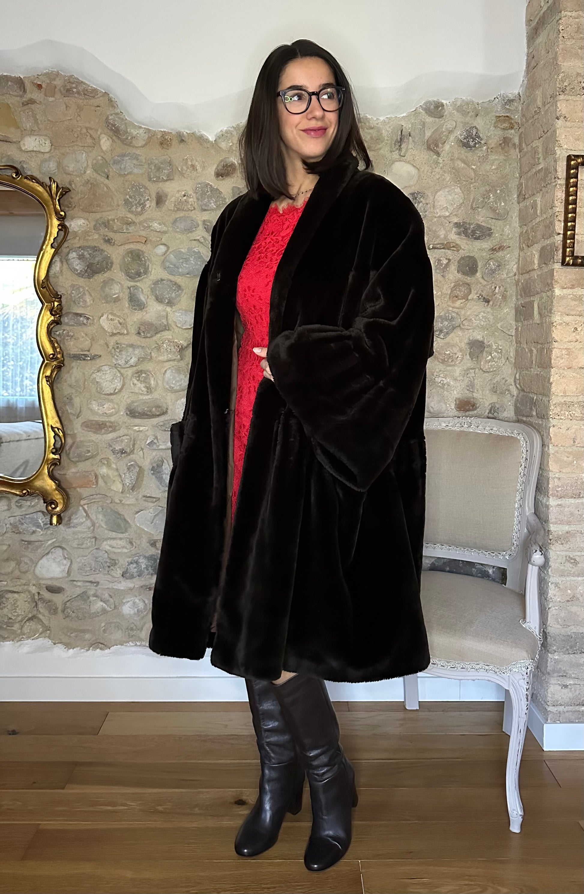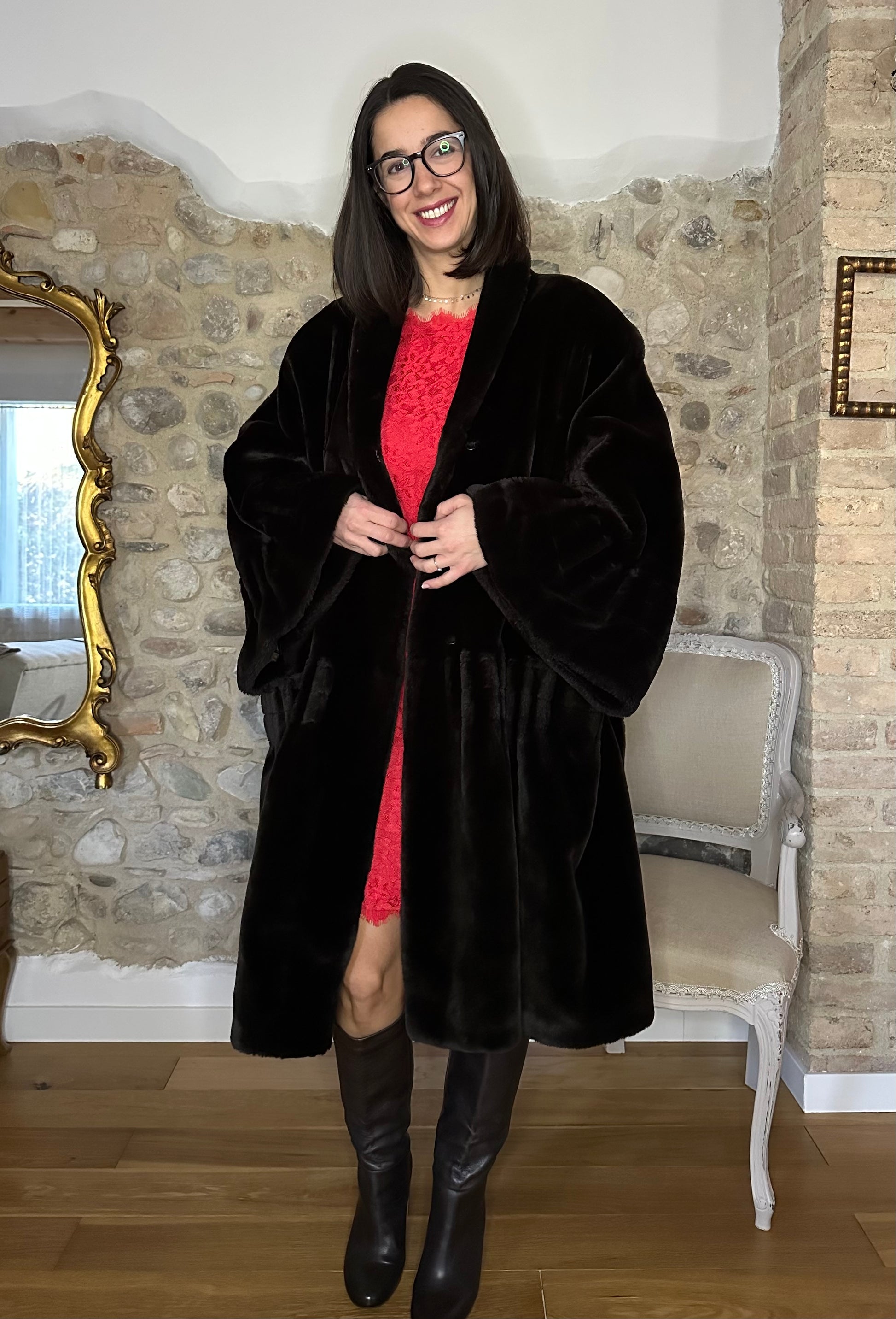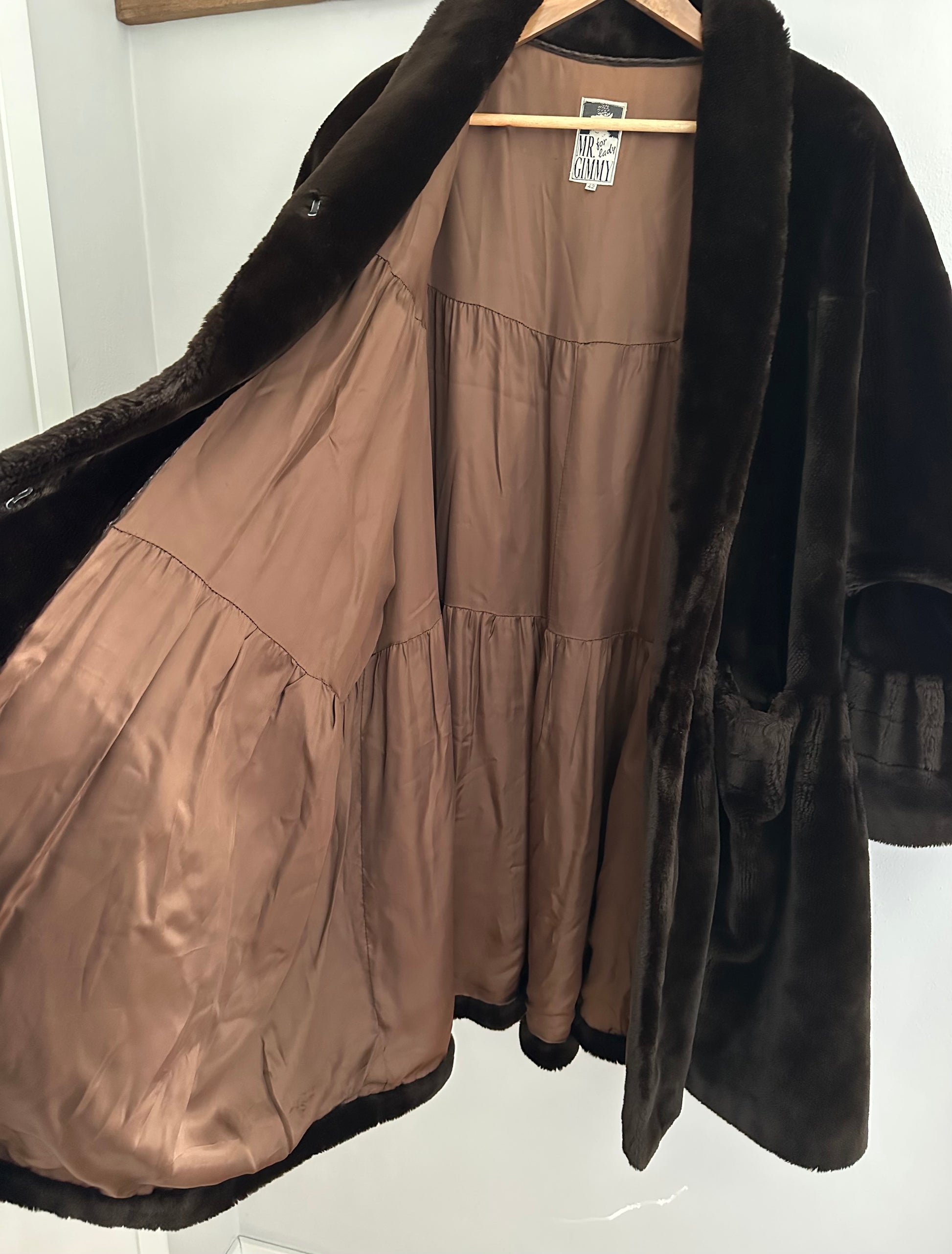 Pelliccia a mantello ampissima, morbida e avvolgente risalente agli anni Ottanta in un marrone molto scuro. Lunghezza media con maniche che finiscono a campana. Presenta spalline leggermente imbottite e chiusura senza bottoni ma con due ganci. La fodera interna è tutta bordata da passamaneria.