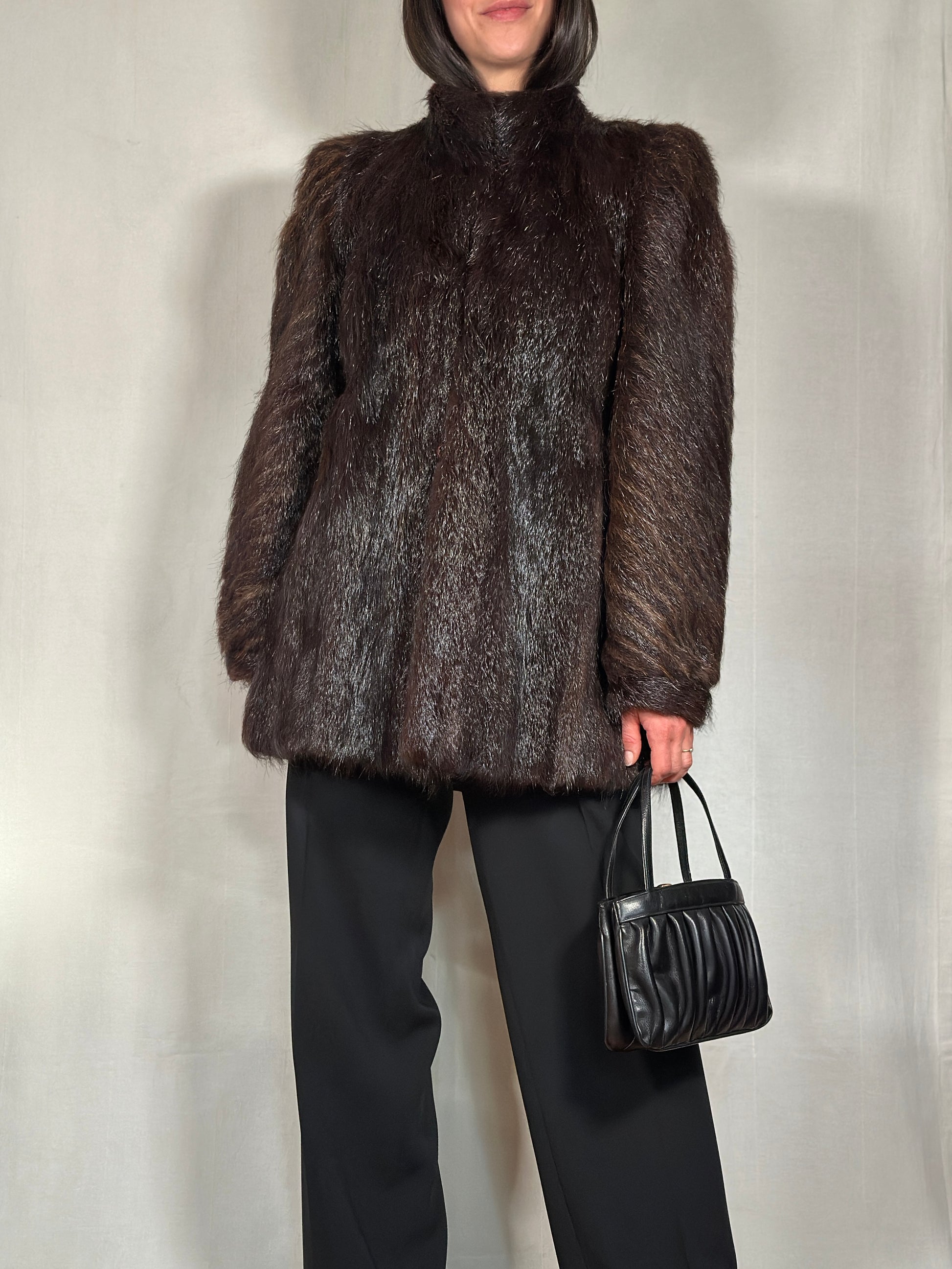 Giaccone in lucente pelliccia di marmotta marrone, modello corto svasato vintage anni ‘70.