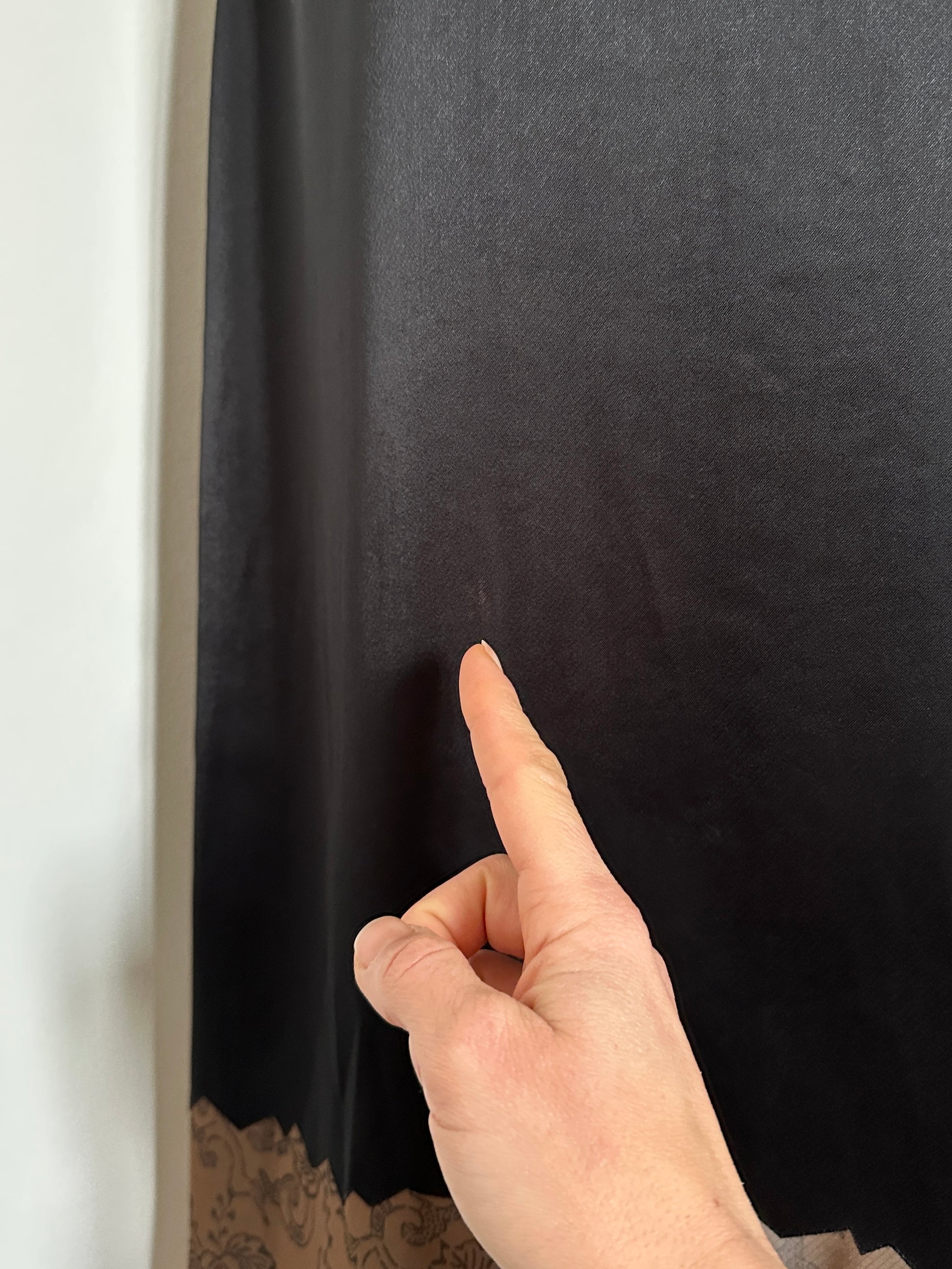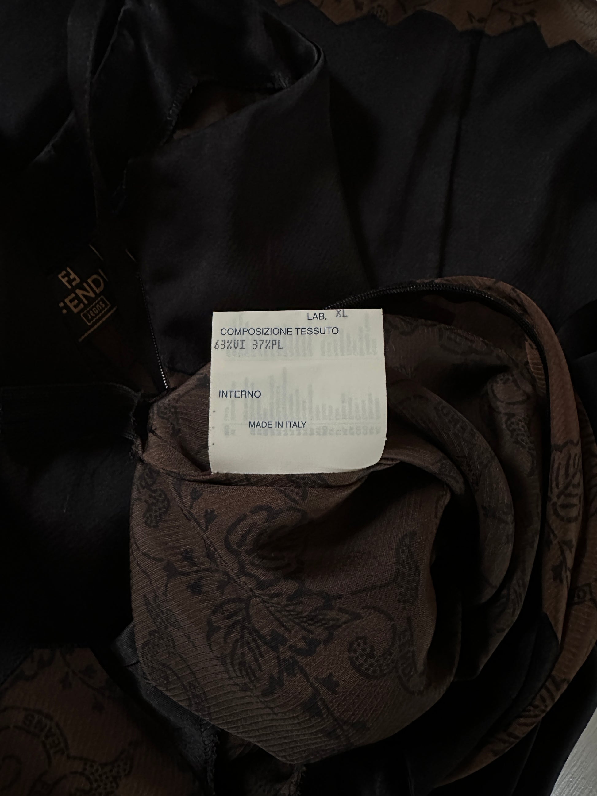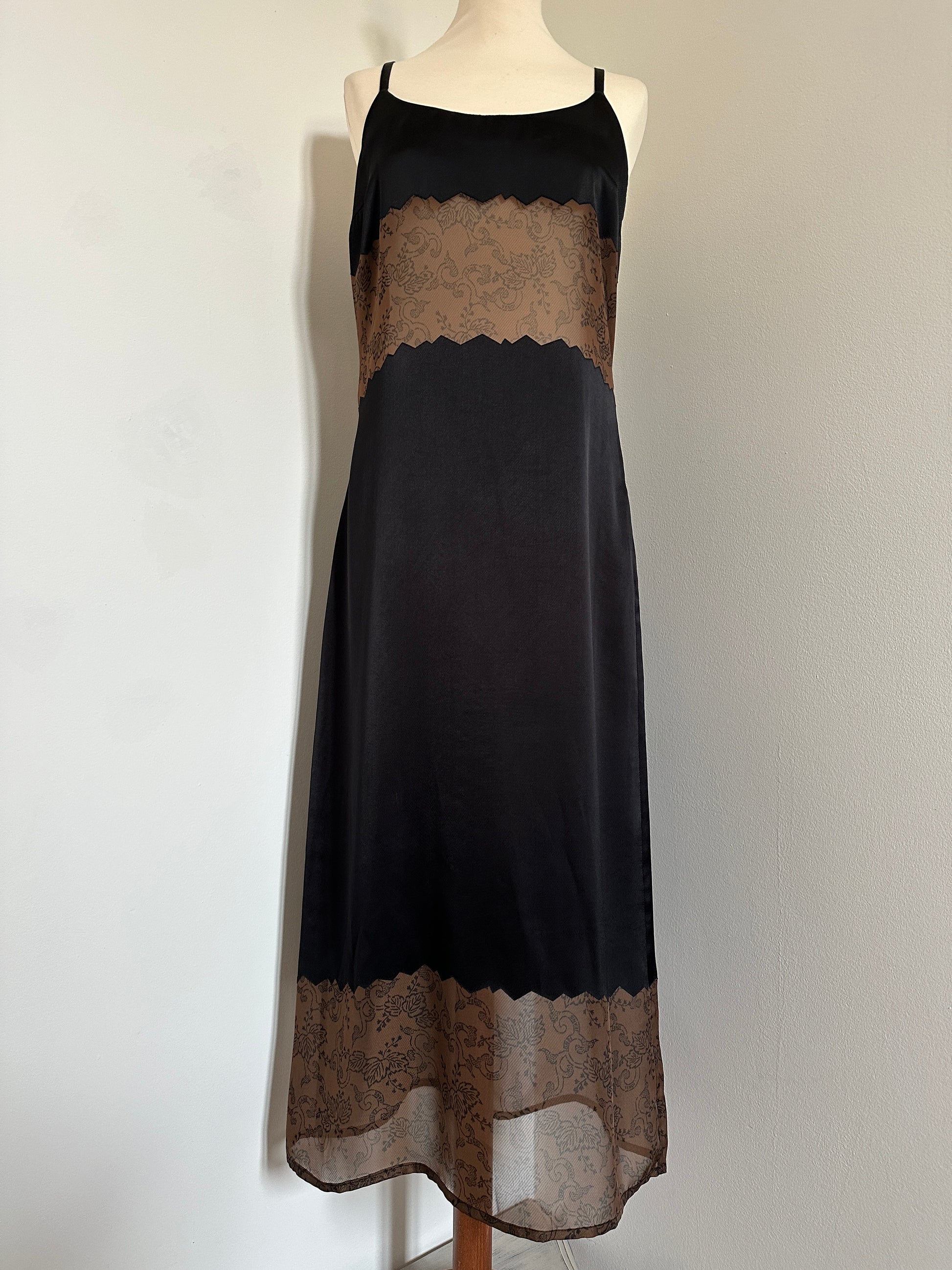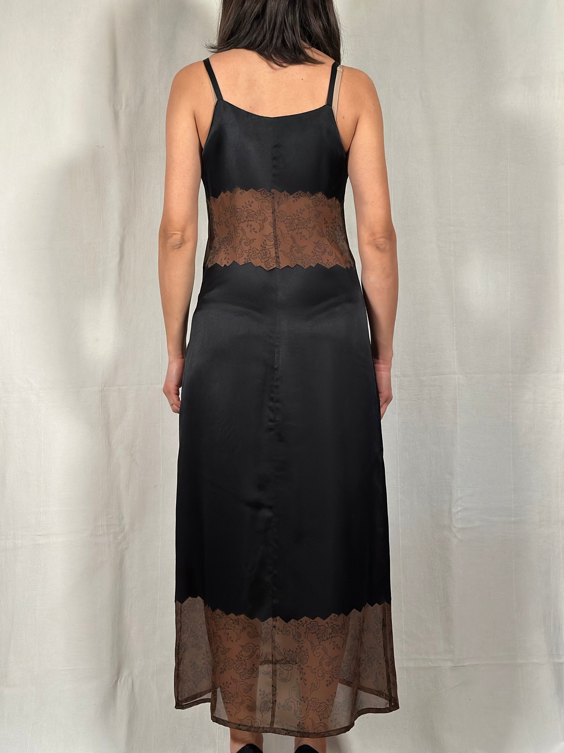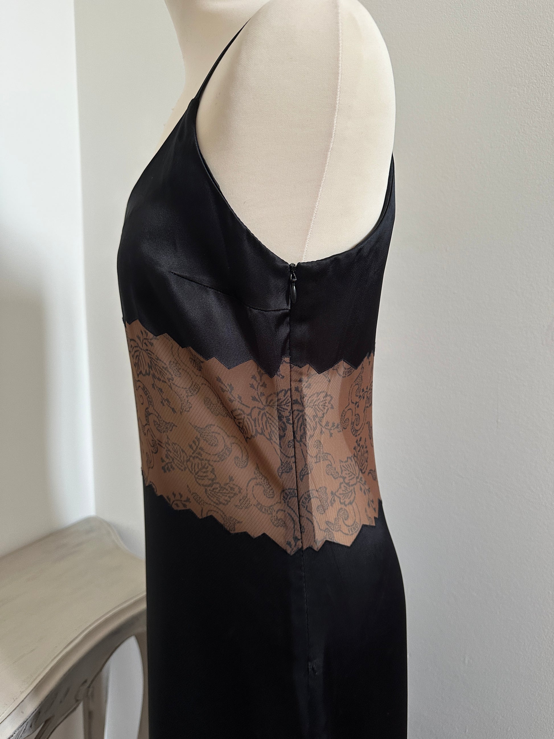 Abito modello slip dress firmato Fendi, linea Fendi Jeans, in raso nero con particolari inserti frastagliati semi trasparenti color marrone con disegni di vegetazione.