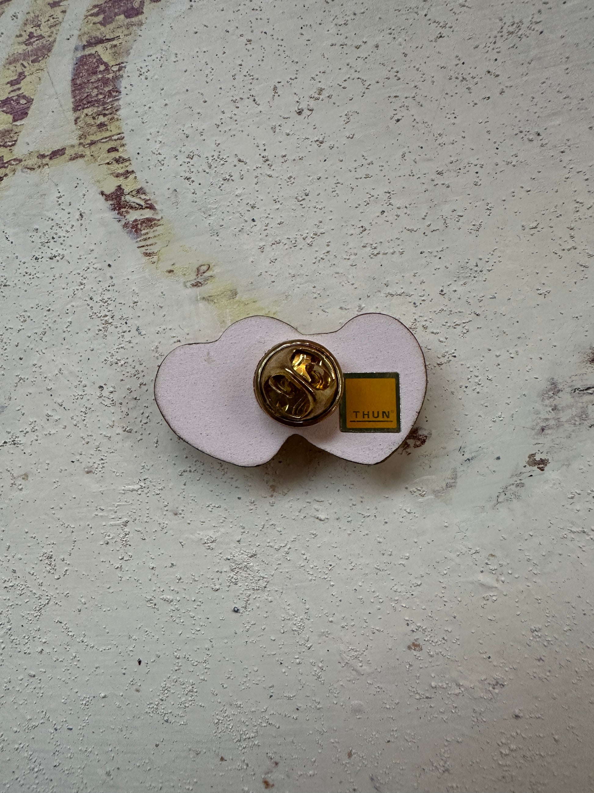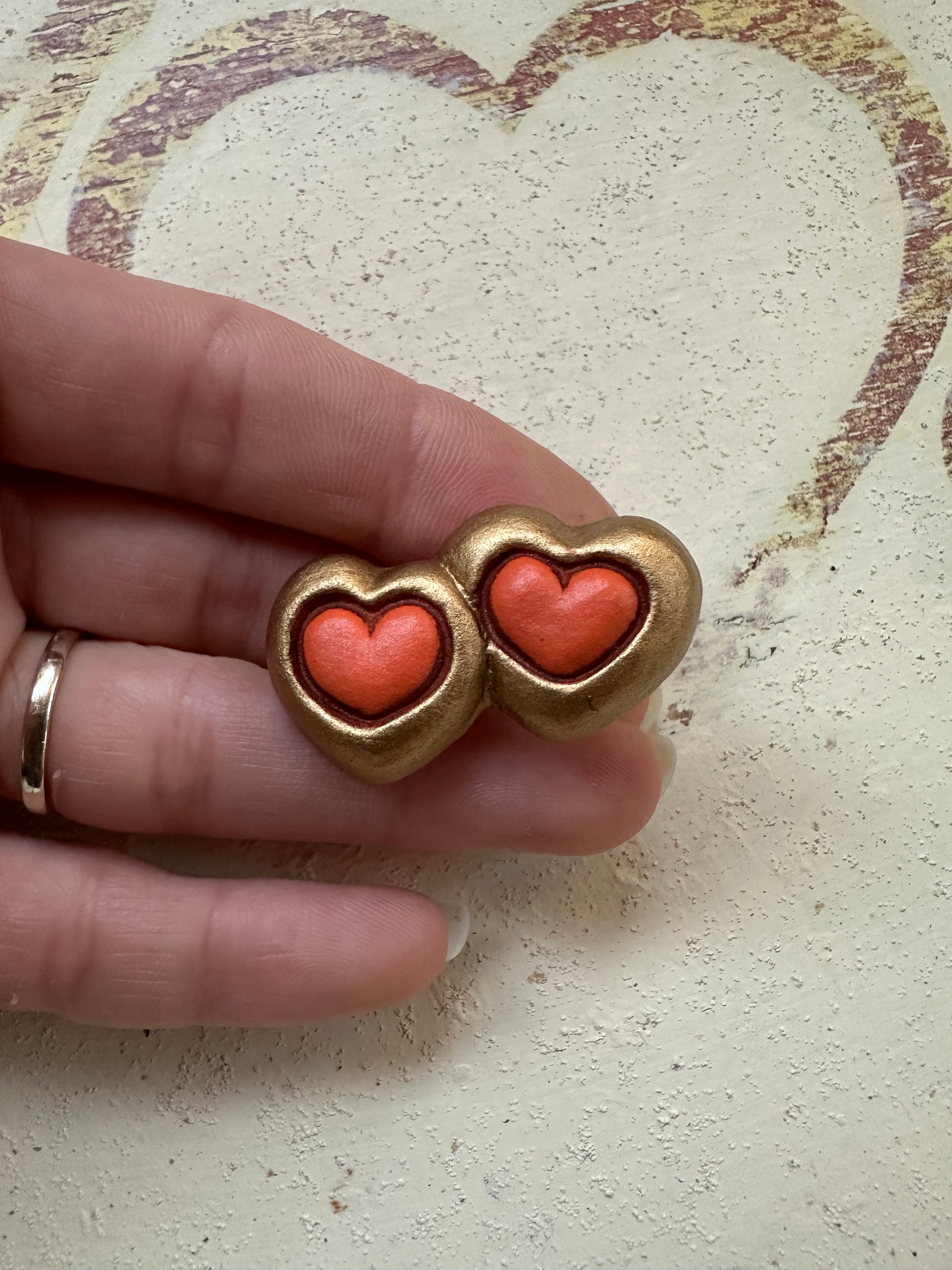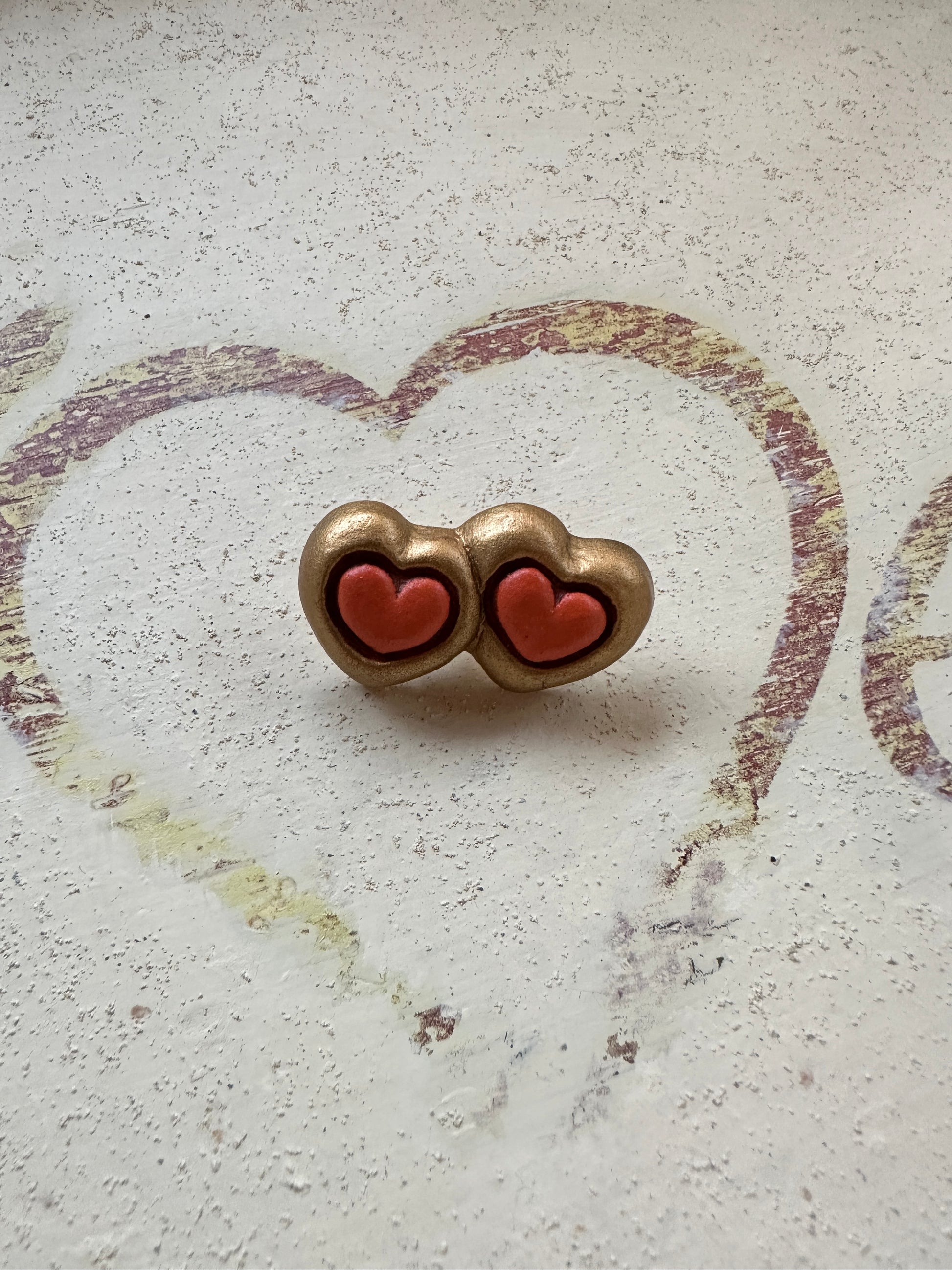 Deliziosa spilla di Thun anni 2000 realizzata nella loro classica ceramica dipinta a mano, formata da due cuori dorati con il centro color pesca.